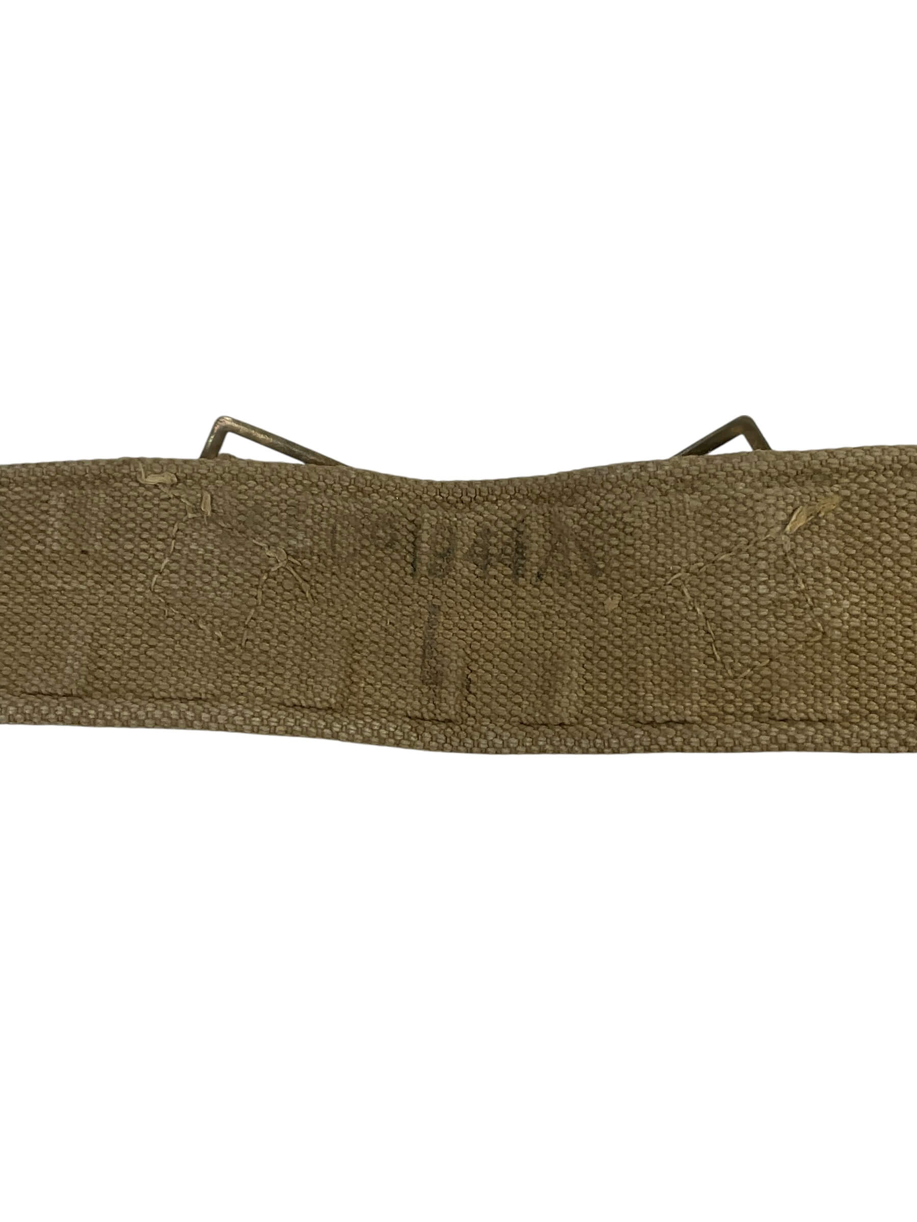 The WW2 British P37 Web Belt 1944 Dated Broad Arrowed is an original component of the Pattern 1937 web equipment issued to British and Commonwealth forces during the Second World War. Constructed from durable cotton webbing, the belt features an adjustable length and a metal buckle, providing secure fastening for a variety of pouches and accessories. This example is clearly stamped with the 1944 production date and displays the broad arrow mark, indicating official British military property. The Pattern 1937 web belt was designed for versatility and ease of use, supporting essential field gear such as ammunition pouches, water bottles, and bayonets. Its adoption reflected standardization efforts in British equipment during the conflict. The belt exemplifies typical wartime manufacture, with sturdy stitching and functional design suited for the rigors of military service. The original markings and construction date provide historical context, identifying its period of issue and authenticity as a wartime artifact.