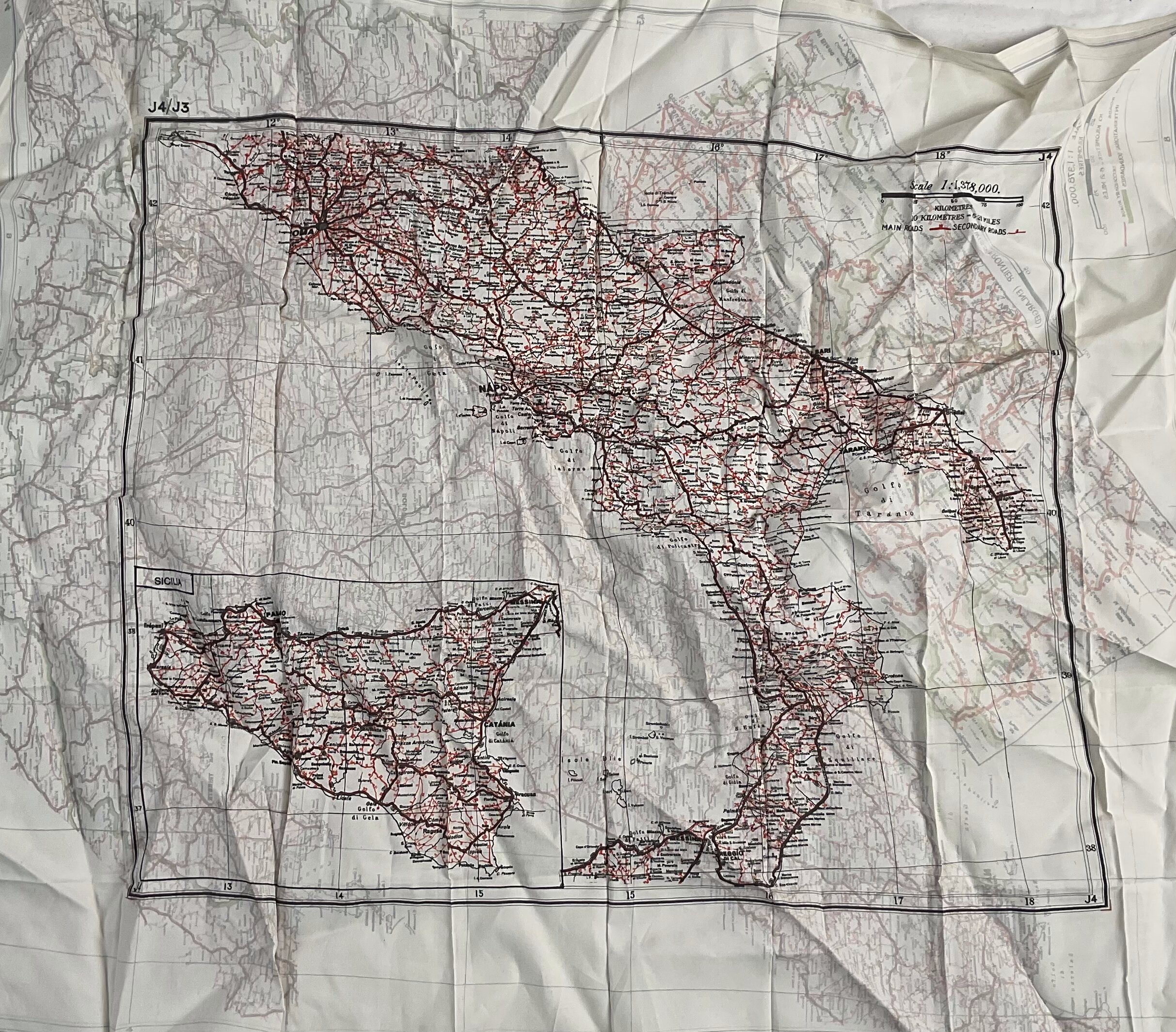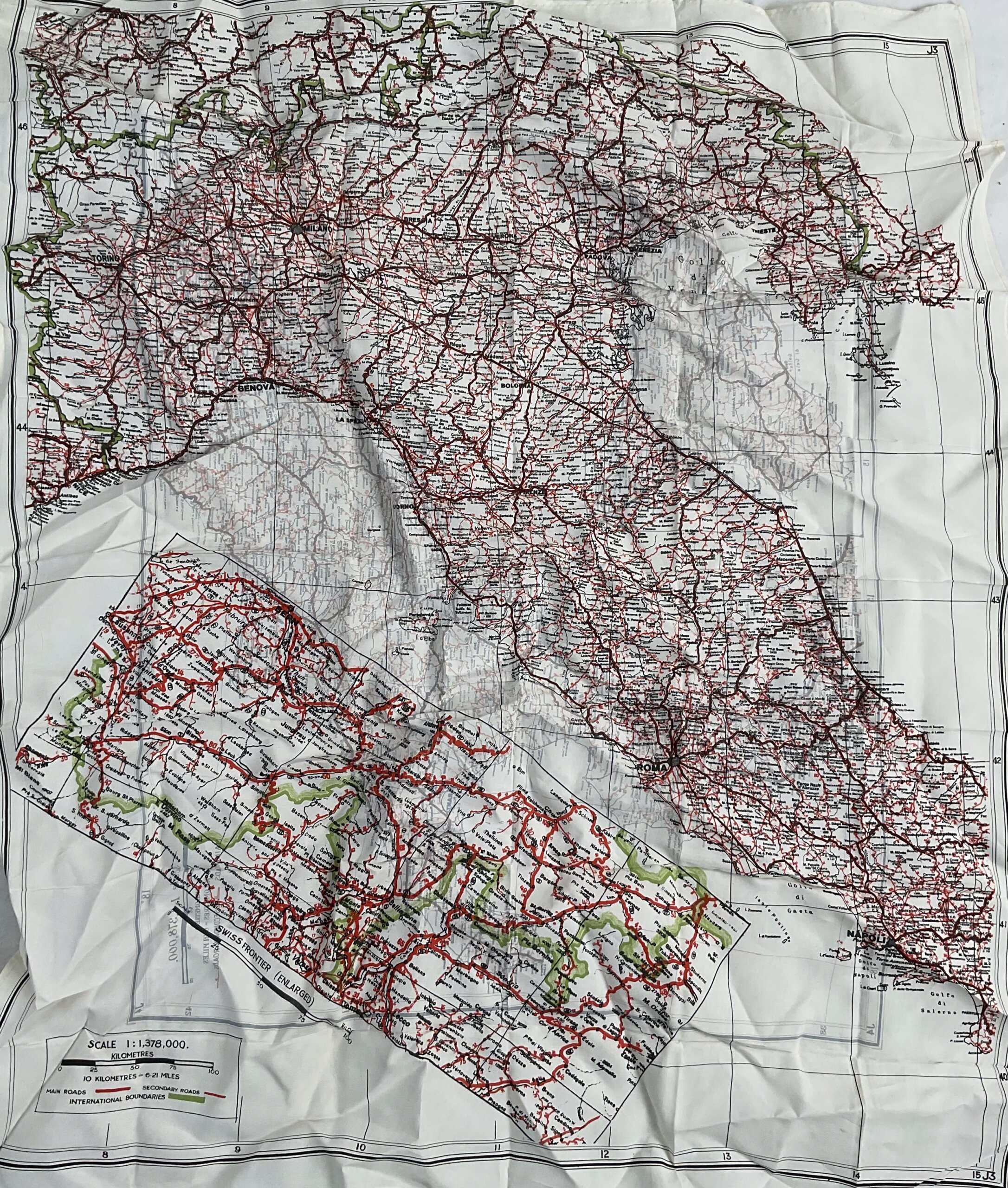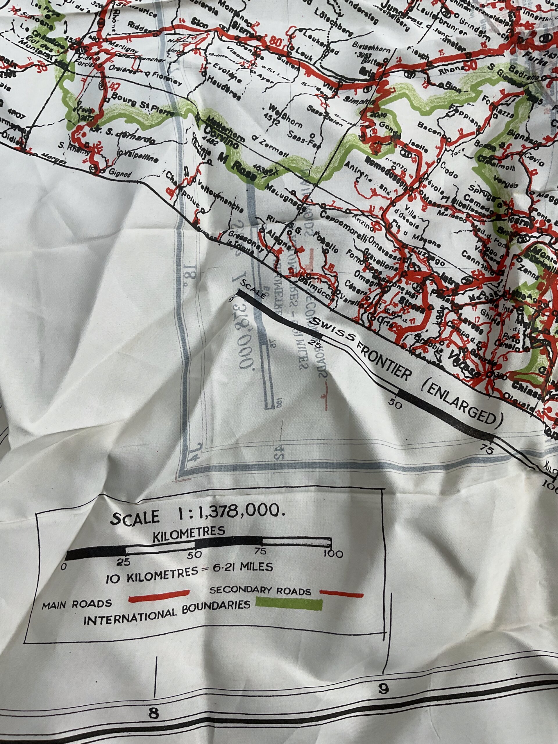 The WW2 British RAF J3/J4 Escape Map measures 26 inches by 20 1/2 inches and was produced for use by Royal Air Force personnel during the Second World War. Such escape maps were issued as part of survival kits to aircrew members operating in enemy territory. The J3/J4 designation refers to the specific map series covering particular regions relevant to British military operations. These
