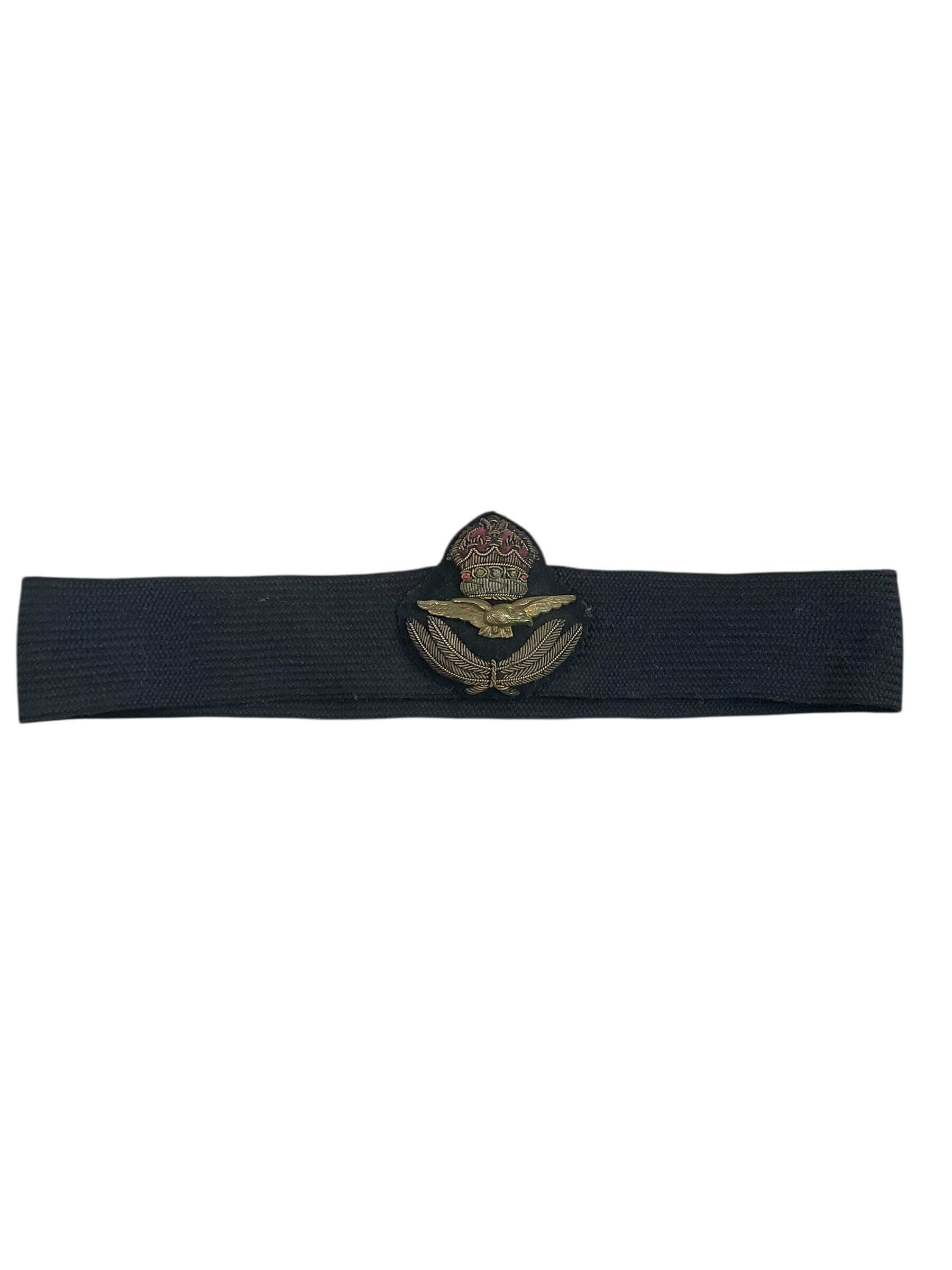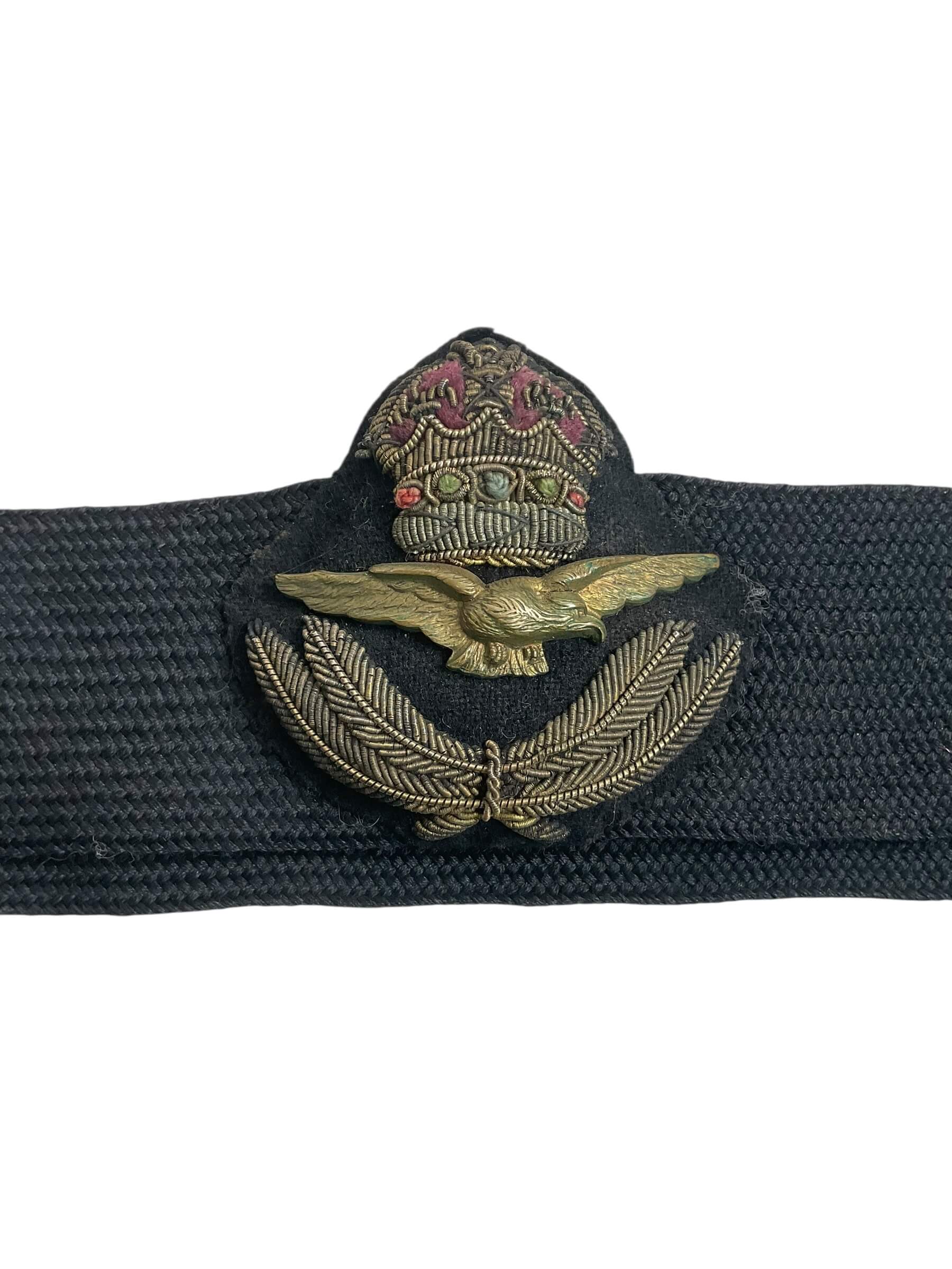The WW2 British RAF Officers Cap Badge with Band is an authentic example of the insignia worn by commissioned officers in the Royal Air Force during the Second World War. This badge consists of a finely detailed brass and gilt metal emblem featuring a central eagle beneath a King’s crown, surrounded by a laurel wreath. The cap badge is accompanied by its original dark blue wool band, which was worn on the peaked service cap as part of the standard RAF officer’s dress uniform. The construction reflects wartime quality and official patterns of British military headgear insignia. Measuring approximately 6 x 5 cm, the badge includes a firm backing for attachment. Such items were used for formal identification and rank distinction throughout RAF service branches during the 1939-1945 period. This cap badge and band represent an important detail of British military attire from the era of World War Two.