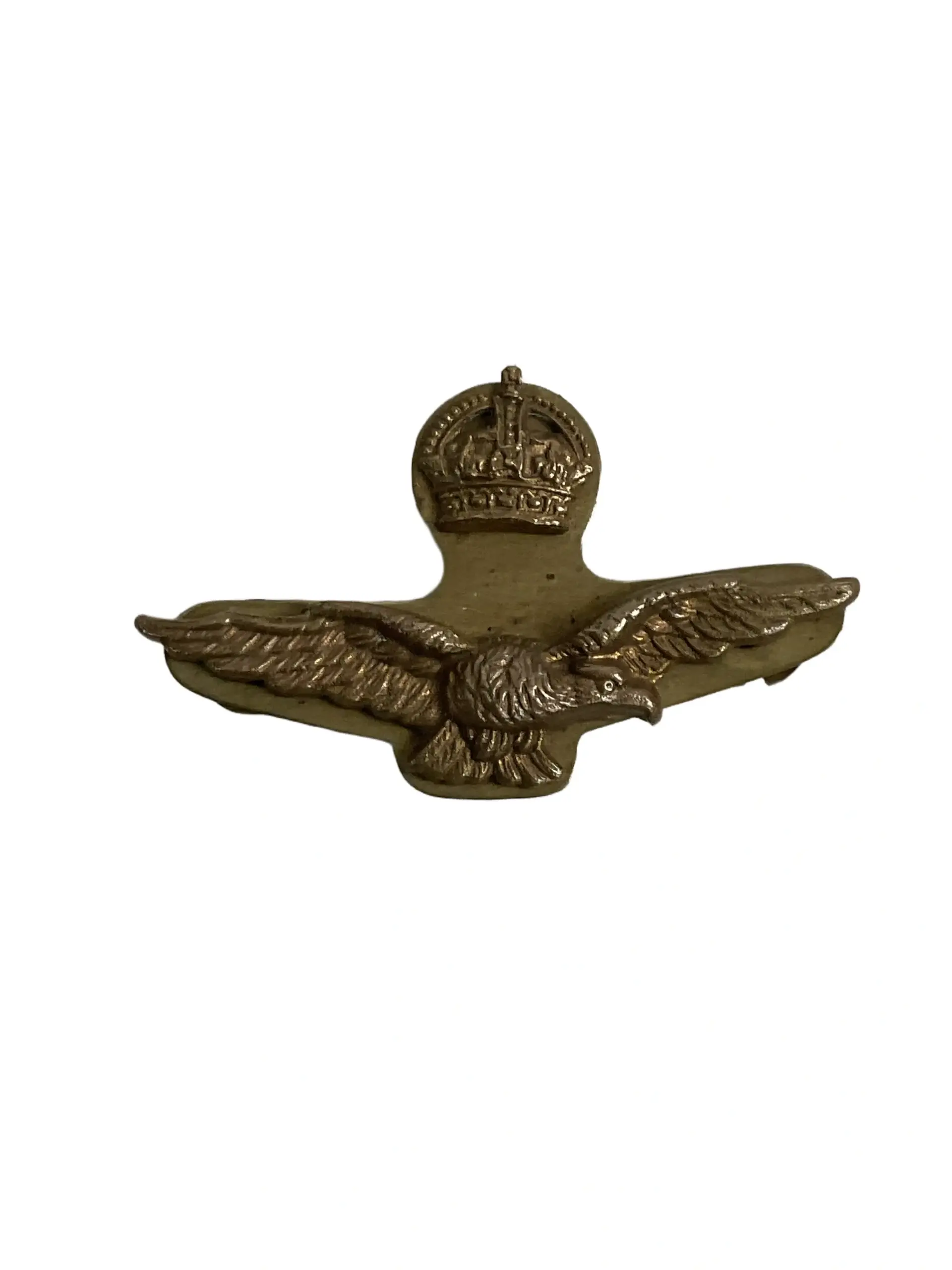 The WW2 British RAF Officers Wedge Cap Badge was an essential element of Royal Air Force officer uniform during the Second World War. Typically affixed to the side of the wedge or “side” cap, this badge features the insignia of the RAF—a laurel wreath encircling the letters “RAF,” surmounted by the King’s Crown. Constructed from metal, often with a gilt or brass finish, these badges were manufactured to specific military standards. Their distinct design served both to identify an individual’s service branch and to denote officer status within the RAF. The badge generally measures approximately 4 to 5 cm in height and is fitted with lugs or pins to secure it to the cap. Items such as this played a notable role in maintaining discipline and unity of appearance among personnel. This artifact remains representative of British military insignia from the 1939–1945 period.