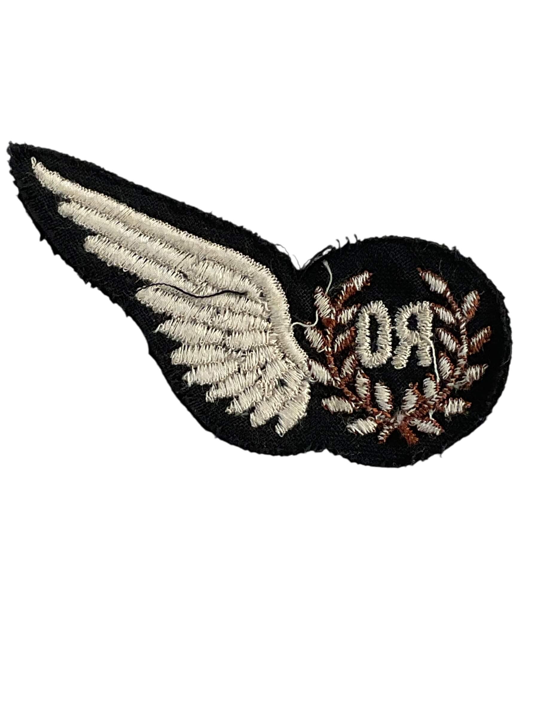 The WW2 British RAF Radio Operator Wing is an officially issued cloth insignia awarded to qualified wireless operators in the Royal Air Force during the Second World War. The distinctive design features a single, outstretched wing extending from a central circlet bearing the letters “RO,” an abbreviation for Radio Operator, embroidered in white thread. The circlet is often surrounded by a laurel wreath, symbolizing achievement