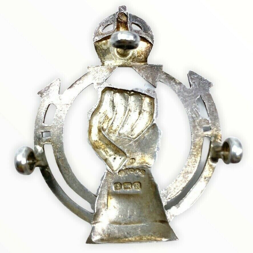 WW2 British Royal Armoured Corps Sterling Hallmarked Officers Cap Badge 1941 complete with three lugs on the back and maker marked JR Gaunt and Son on the back