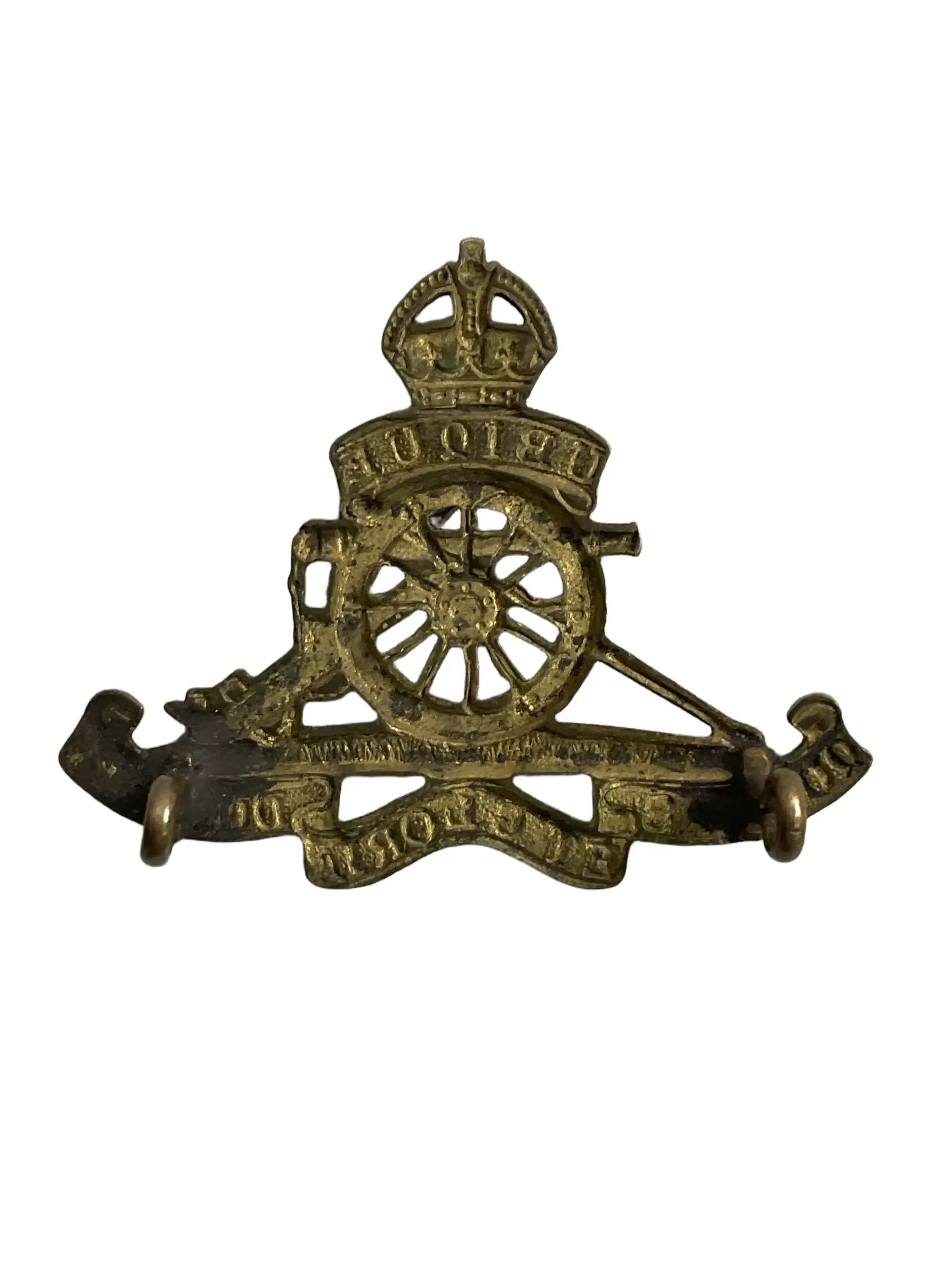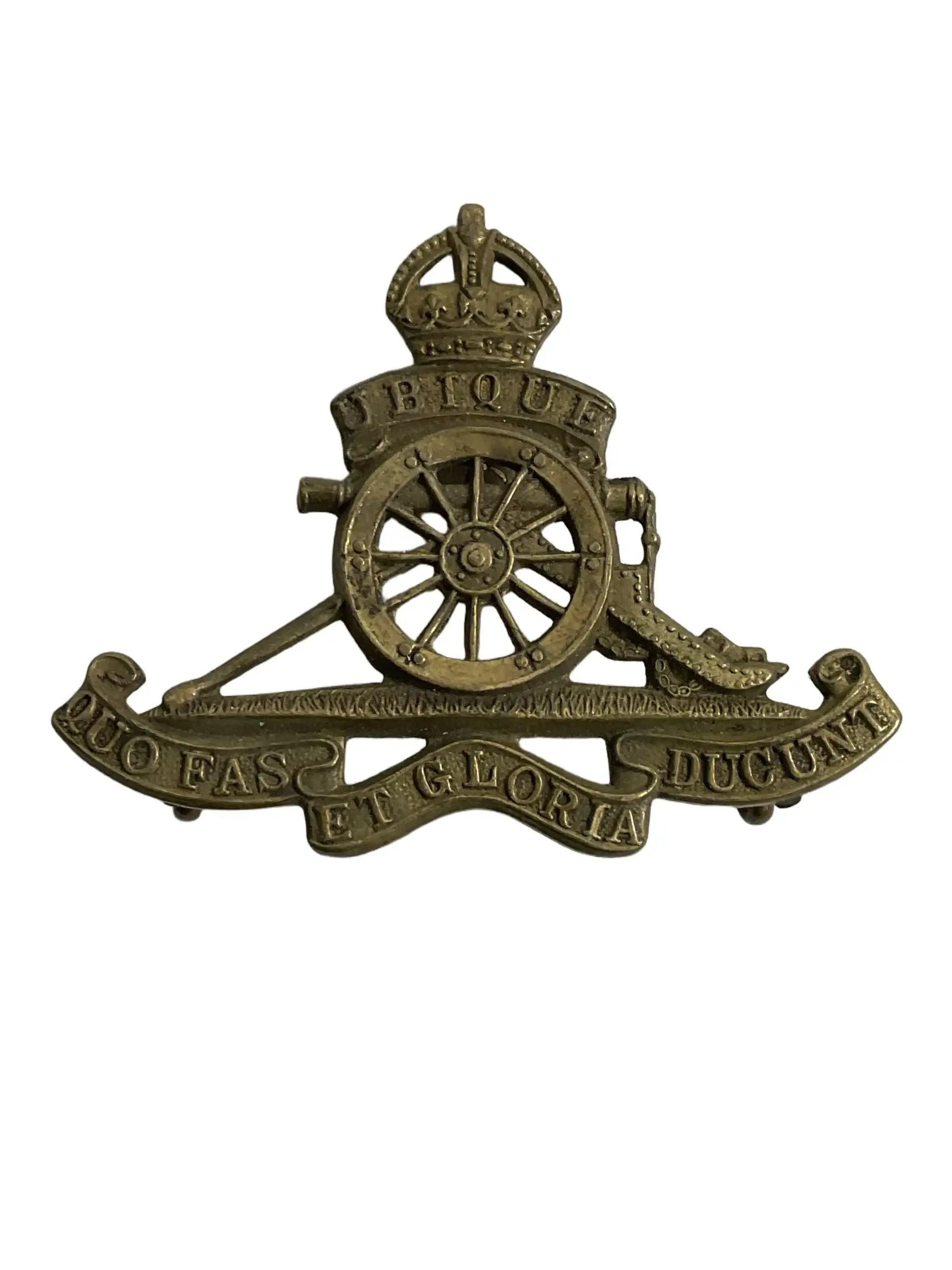 The WW2 British Royal Artillery Beret Badge is an insignia worn by members of the Royal Artillery during the Second World War. The design typically features a brass or bi-metal construction with a detailed depiction of a field gun surmounted by a crown and the regimental motto, “Ubique” (meaning “Everywhere”) and “Quo Fas Et Gloria Ducunt” (“Where Right