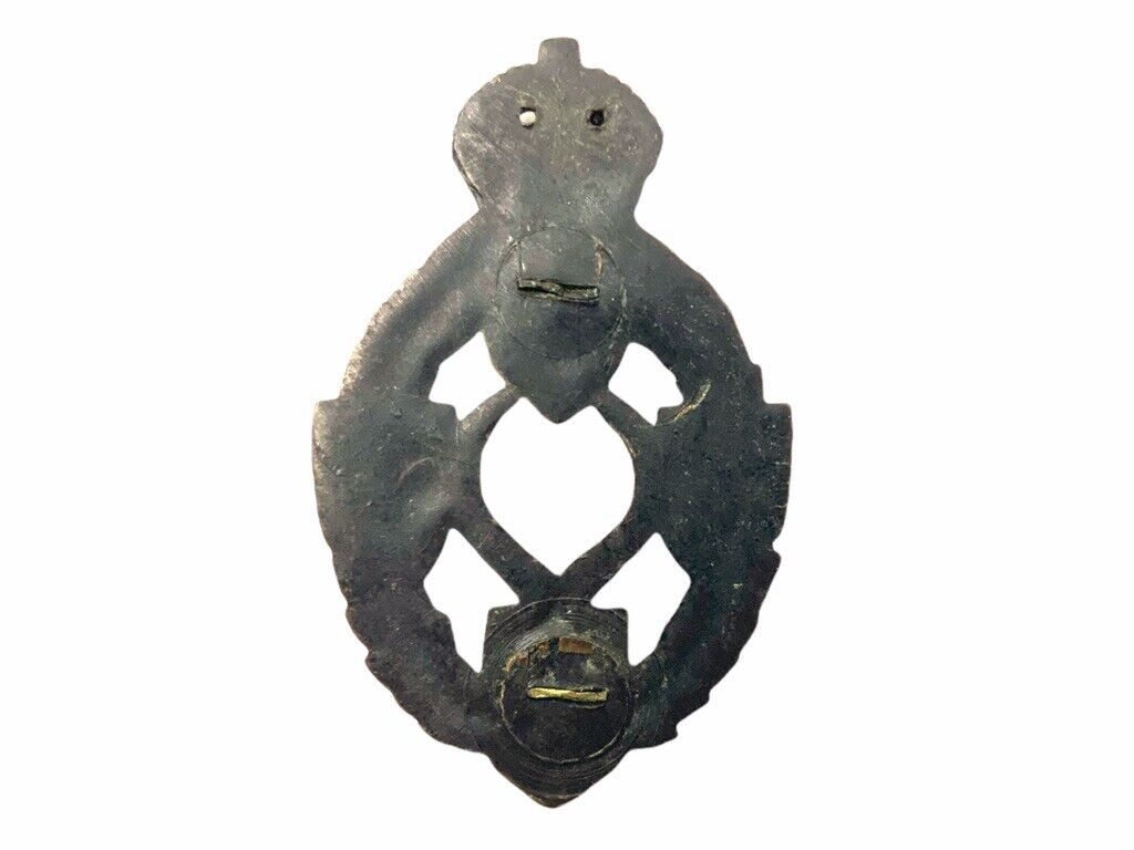 The WWII British Royal Electrical Mechanical Engineers (REME) Plastic Economy Cap Badge is a unique and historical artifact from the Second World War. During the war, metal was in high demand for the production of munitions and other essential goods, leading to the innovative use of alternative materials such as plastic for military insignia. This particular cap badge, designed for the Royal Electrical Mechanical Engineers, embodies this resourcefulness. The badge showcases the REME’s distinctive insignia with intricate detailing, despite being fashioned from plastic. It served a dual purpose of representing the corps and contributing to the war economy by conserving metal. Collectors and historians regard this cap badge as a tangible piece of military history, reflecting the ingenuity and adaptive strategies of the time. Its preservation today offers a glimpse into the wartime efforts and the crucial role of the REME in maintaining and repairing the mechanical equipment of the British Army.