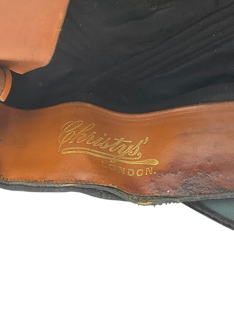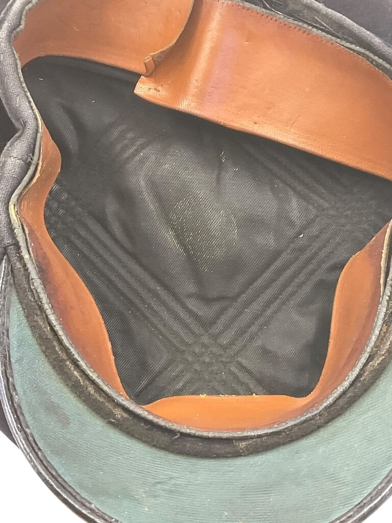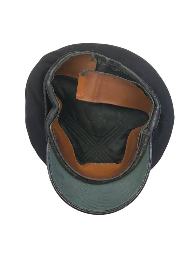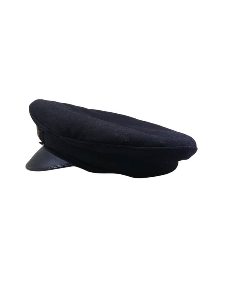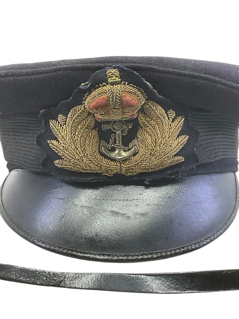 This WW2 British Royal Navy Officers Peak Cap Hat Size 7 1/4 is a remarkable piece of military memorabilia. Crafted with meticulous attention to detail, this cap is an authentic replica of those worn by officers in the British Royal Navy during World War II. Made from high-quality materials, it features a rich navy blue color and a black leather chin strap. The bullion Royal Navy emblem is prominently displayed, providing a striking contrast. Its size 7 1/4 ensures a comfortable fit for most adults. This cap also comes with a black visor and peak, boasting the traditional scrambled egg decoration. This hat is not only a significant collectible item for history enthusiasts but also an impressive display piece, marking a pivotal period in British naval history. Complete with chin strap but missing the side buttons.