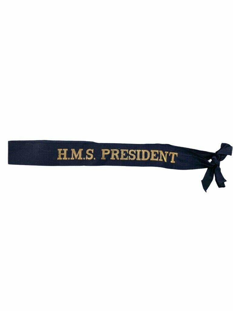 The ‘WW2 British Royal Navy RN HMS President Cap Tally’ is a remarkable piece of naval history, commemorating the distinguished service of the HMS President during World War II. This authentic cap tally is a black ribbon featuring gold embroidered lettering, proudly bearing the ship’s name. The HMS President served as a shore establishment and played a crucial role in the administrative and training functions for the Royal Navy during the war. An emblem of dedication and bravery, this cap tally would have been worn by naval personnel as part of their uniform, signifying their affiliation with the HMS President. Collectors and history enthusiasts alike would appreciate the craftsmanship and historical significance of this naval artifact. It not only serves as a fascinating memento of the sacrifices and heroism of the sailors but also as a tangible connection to the legacy of the Royal Navy’s wartime efforts.