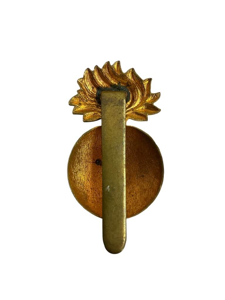 This item is a WW2 British Royal Northumberland Fusiliers Officers Cap Badge – an authentic artefact from the Second World War era. This emblem, often worn by high-ranking officials of the Northumberland Fusiliers, is a symbol of honor, heritage, and duty. The badge features intricate details, such as the St. George’s cross and a lion, which are significant elements of the British Royal Coat of Arms. The presence of a crown at the top signifies the allegiance to the British monarch. Made from high-quality brass, it exhibits a distinctive shine, revealing its excellent condition despite its age. This badge is not just a piece of military memorabilia, but a historical artefact which reflects the bravery and commitment of the British Royal Northumberland Fusiliers during the most significant conflict of the 20th century.
