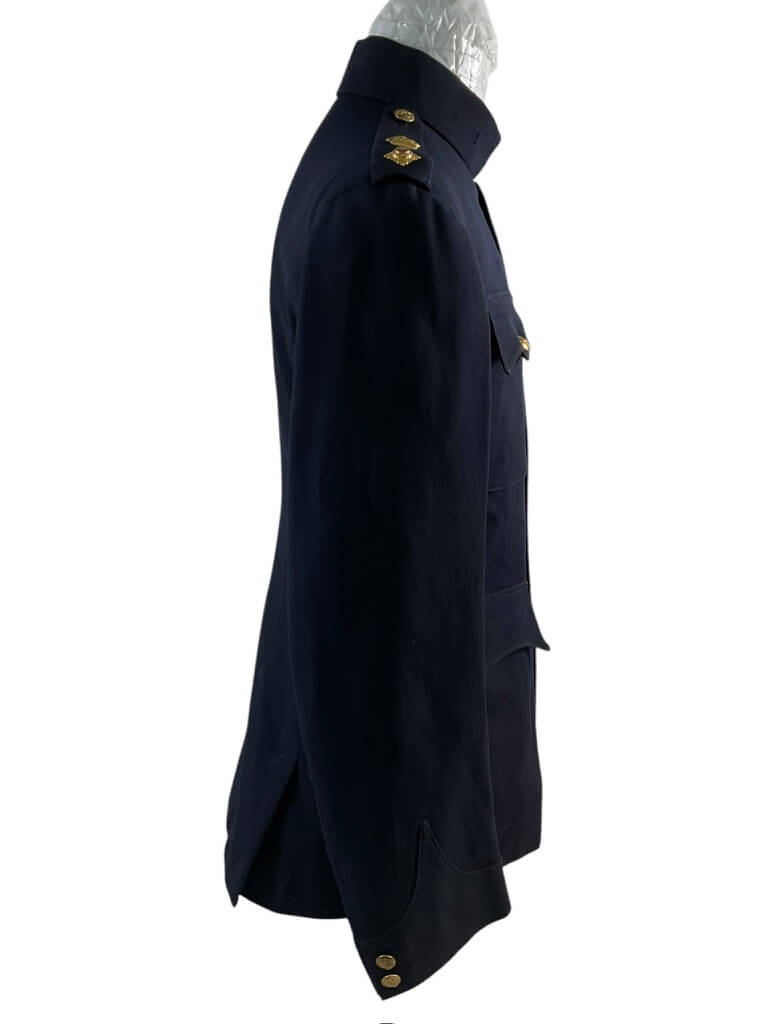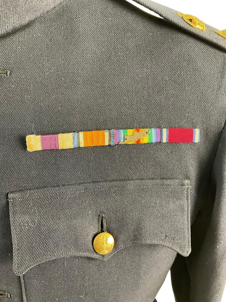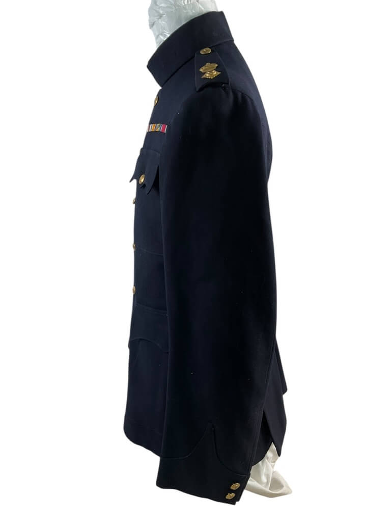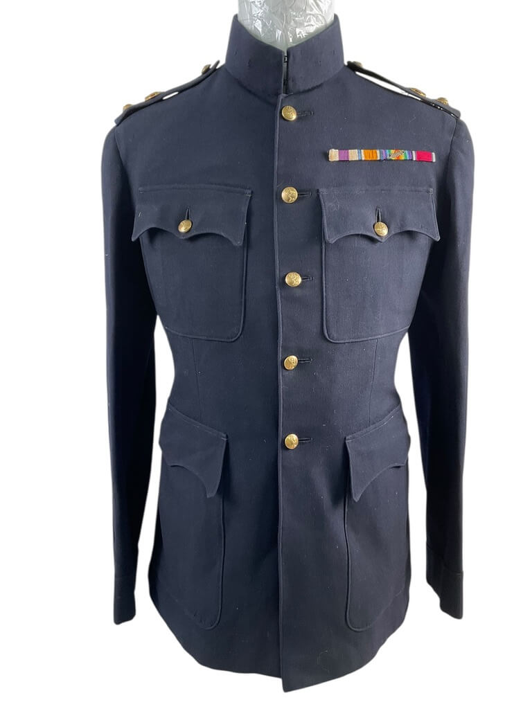 This is a World War II British Signals Corps Lieutenant Colonel’s patrol jacket, featuring a World War I ribbon bar. The jacket is tailored in dark green wool, following standard British Army officer patterns of the period. It has a stand-and-fall collar, epaulettes with Crown and Pip insignia indicating the rank of Lieutenant Colonel, and Corps-specific collar badges and brass buttons with the Royal Signals crest. The inclusion of a WW1 ribbon bar above the left breast pocket signifies that the original wearer served in both World Wars. The jacket typically displays pleated breast pockets and plain lower pockets, with a fitted waist and rear vents for comfort. Such jackets were worn for semi-formal duties, field inspections, and certain social occasions by officers. This item provides a representative example of the attire worn by senior Signals Corps officers during WWII and reflects the continuity of service between the two conflicts.
