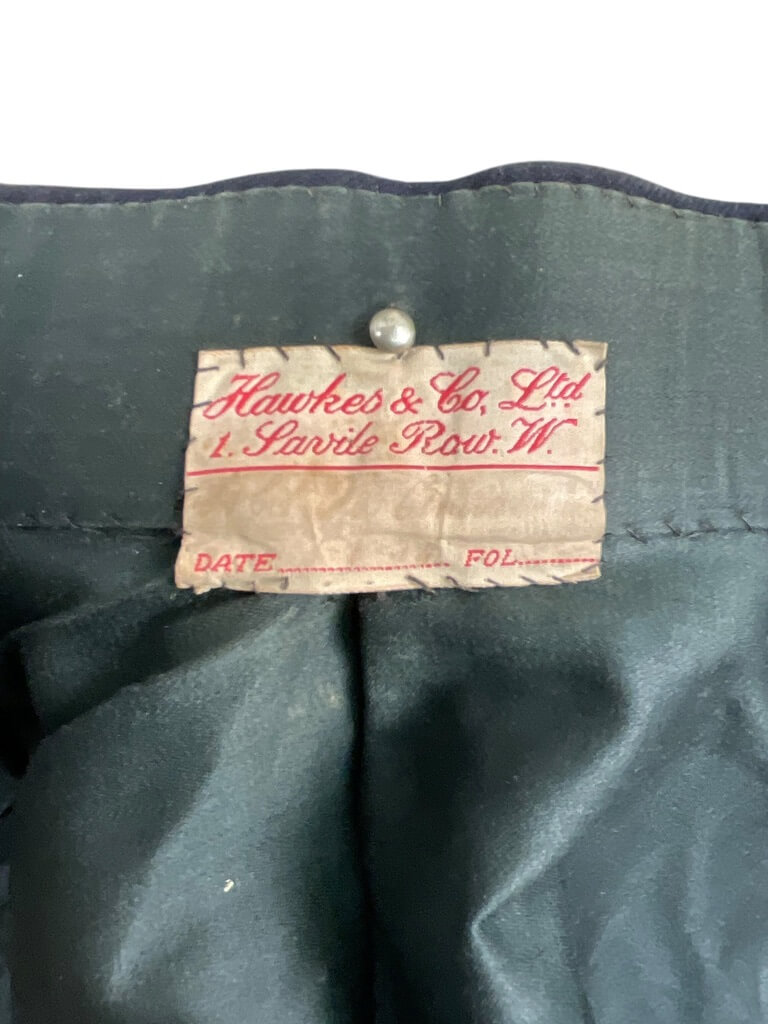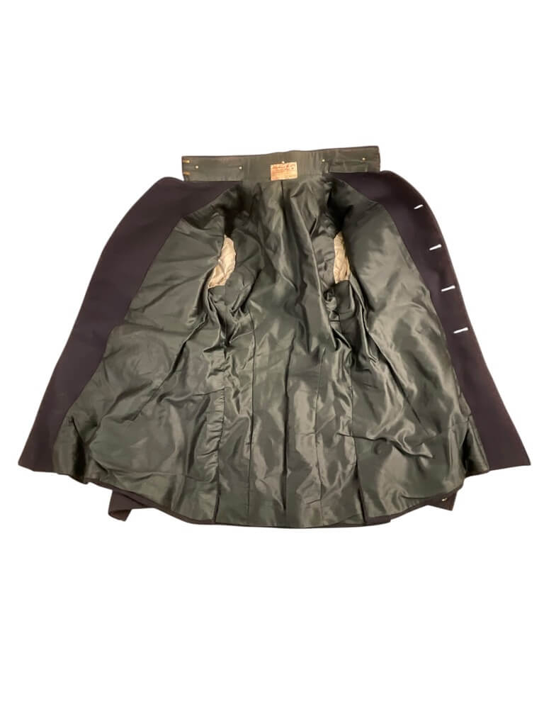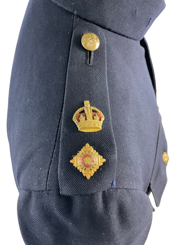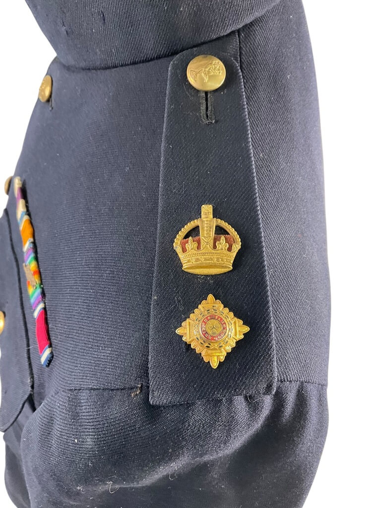 This is a World War II British Signals Corps Lieutenant Colonel’s patrol jacket, featuring a World War I ribbon bar. The jacket is tailored in dark green wool, following standard British Army officer patterns of the period. It has a stand-and-fall collar, epaulettes with Crown and Pip insignia indicating the rank of Lieutenant Colonel, and Corps-specific collar badges and brass buttons with the Royal Signals crest. The inclusion of a WW1 ribbon bar above the left breast pocket signifies that the original wearer served in both World Wars. The jacket typically displays pleated breast pockets and plain lower pockets, with a fitted waist and rear vents for comfort. Such jackets were worn for semi-formal duties, field inspections, and certain social occasions by officers. This item provides a representative example of the attire worn by senior Signals Corps officers during WWII and reflects the continuity of service between the two conflicts.