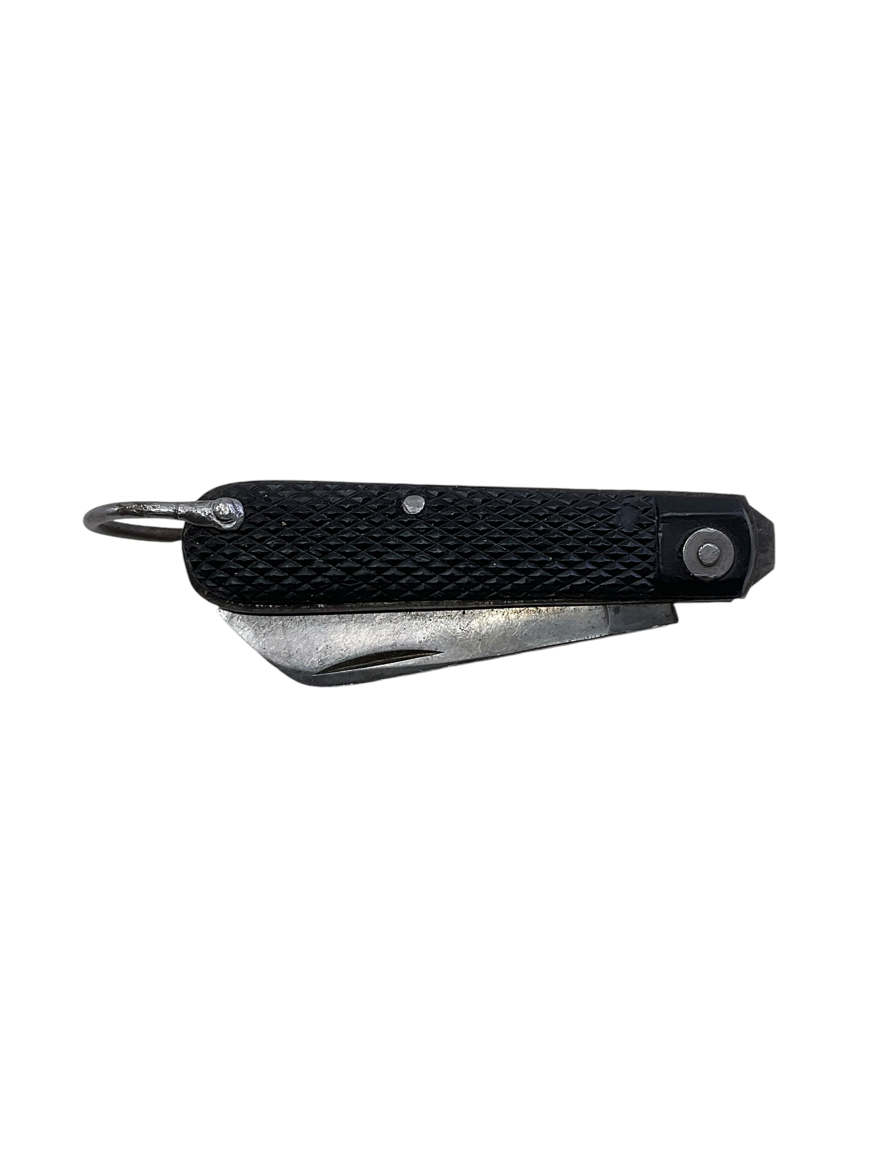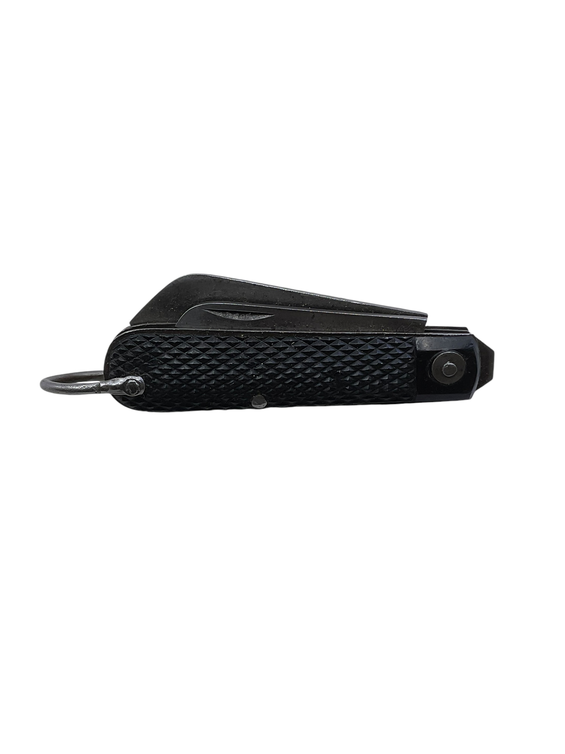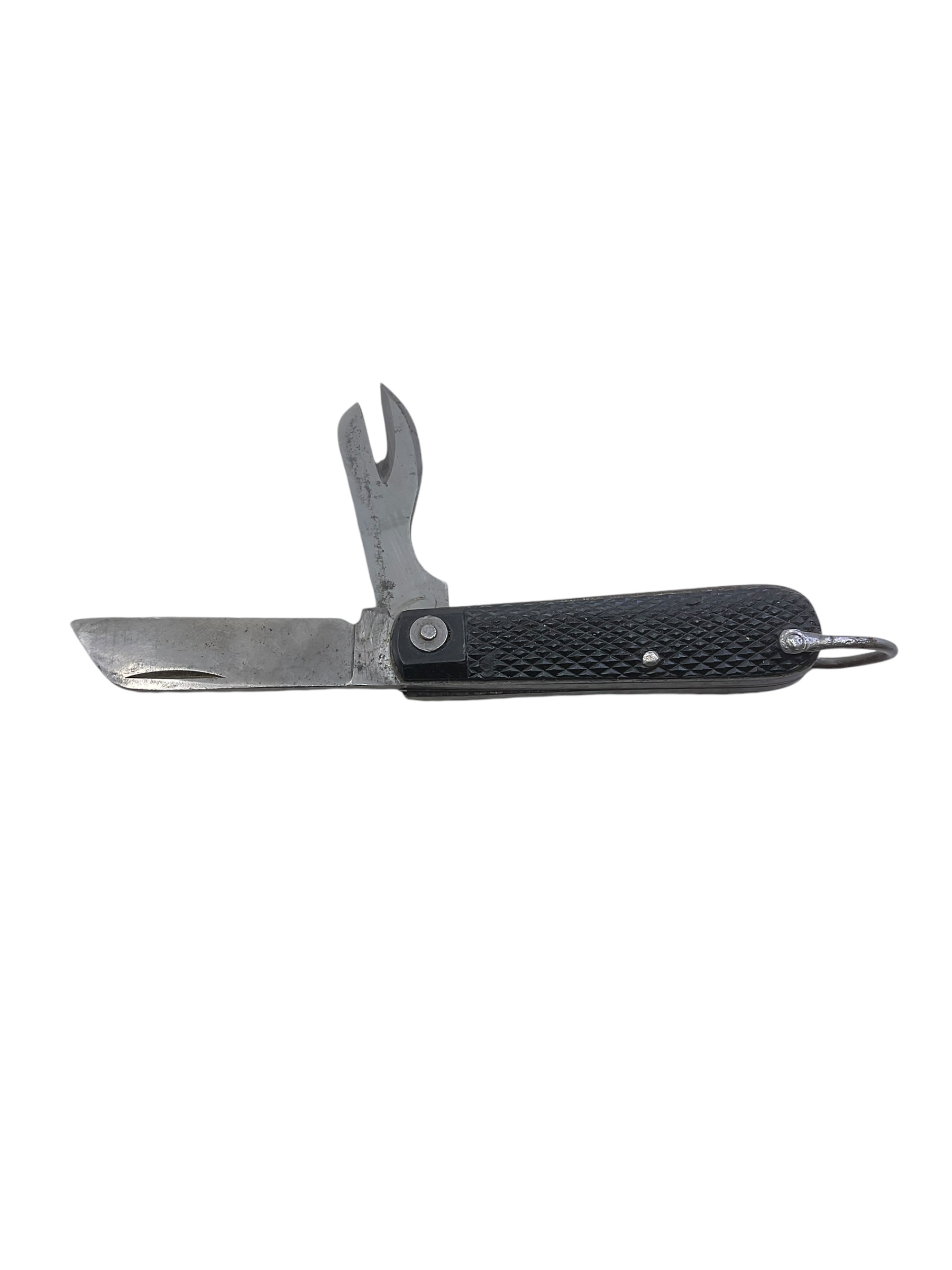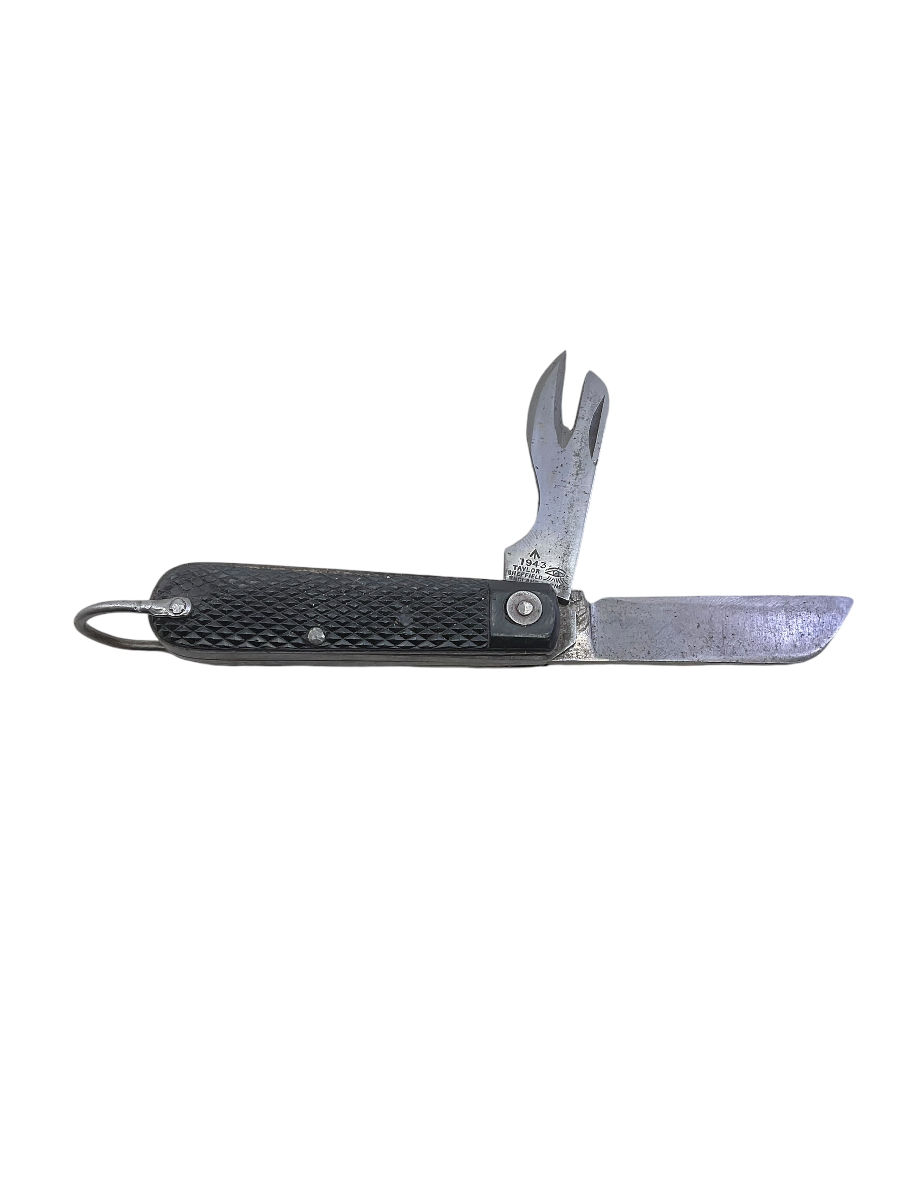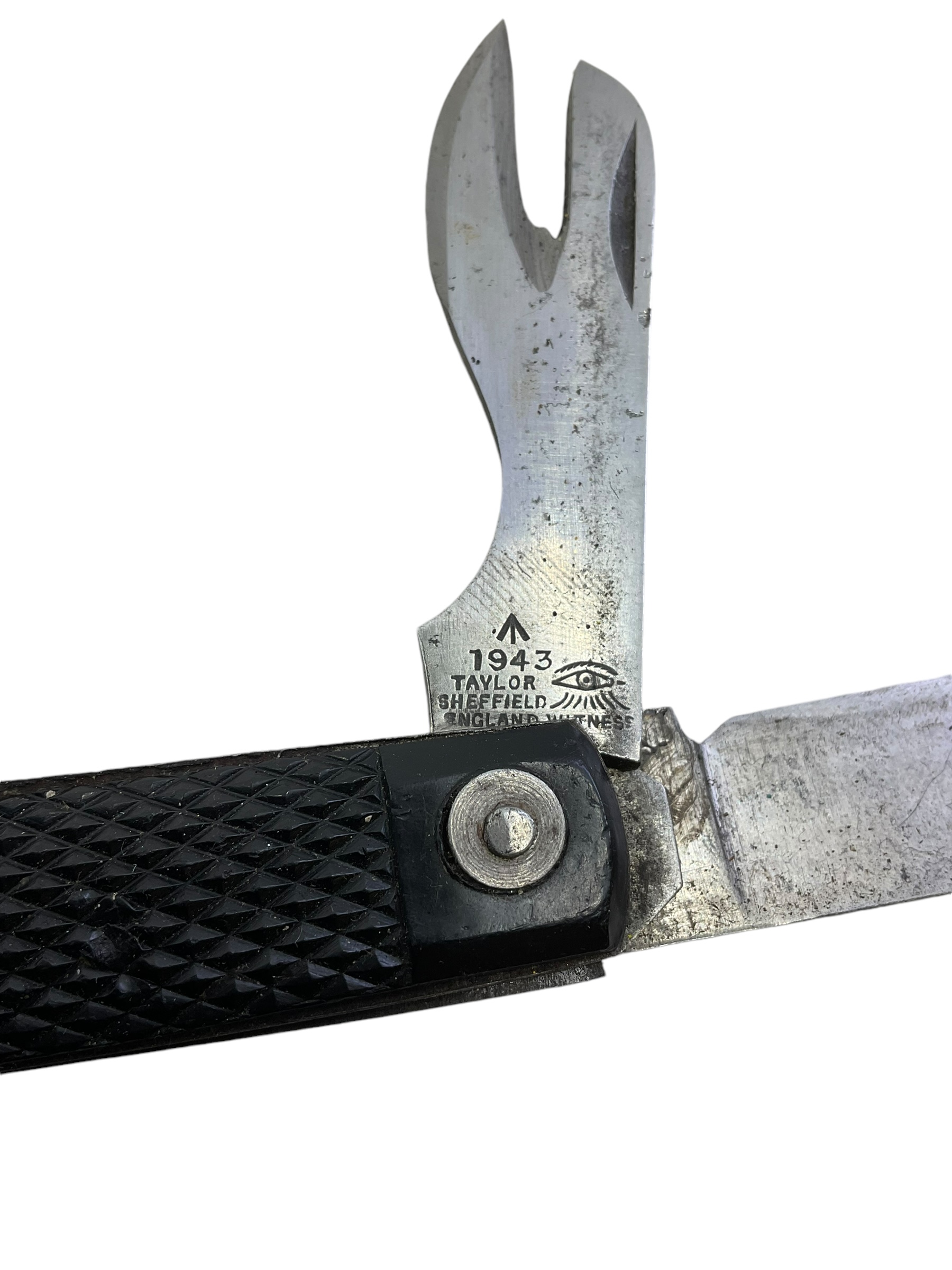 This artifact is a genuine World War 2 British Taylor Folding Knife, dated back to 1943. A significant piece of history, it bears the Broad Arrow mark, an emblem of British government ownership, often used on military equipment. The knife is designed with a single, folding blade and a can opener tool, a common feature in military-issued pocket knives during the time. Crafted with durability and practicality in mind, it served as an essential tool for British soldiers during the war. The knife’s construction features a solid metal body, designed to withstand the rigors of war. Its historical significance combined with its robust design makes it a great addition for collectors of WW2 memorabilia or military artifacts. This Taylor Folding Knife embodies the resilience and resourcefulness of British soldiers in one of the most challenging periods of human history.