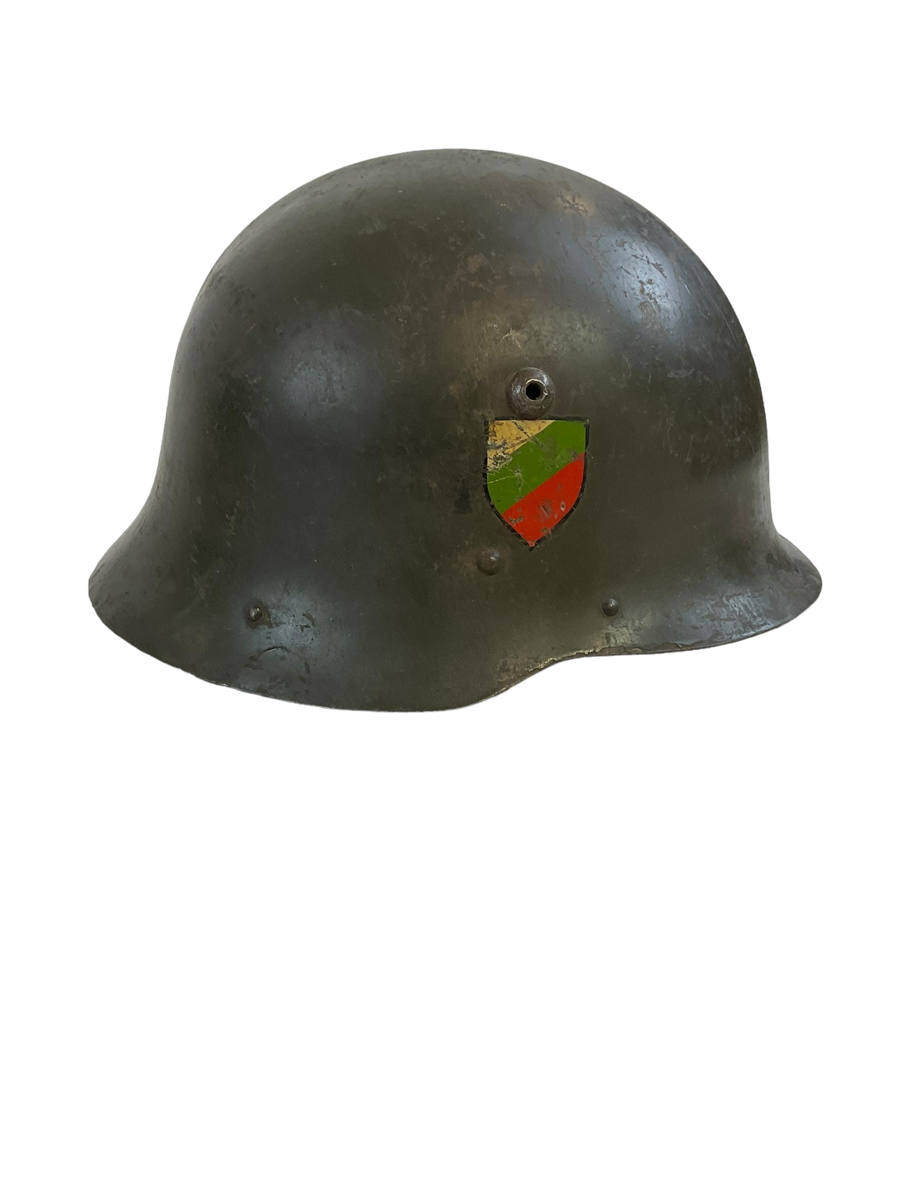 The WW2 Bulgarian Steel Helmet Type C with National Shield is a remarkable piece of military history, symbolizing the resilience and prowess of Bulgarian forces during the tumultuous period of World War II. Crafted from rugged steel, this helmet provided essential protection to Bulgarian soldiers in the heat of battle. Its design features a distinctive and robust structure, ensuring durability and comfort under the most challenging conditions. A key highlight of this helmet is the prominent display of the national shield, proudly emblazoned on the front. This emblem serves not only as a mark of patriotism but also as an identifier of the wearer’s allegiance and bravery. Collectors and historians alike will appreciate the helmet’s authentic design and the historical significance it carries, making it a treasured artifact that offers a glimpse into Bulgaria’s military heritage during one of the most significant global conflicts.