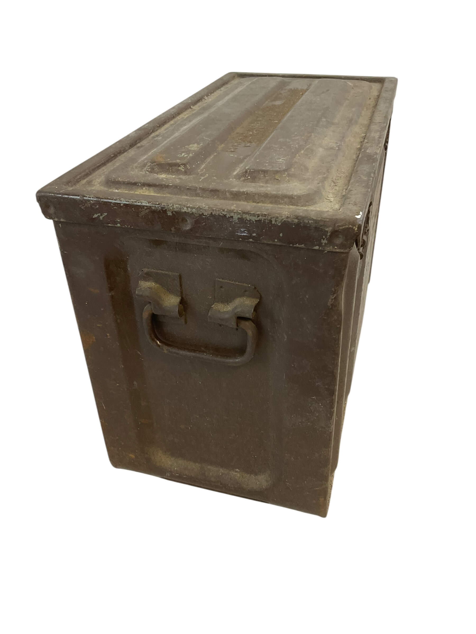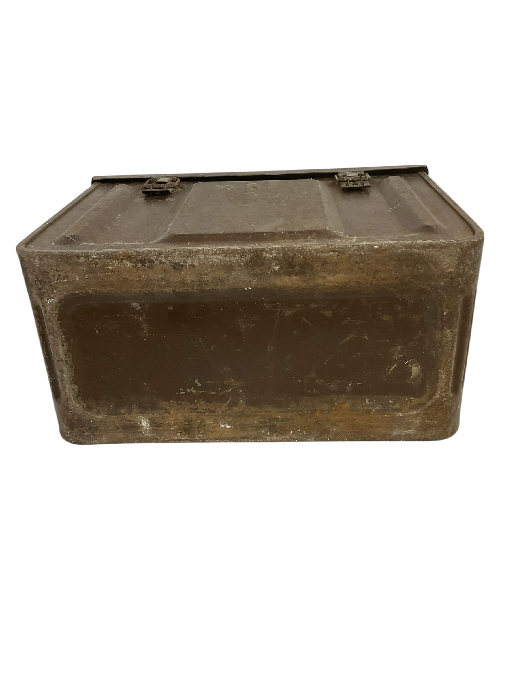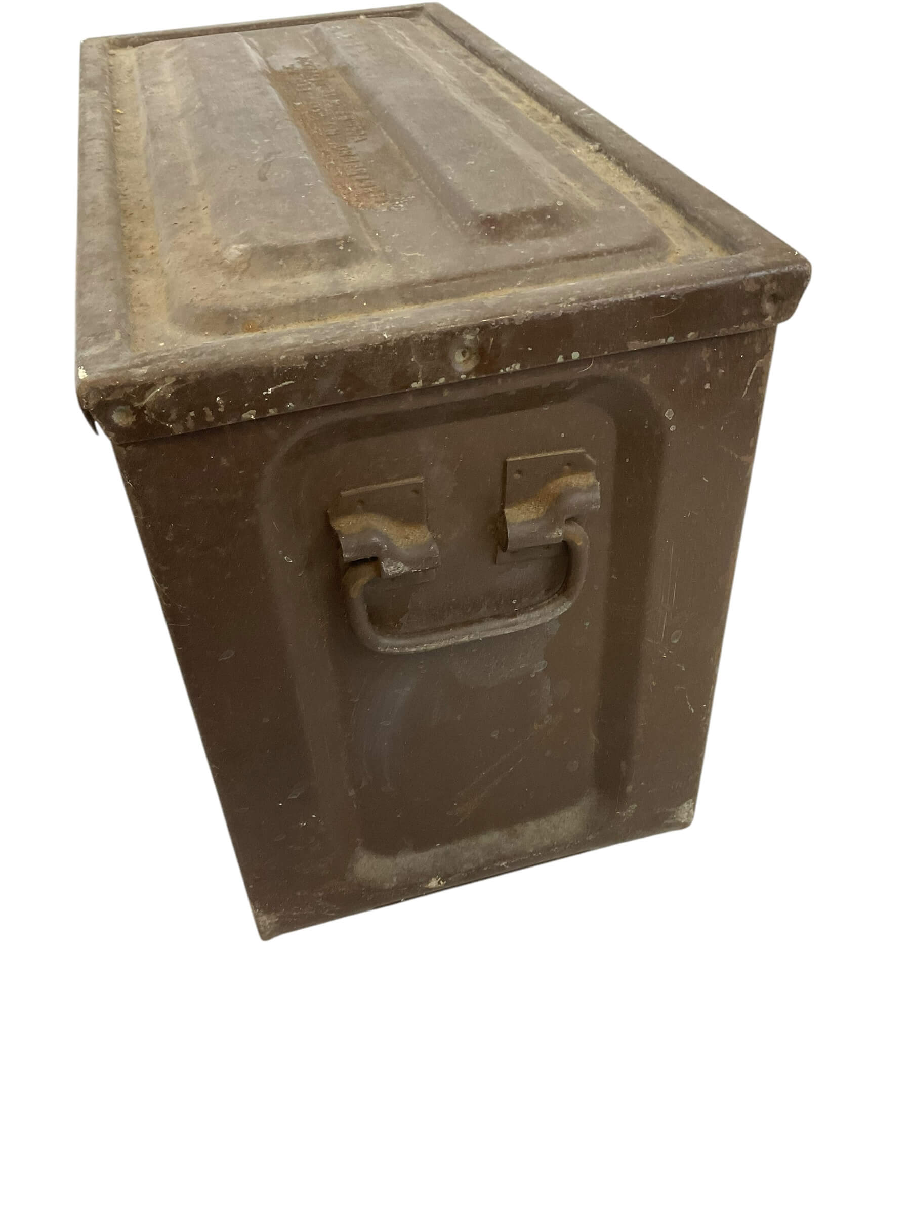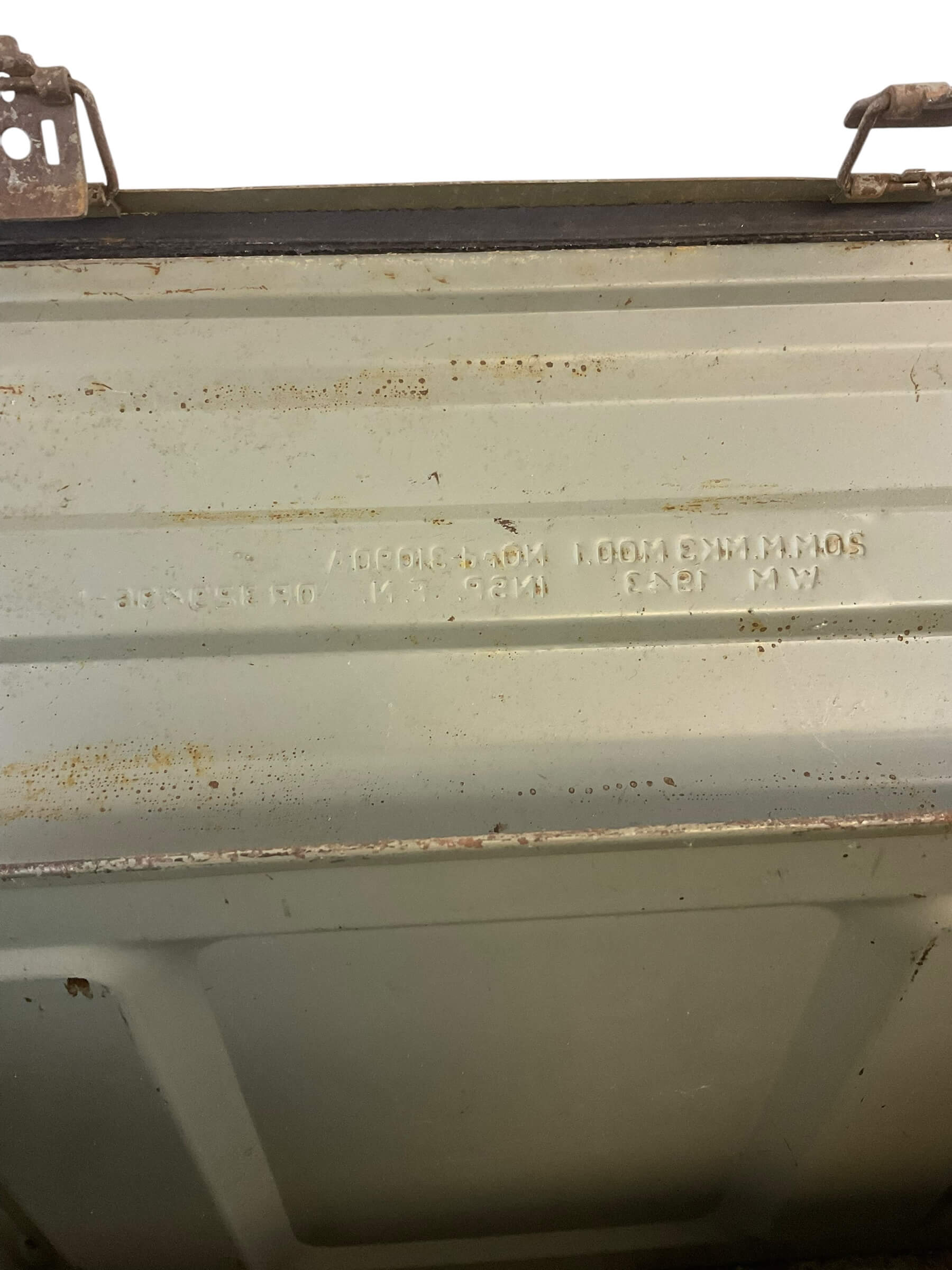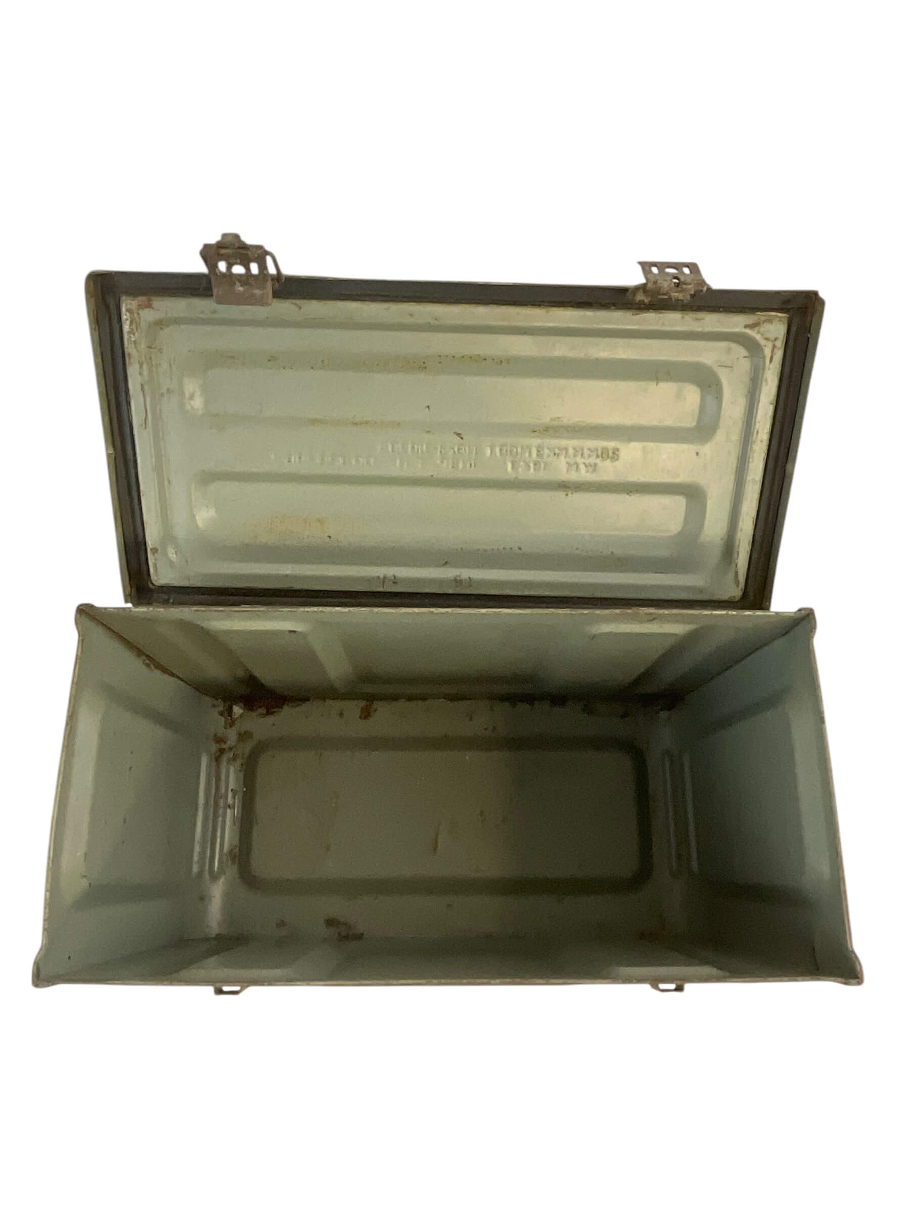 This is a vintage World War II-era Canadian 20mm ammunition box. Please note that it is empty and does not contain any actual ammunition. Made from high-quality steel, the box has a robust construction and a sturdy handle for easy transportation. Despite its age, it remains in excellent condition with minimal signs of wear, showcasing its historical significance and durability. The box is adorned with original markings and labels, hinting at its past use by the Canadian military during the war. This authentic piece of military memorabilia would make a unique addition to any collection, serving as a tangible reminder of Canada’s role in the global conflict. Its compact size also makes it a versatile storage solution for tools, keepsakes, or other items.