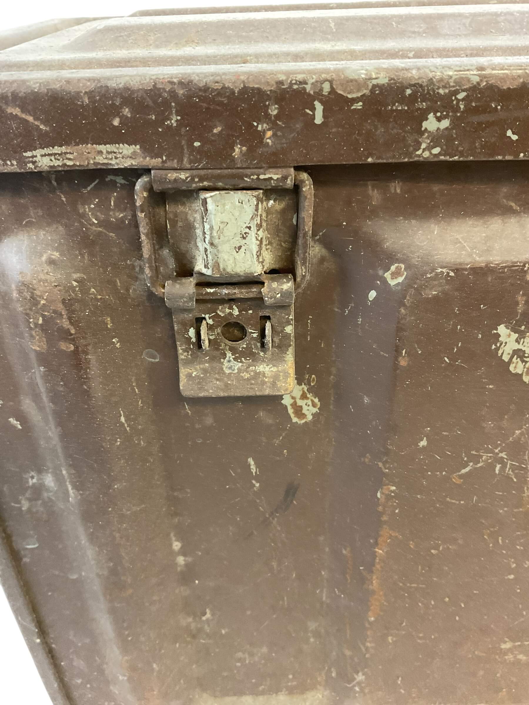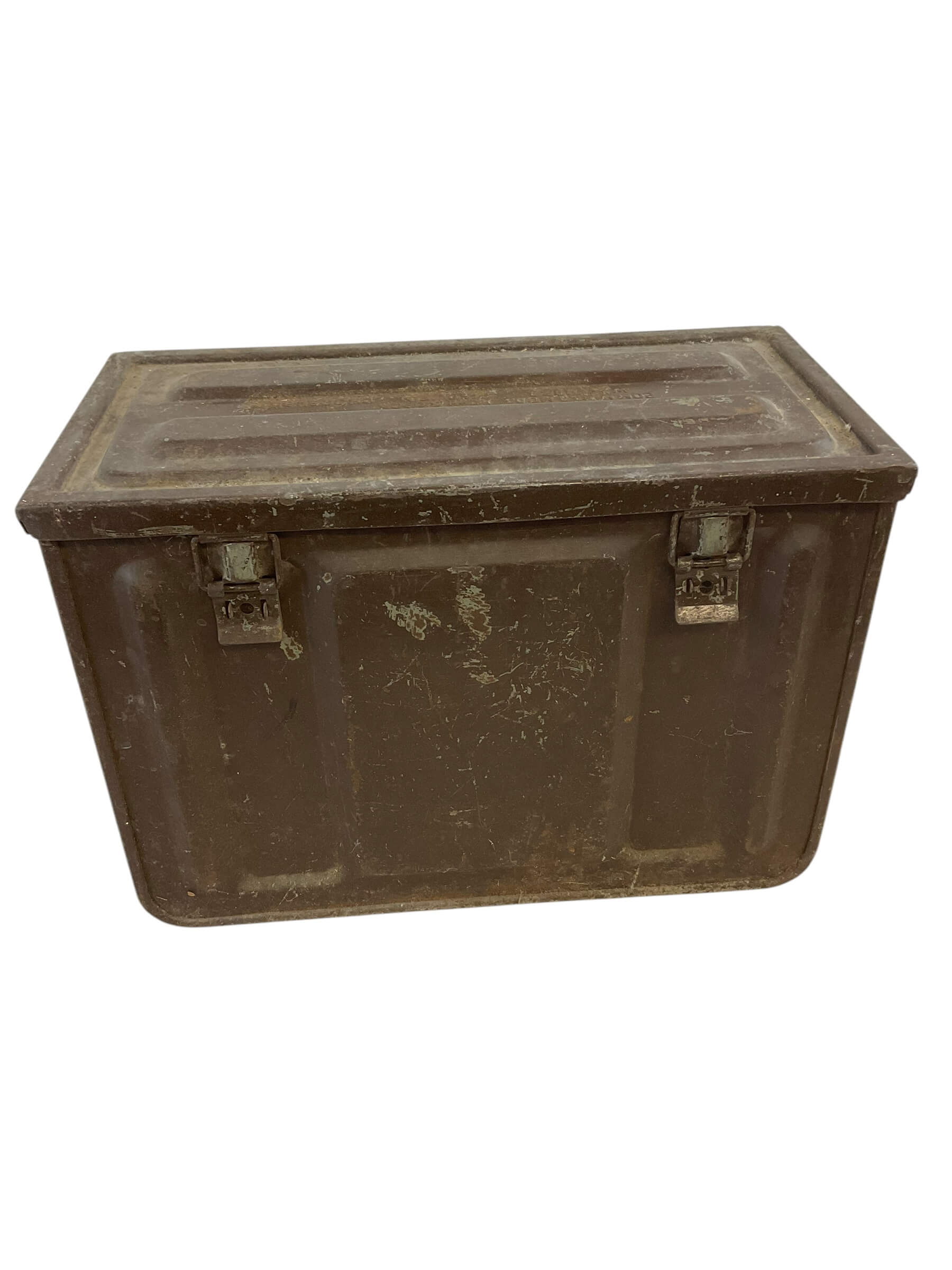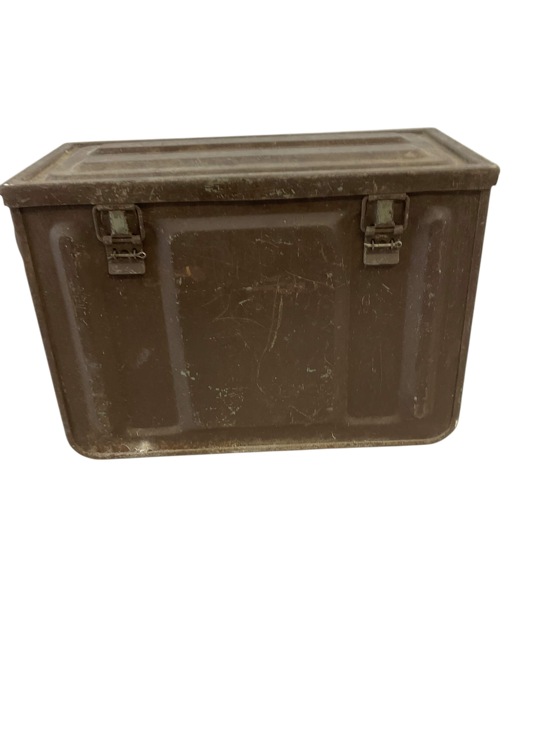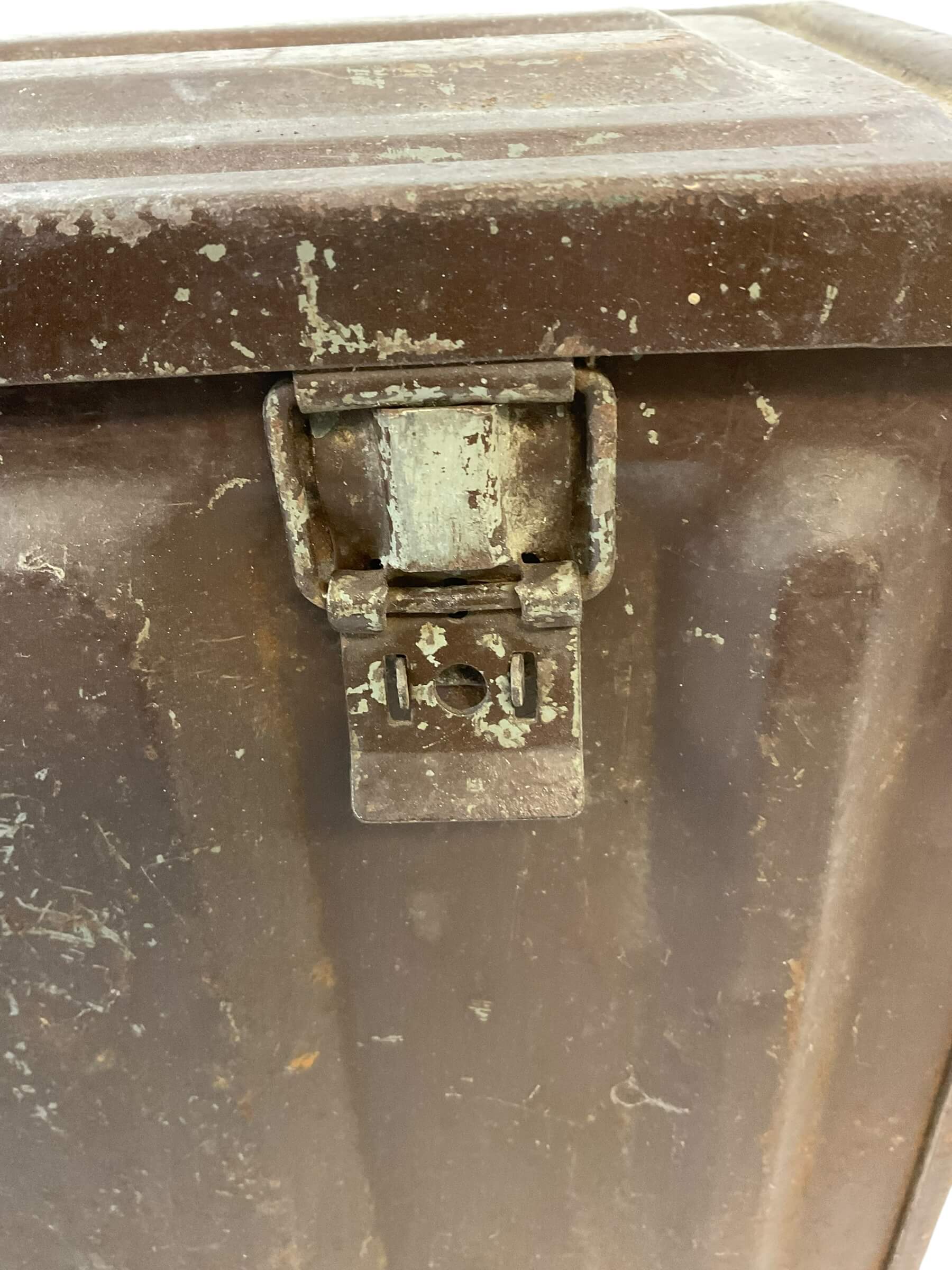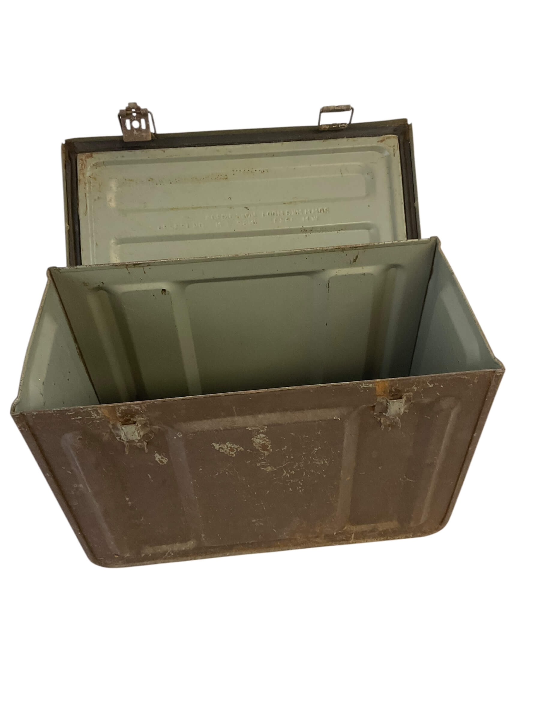 This is a vintage World War II-era Canadian 20mm ammunition box. Please note that it is empty and does not contain any actual ammunition. Made from high-quality steel, the box has a robust construction and a sturdy handle for easy transportation. Despite its age, it remains in excellent condition with minimal signs of wear, showcasing its historical significance and durability. The box is adorned with original markings and labels, hinting at its past use by the Canadian military during the war. This authentic piece of military memorabilia would make a unique addition to any collection, serving as a tangible reminder of Canada’s role in the global conflict. Its compact size also makes it a versatile storage solution for tools, keepsakes, or other items.