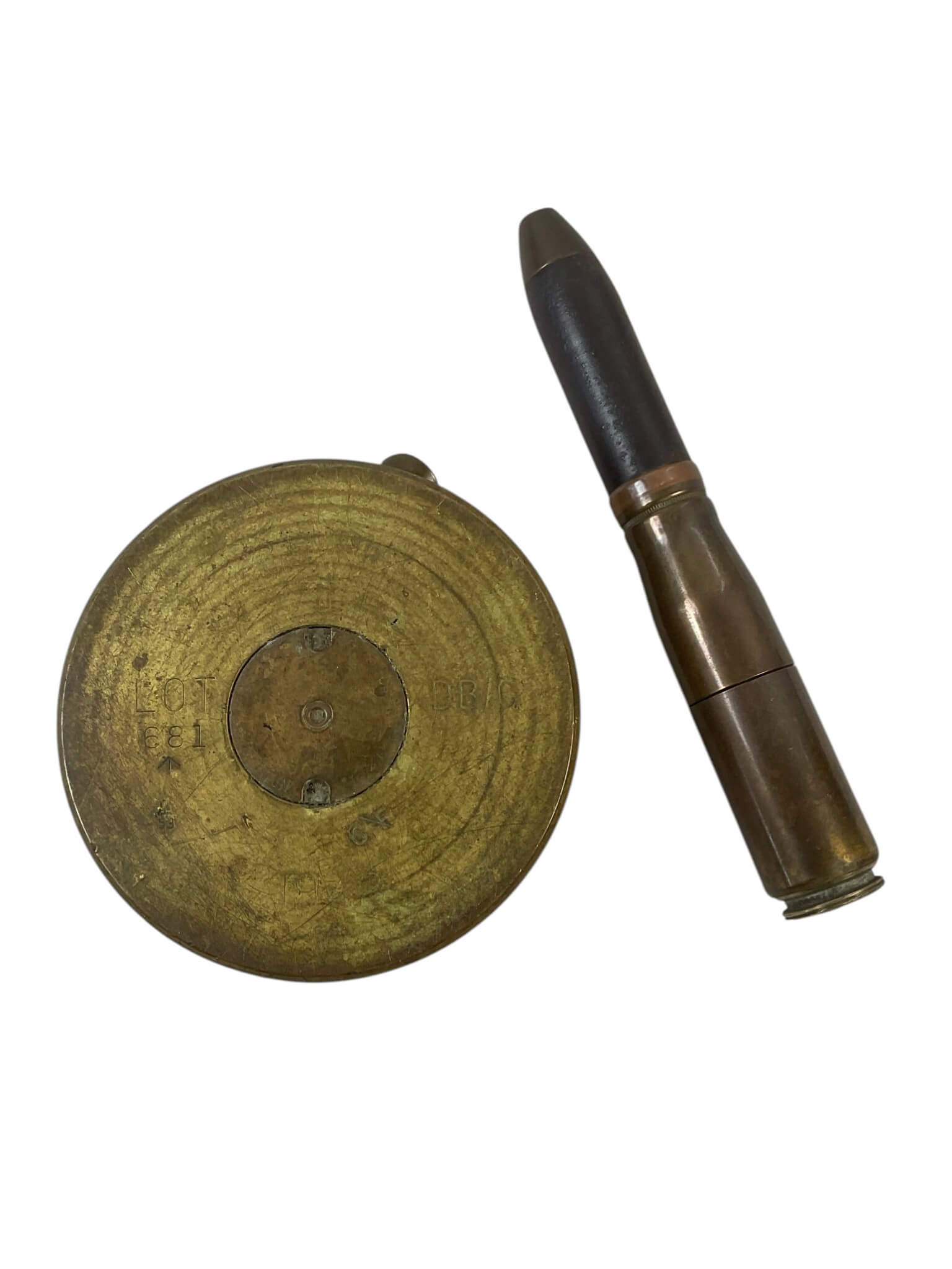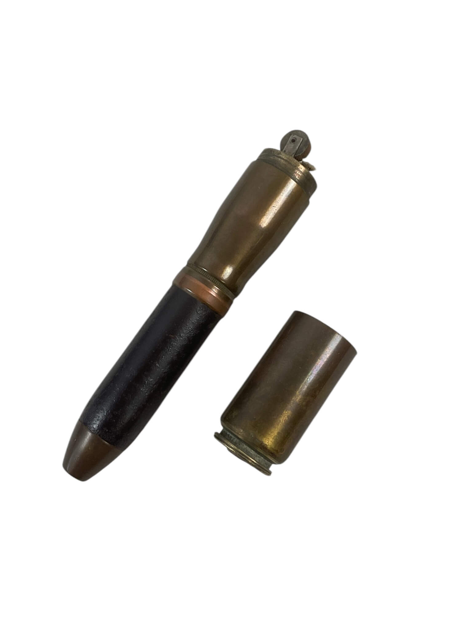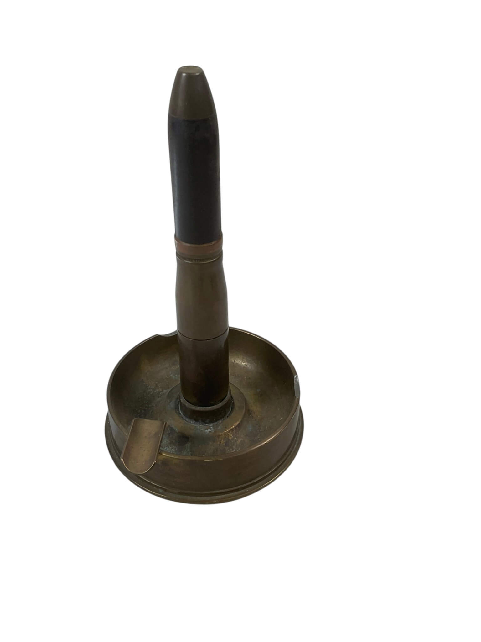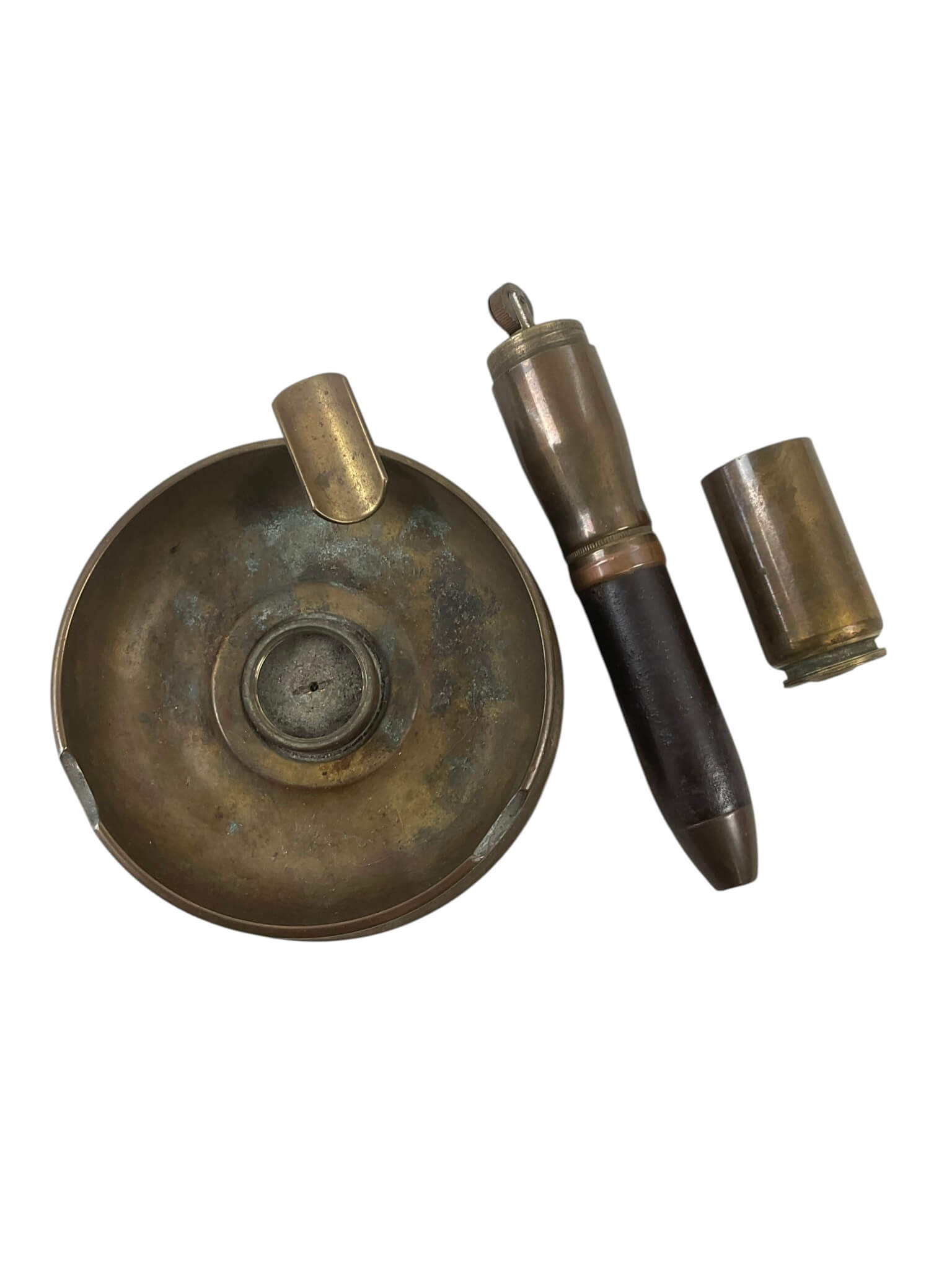 The WW2 Canadian 25 Pounder Trench Art Ashtray and Lighter, dated 1942, is an artifact created from components of a 25-pounder field gun shell. Trench art refers to objects made by servicemen, often from salvaged military material. This piece functions as both an ashtray and a lighter, reflecting common practices among soldiers during wartime. The item shows distinct features characteristic of the era, including brass construction and period markings, with an engraved or stamped 1942 date indicating its origin during the Second World War. The design incorporates elements from 25-pounder ordnance, a widely used artillery piece within the Canadian and Allied forces. Such objects offer insight into the daily lives of military personnel, who transformed surplus or spent materiel into practical or commemorative items. This ashtray and lighter combination serves as a representative example of wartime ingenuity and the adaptation of military hardware into personal artifacts.