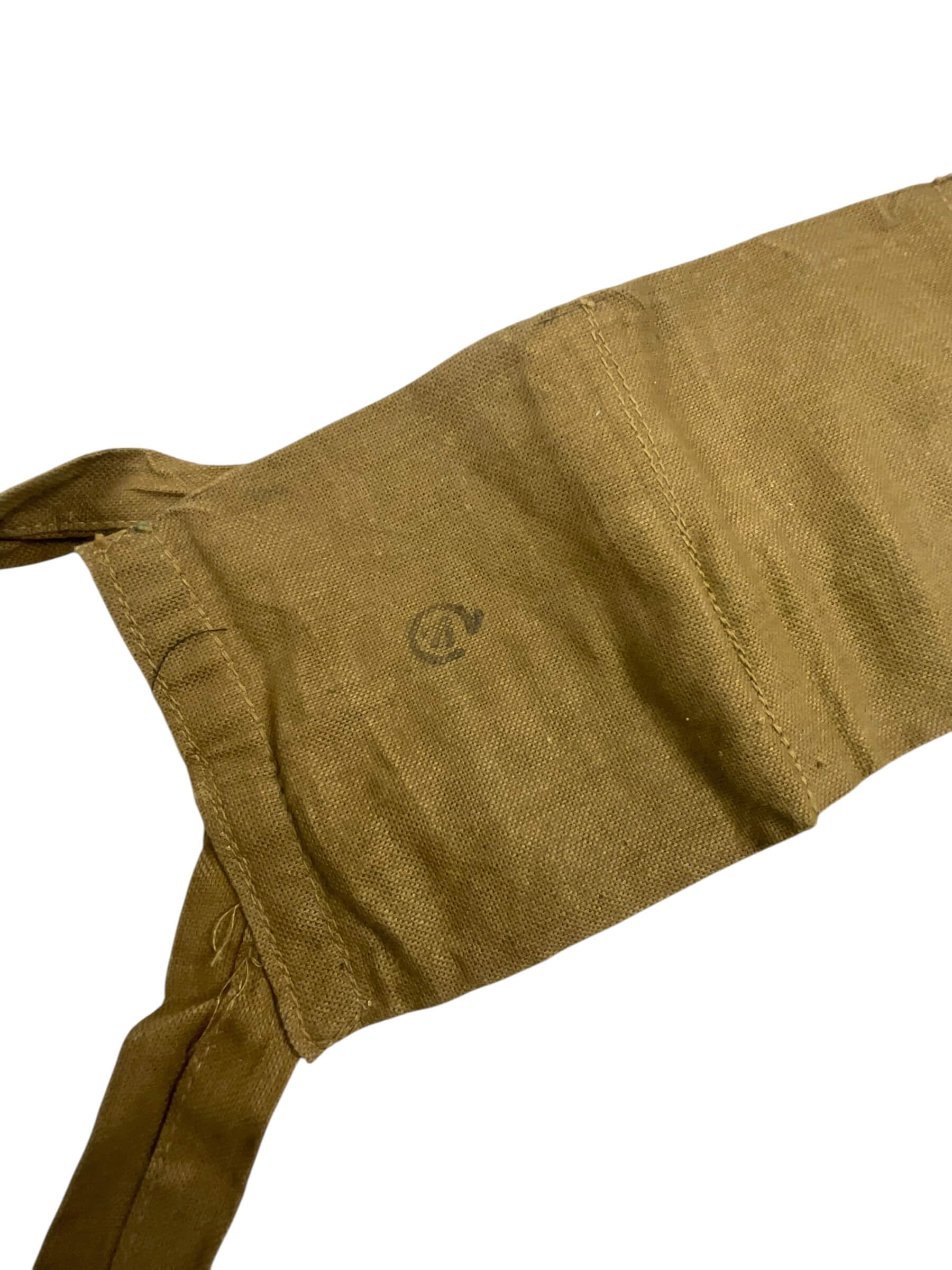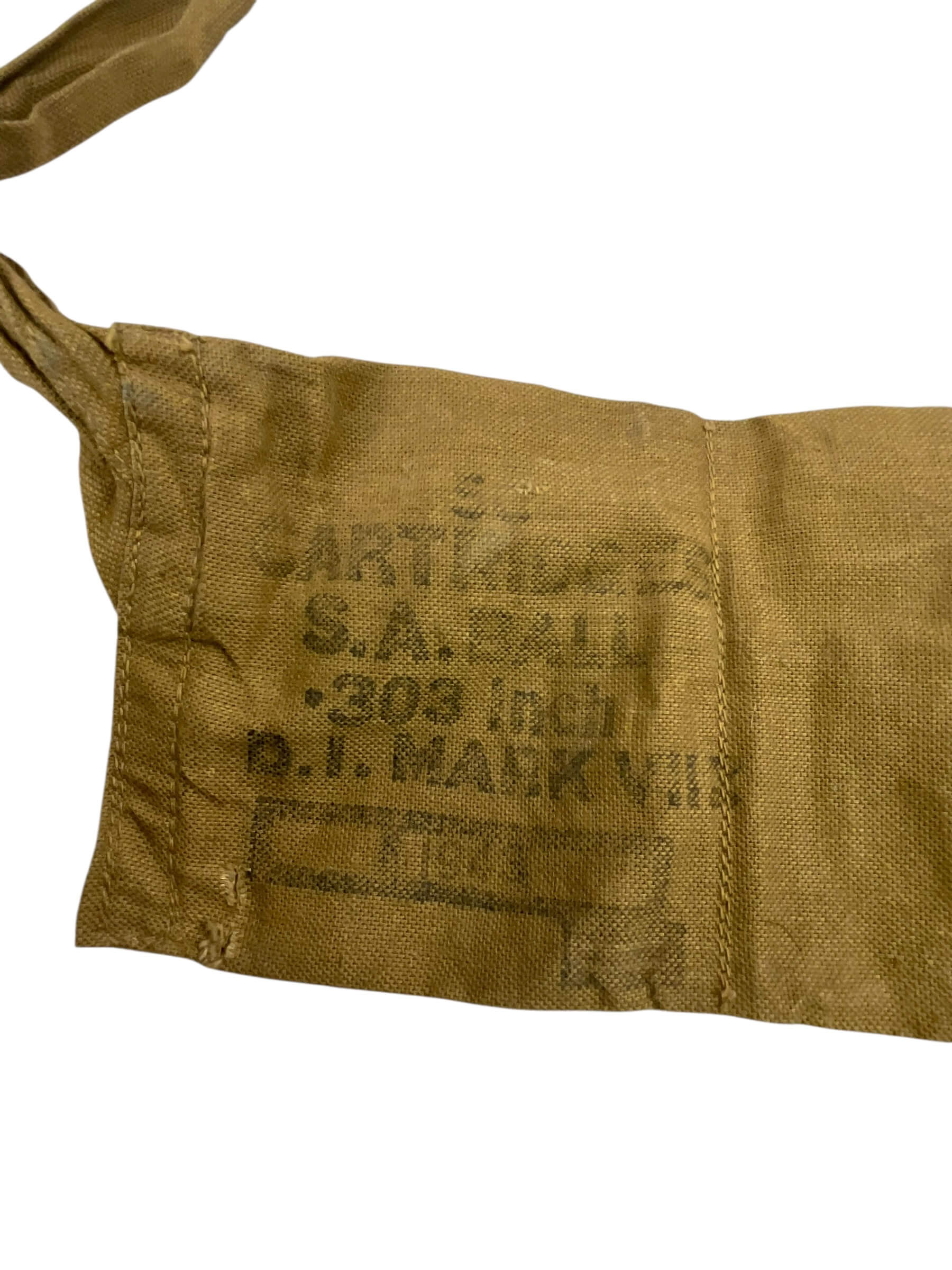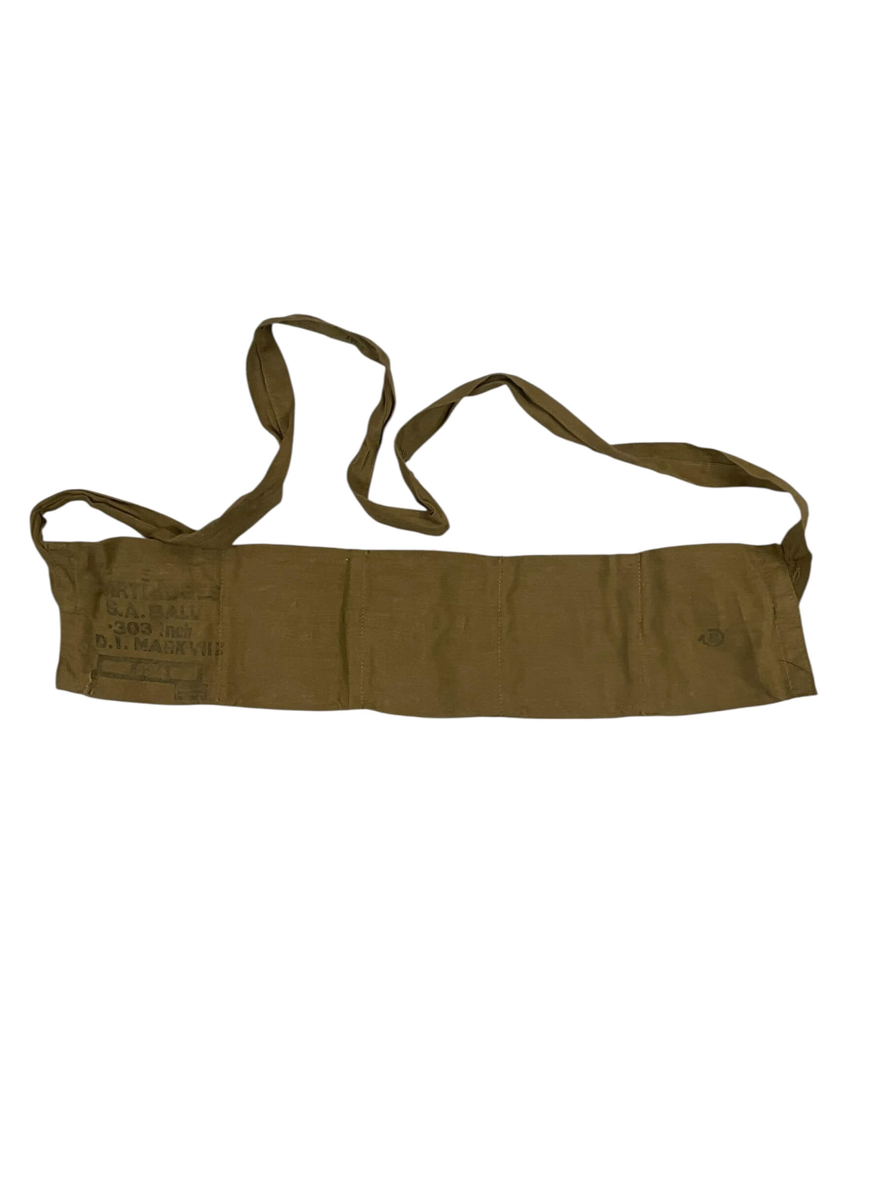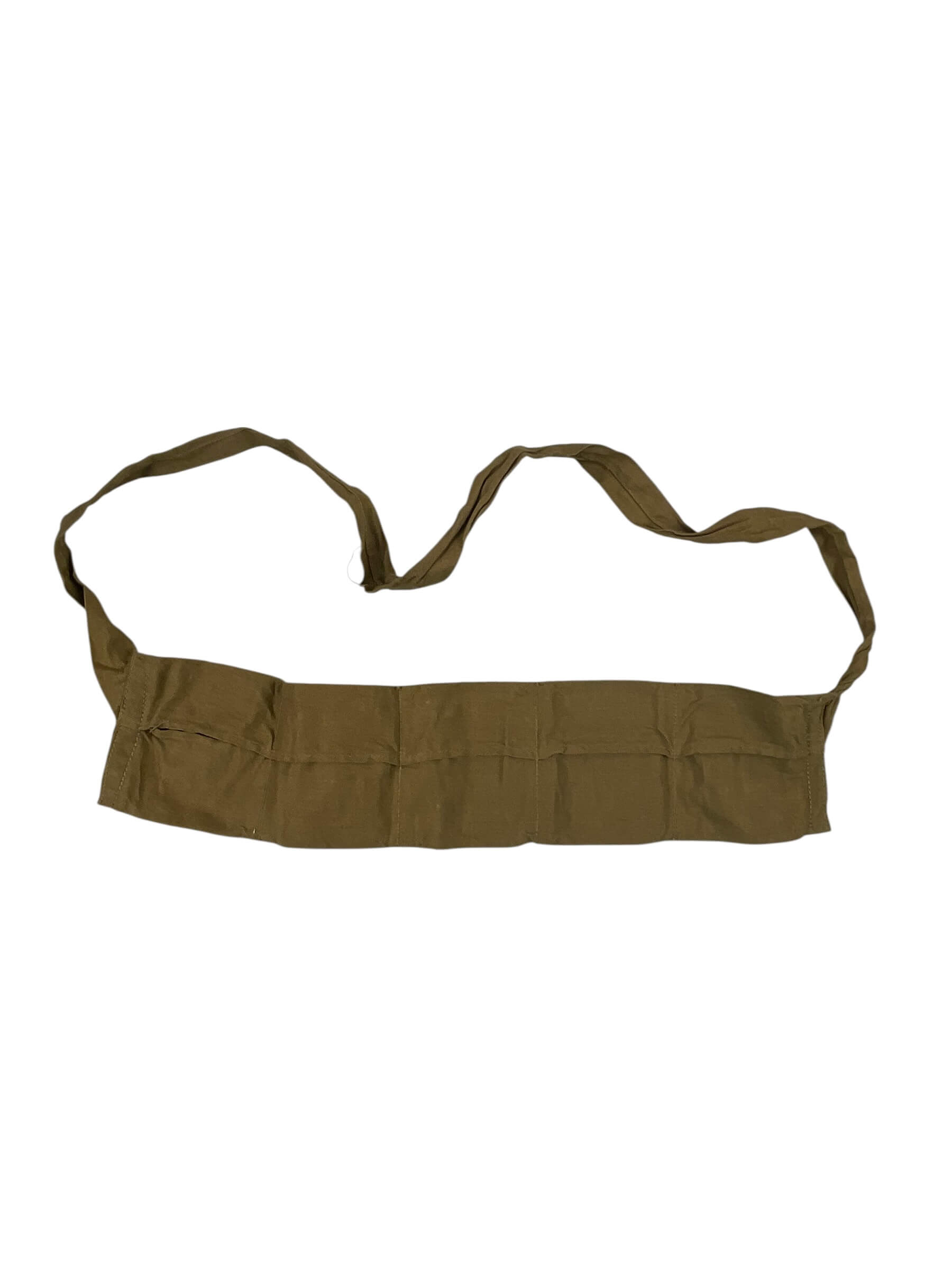 The WW2 Canadian .303 Ammo Bandolier Dated 1943 is a military-issued cloth bandolier used by Canadian forces during the Second World War. This bandolier is constructed from durable khaki cotton webbing and features stitched pockets designed to hold .303 caliber rifle ammunition, typically for the Lee-Enfield service rifle. The bandolier is clearly marked with a 1943 date stamp and a Canadian “C” Broad Arrow acceptance mark, indicating official government issue and authenticity. Each pocket is closed by a simple stitched flap, allowing for easy access while providing secure retention of cartridges in the field. Bandoliers of this type were widely used by infantry for carrying extra ammunition efficiently during combat and training. The presence of the date and markings provides important identification for collectors and researchers, situating the item within the context of Canada’s military equipment during the Second World War.