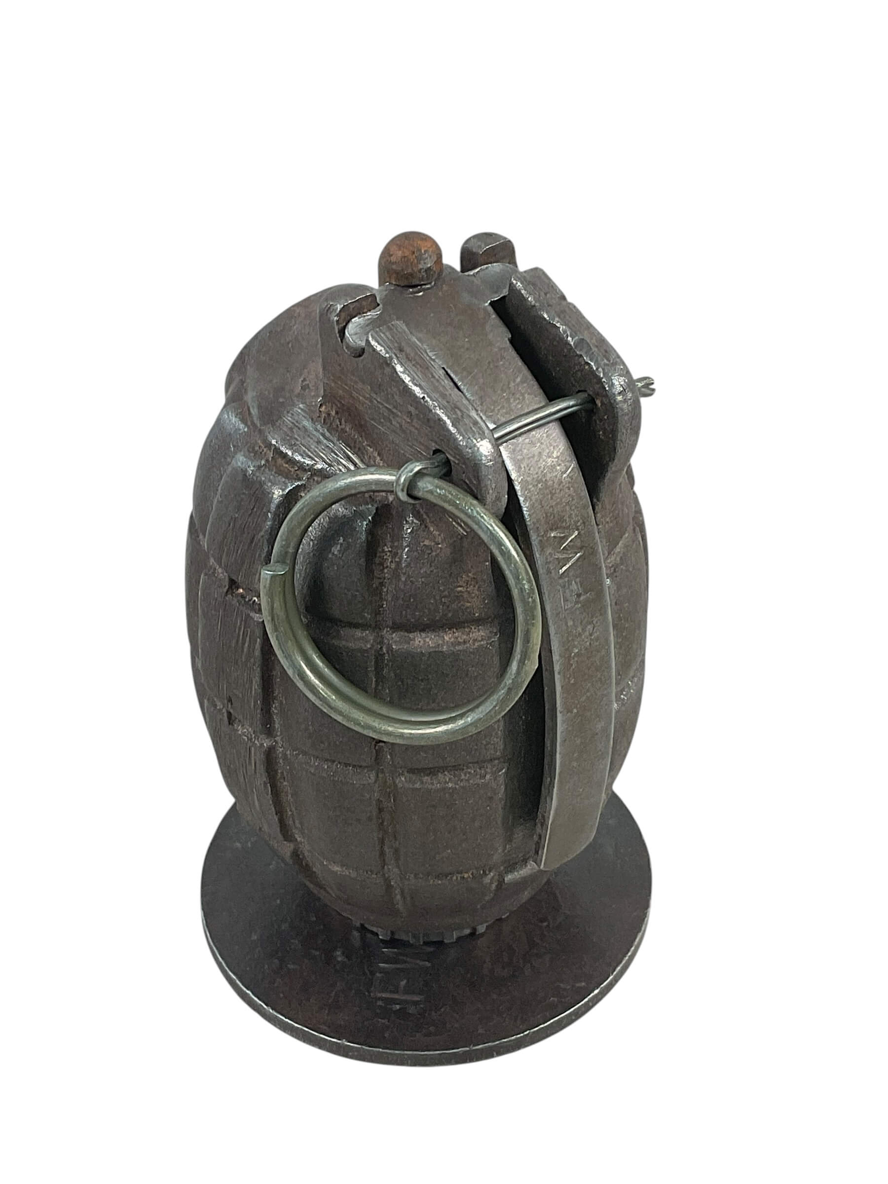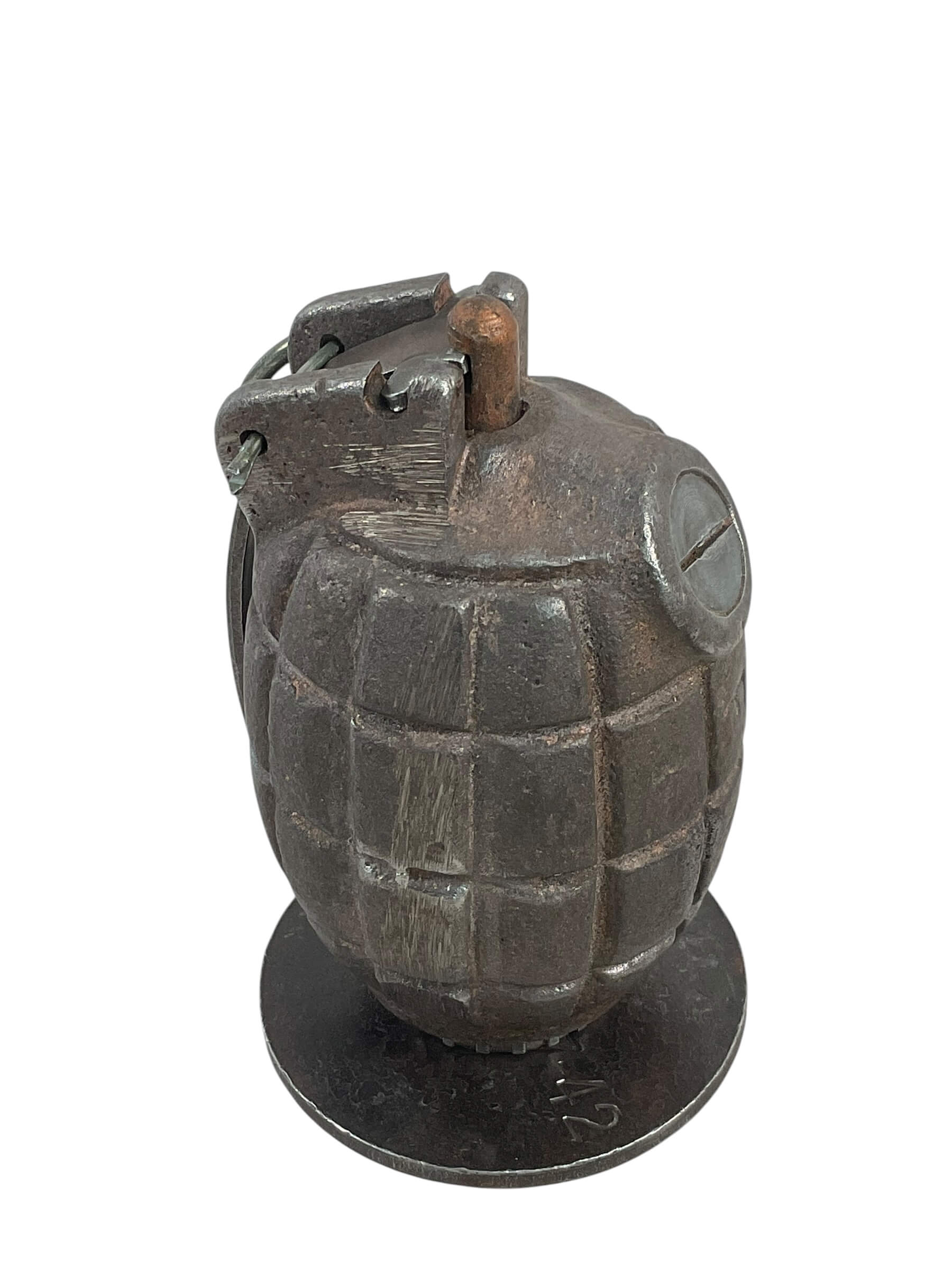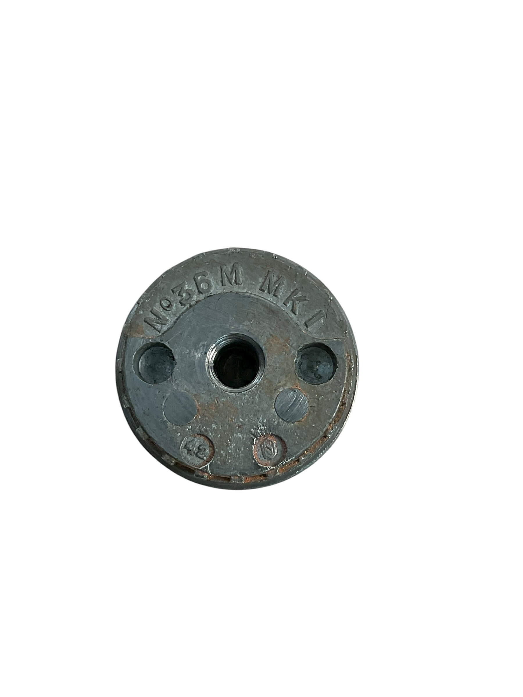 The WW2 Canadian #36 Mills with Discharge Cup Plate Frost and Woods Matching INERT is a historical artifact from the Second World War era. Often used by Canadian forces, this item is an inert, or deactivated, version of the #36 Mills Grenade, a British hand grenade widely used during both World Wars. The product features a discharge cup plate that is historically accurate and built to match its original specifications. It comes from notable manufacturer Frost and Woods. As an inert product, it no longer poses any risk of detonation, making it safe for display or collection. This item serves as a tangible representation of Canadian WW2 military history, and will be of interest to those fascinated by historical military equipment or artifacts.
