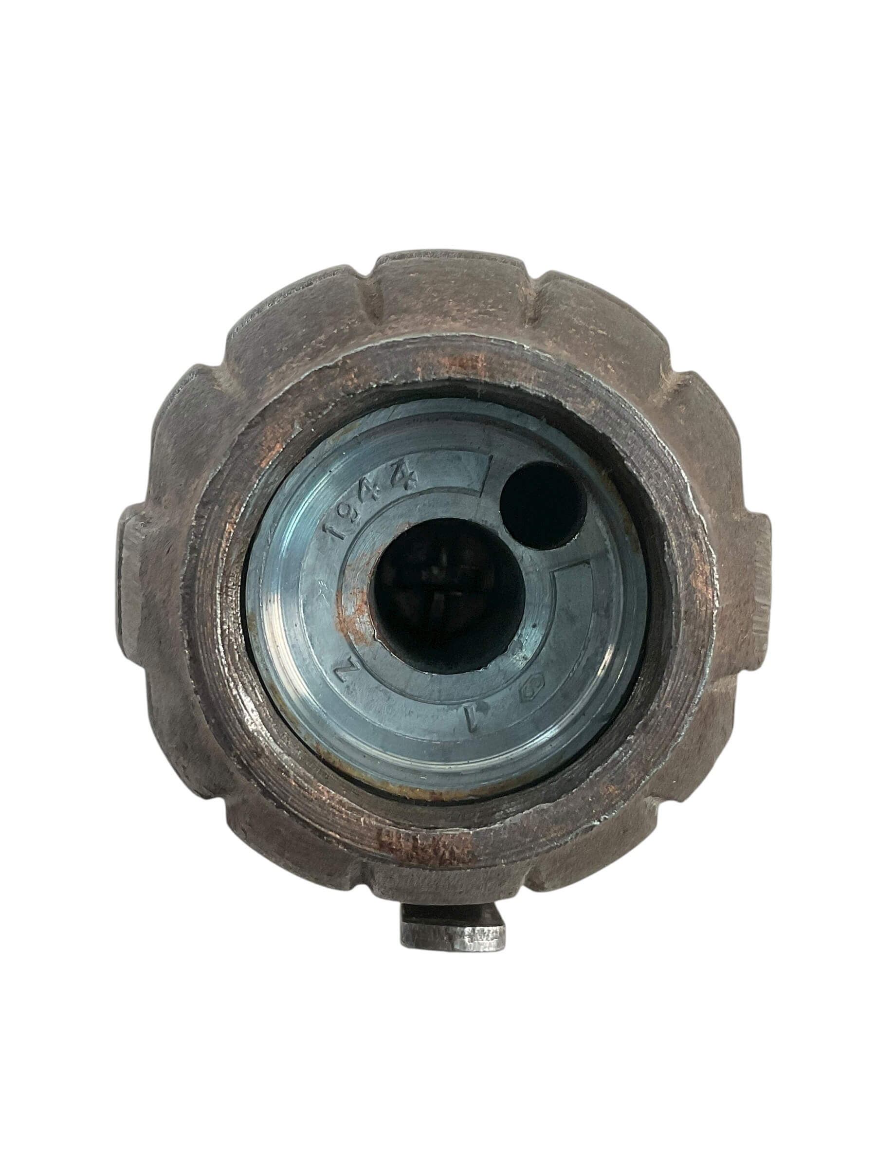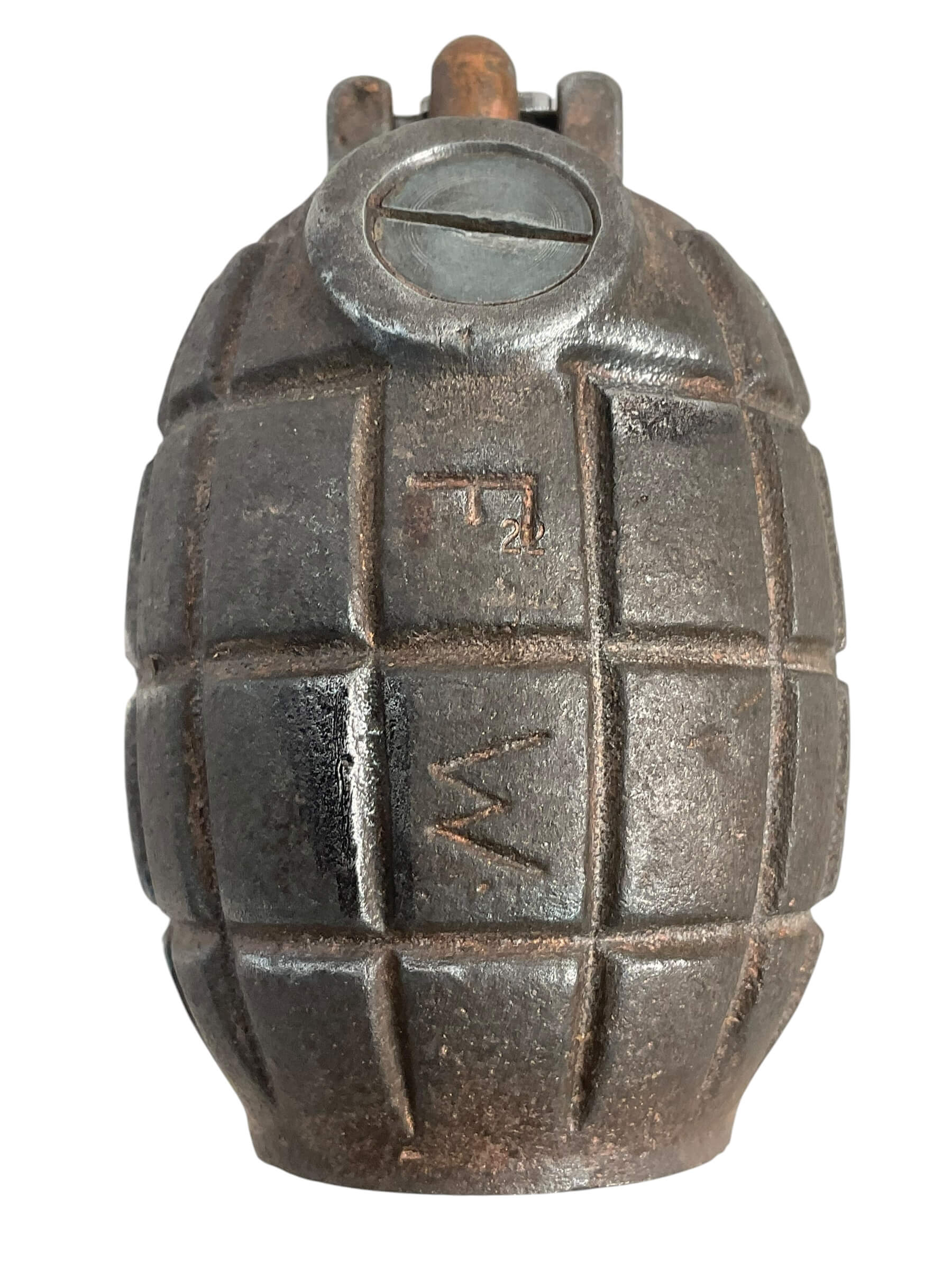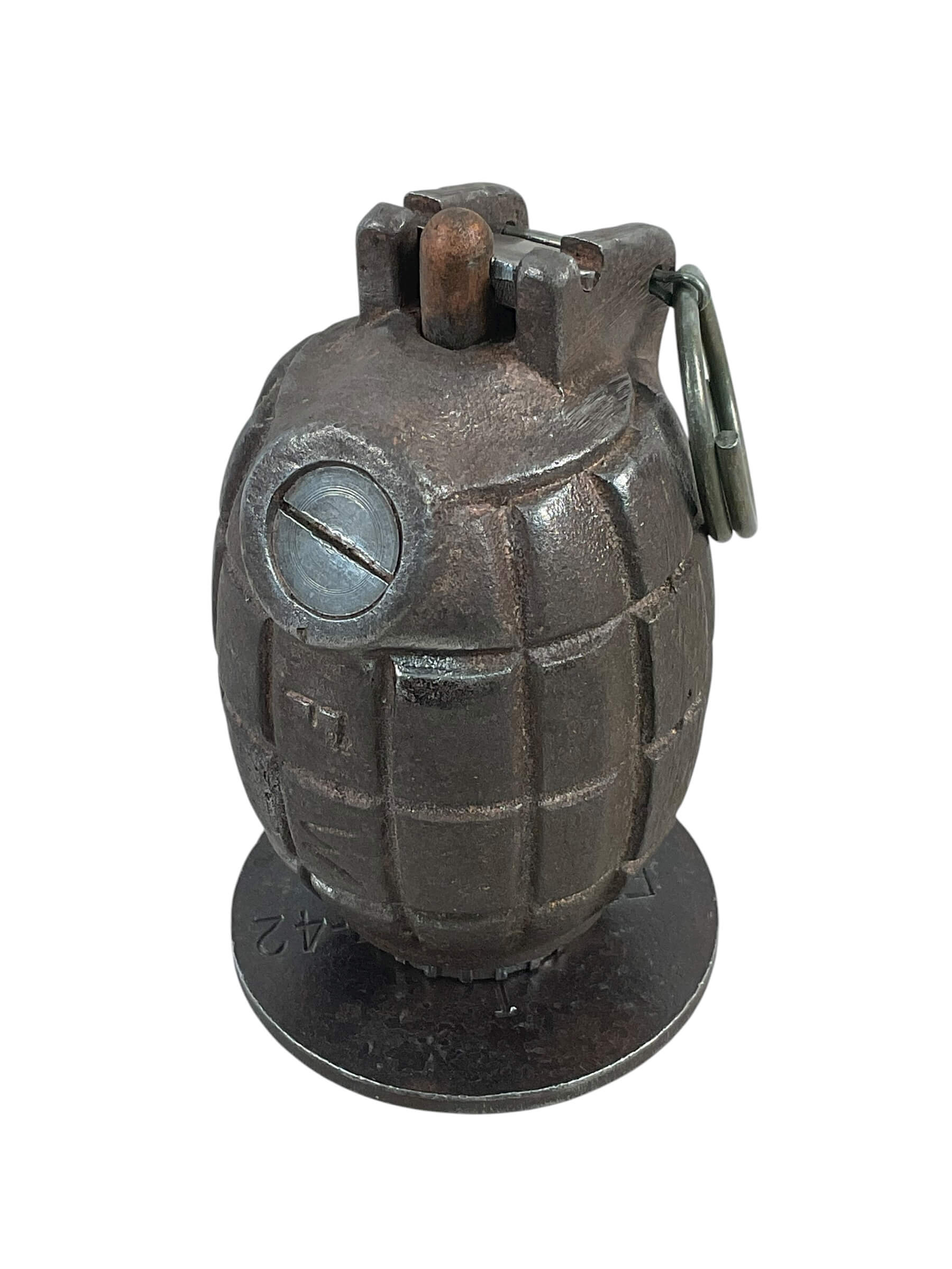 The WW2 Canadian #36 Mills with Discharge Cup Plate Frost and Woods Matching INERT is a historical artifact from the Second World War era. Often used by Canadian forces, this item is an inert, or deactivated, version of the #36 Mills Grenade, a British hand grenade widely used during both World Wars. The product features a discharge cup plate that is historically accurate and built to match its original specifications. It comes from notable manufacturer Frost and Woods. As an inert product, it no longer poses any risk of detonation, making it safe for display or collection. This item serves as a tangible representation of Canadian WW2 military history, and will be of interest to those fascinated by historical military equipment or artifacts.