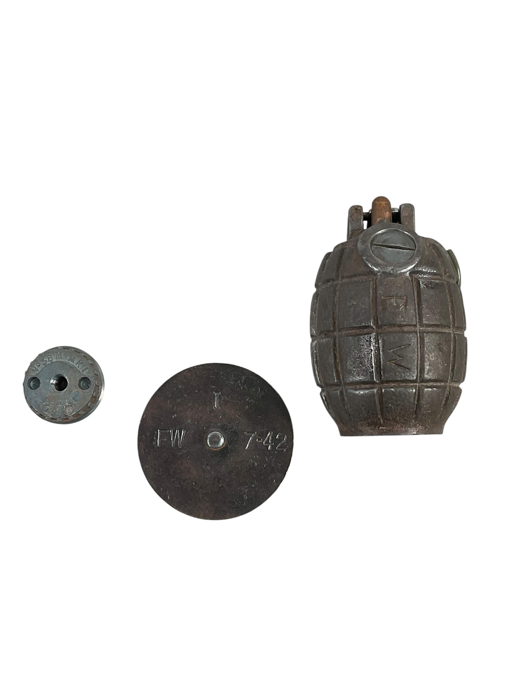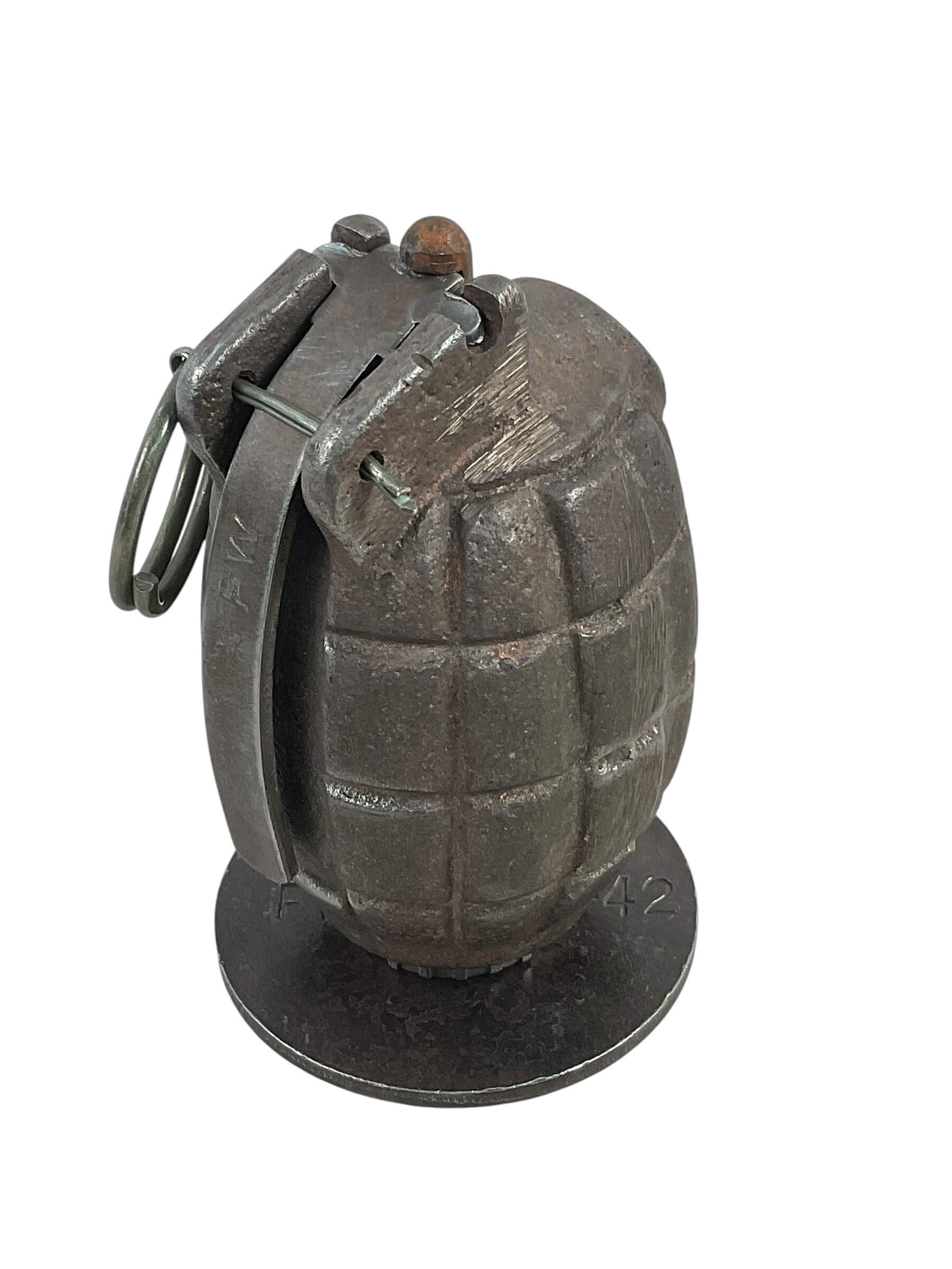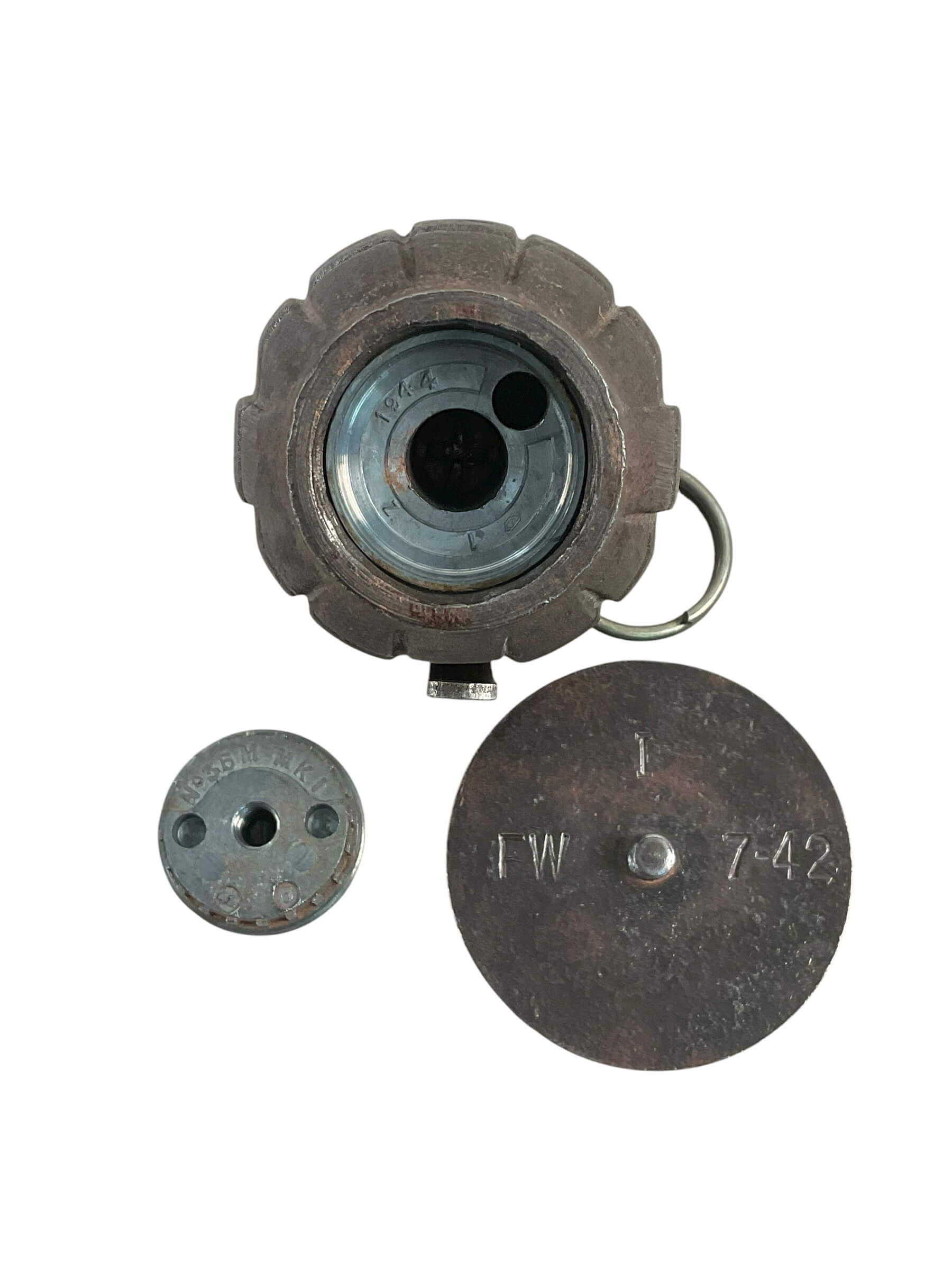 The WW2 Canadian #36 Mills, an INERT artifact, features a Discharge Cup Plate crafted by Frost and Woods. This wartime relic has identifiable matching components from the World War II era. This is a Canadian variant of the Mills Bomb series, strongly revered for its history and craftsmanship.