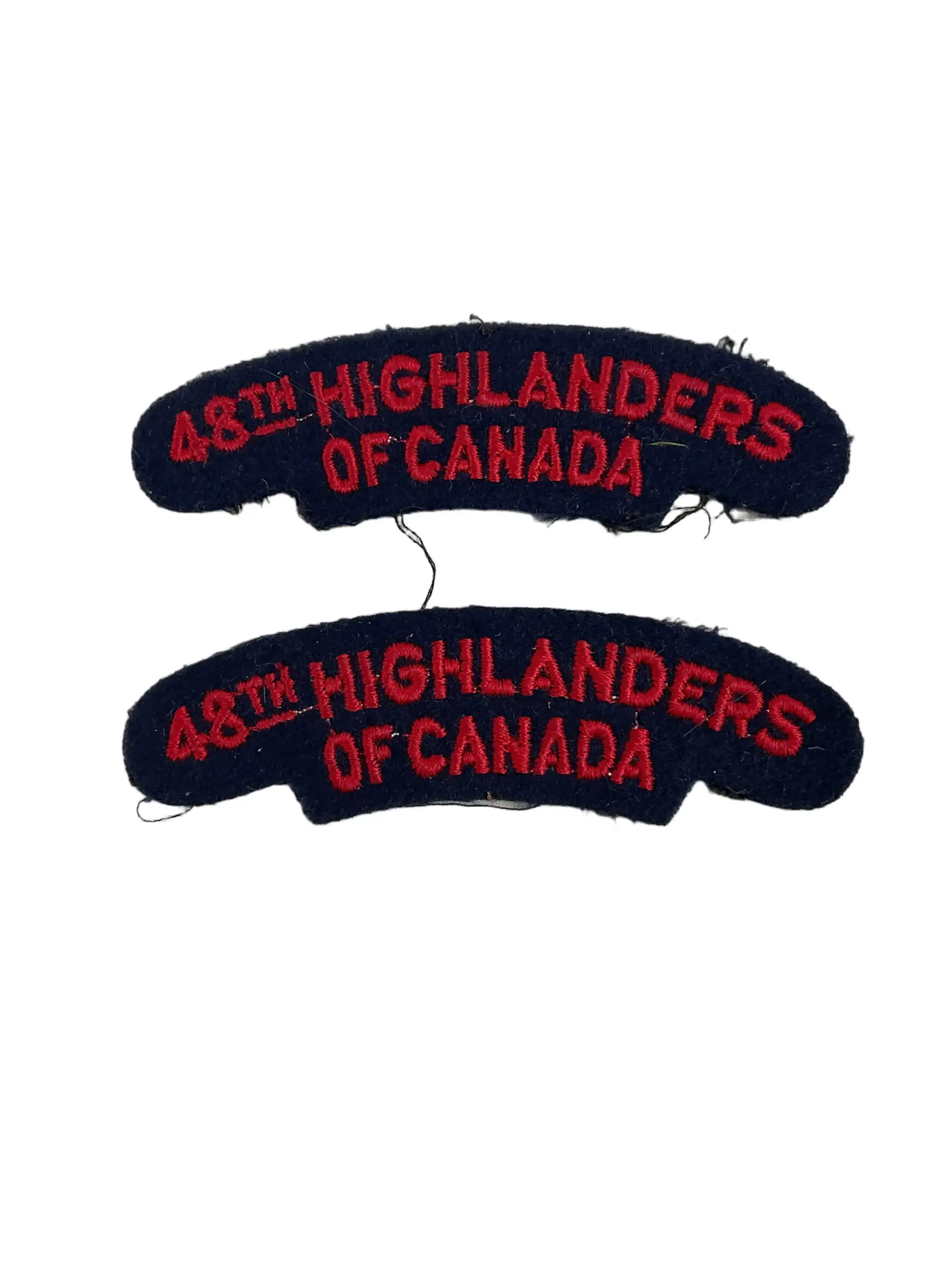 This is a matched pair of World War II-era Canadian 48th Highlanders of Canada shoulder titles insignia. The 48th Highlanders, an infantry regiment of the Canadian Army, played a significant role during the Second World War as part of the 1st Canadian Infantry Division. Each title is constructed from red felt with “48 HIGHLANDERS” embroidered in white, designed to be worn on the upper sleeve of the service dress uniform. These insignia served to identify the wearer’s regimental affiliation within the Canadian Army. Shoulder titles such as these were a standard component of the uniform and aided in unit organization, particularly when soldiers operated alongside units from other Commonwealth nations. The pair displays typical period manufacturing characteristics, including cut edges and wartime materials. This set provides an example of Canadian Army insignia from the mid-20th century and reflects the distinct tradition and identity of the 48th Highlanders of Canada during World War II.