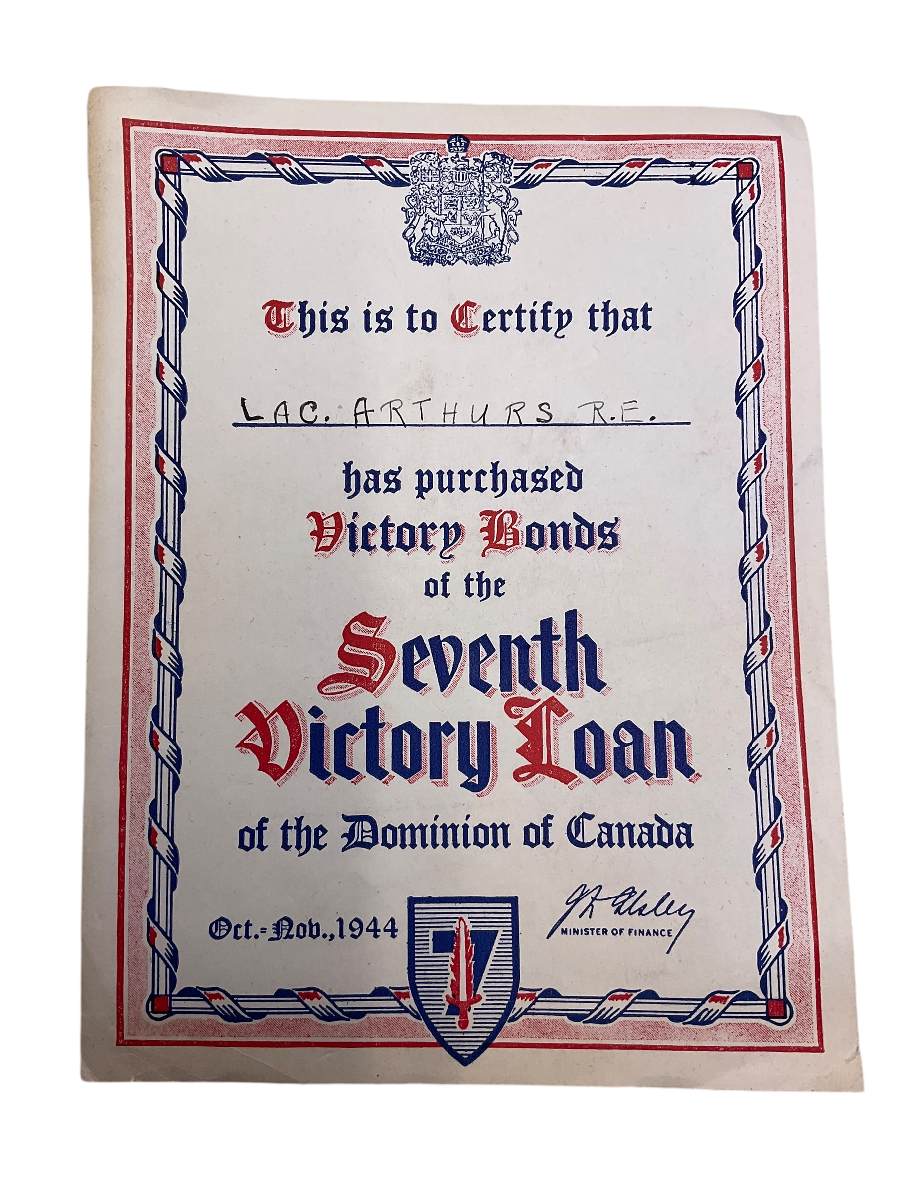 WW2 Canadian 7th Victory Loan Certificate RCAF LAC Arthurs