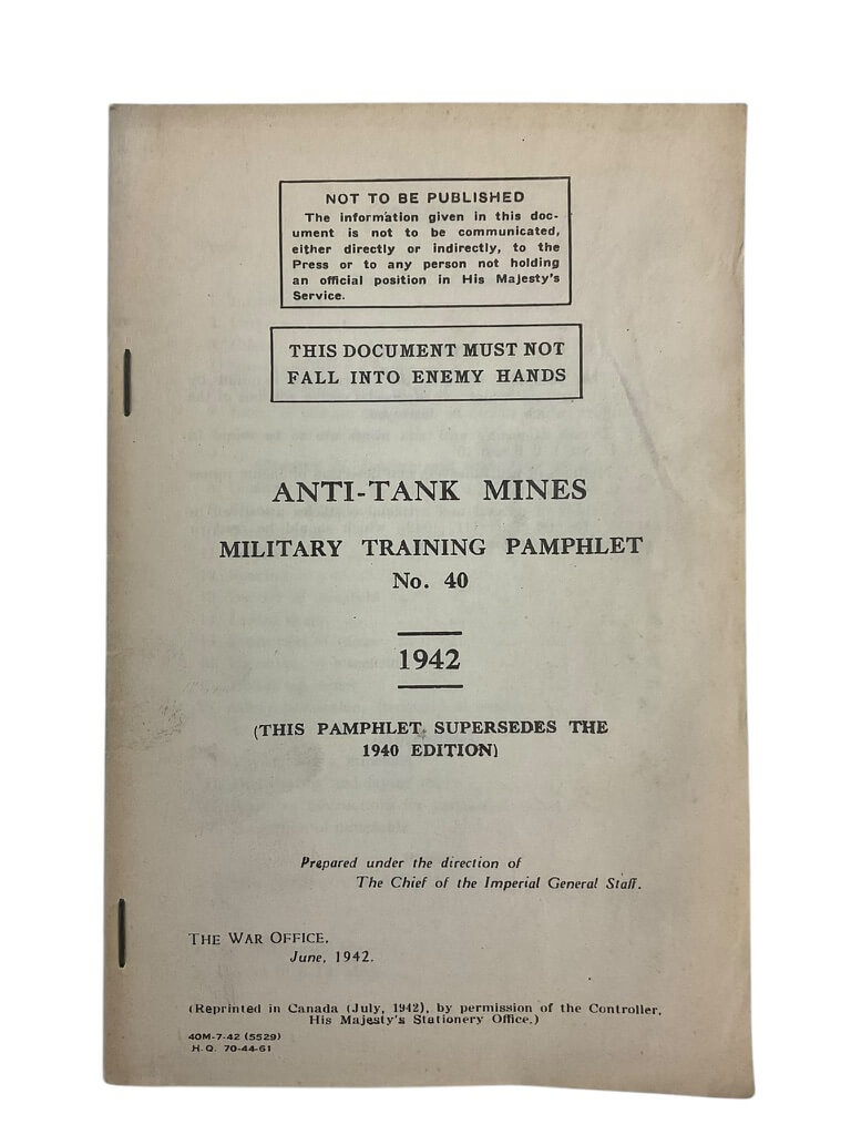 This is a rare, authentic WWII-era military training pamphlet, entitled ‘Canadian Anti-Tank Mines Military Training Pamphlet No 40’. Published in 1942, this used softcover reference manual offers a unique glimpse into the military strategies and tactics of the time. It details the use, operation, and deployment of anti-tank mines by the Canadian forces during the Second World War. This vintage military document is not only historically significant but is also an invaluable resource for historians, military enthusiasts, and collectors alike. Despite being used, it is in reasonable condition for its age. It is a fascinating piece of military memorabilia that sheds light on a critical aspect of Canada’s wartime defense strategies.  Total of 37 pages.
