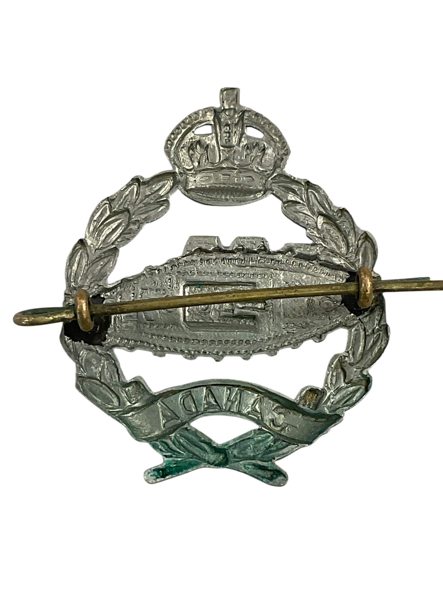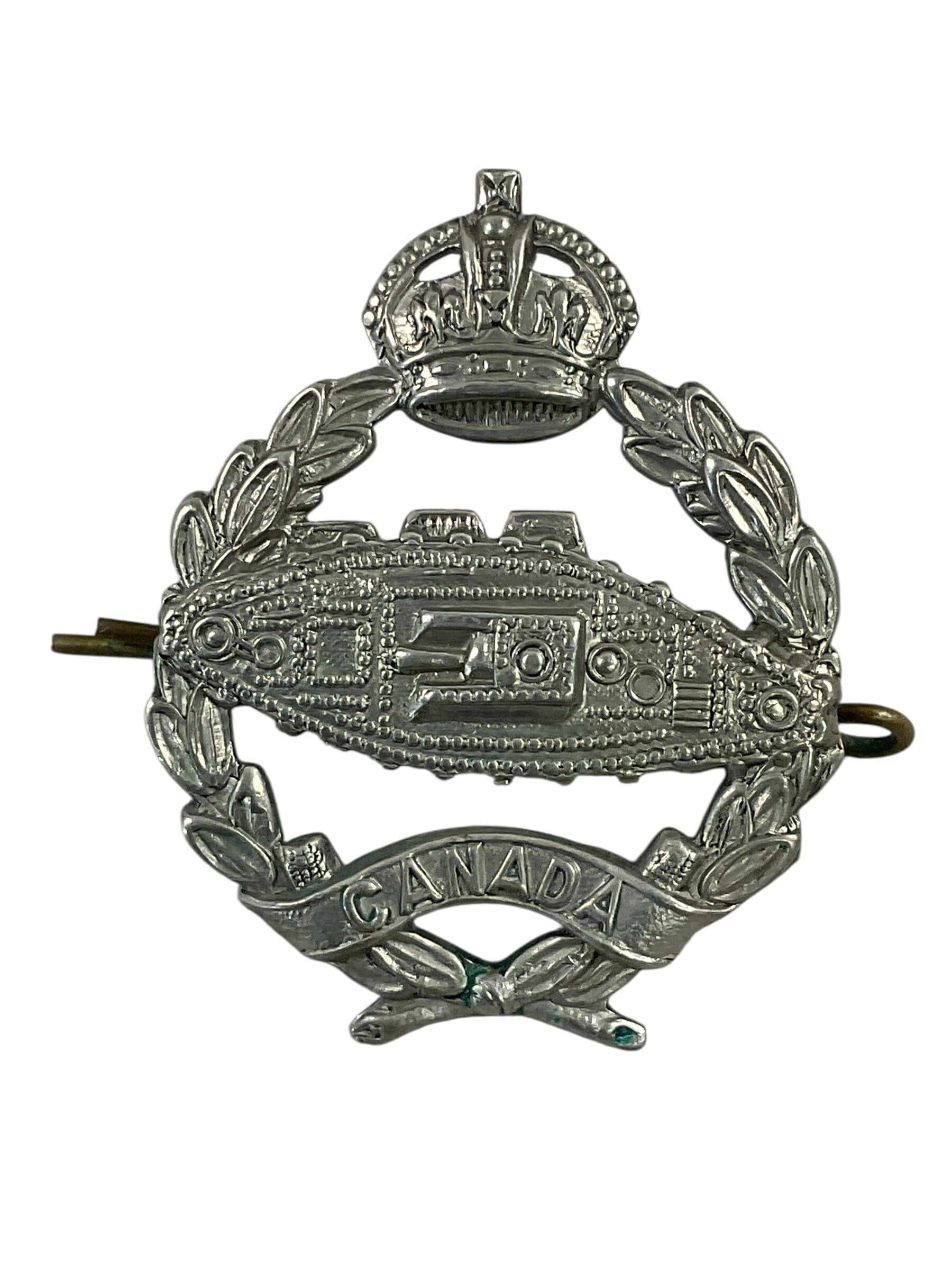 The WW2 Canadian Armoured Corps Cap Badge is an original insignia issued to members of the Canadian Armoured Corps during the Second World War. The badge typically features a crowned tank positioned centrally, symbolizing the mechanized warfare capabilities of the corps. Below or around the tank, a scroll generally bears the corps’ designation, such as “Canadian Armoured Corps.” Constructed from brass or white metal, the badge measures approximately 45 mm in height and displays a lug or slider fastening on the reverse for attachment to military headgear. Issued from the early 1940s, this cap badge identified personnel specializing in armored vehicle operations and was worn by members of tank regiments and related units. Its design reflects the evolution of cavalry into mechanized forces and marks a significant period in Canadian military history. Variations in detail and manufacture exist, reflecting different wartime suppliers and production runs.