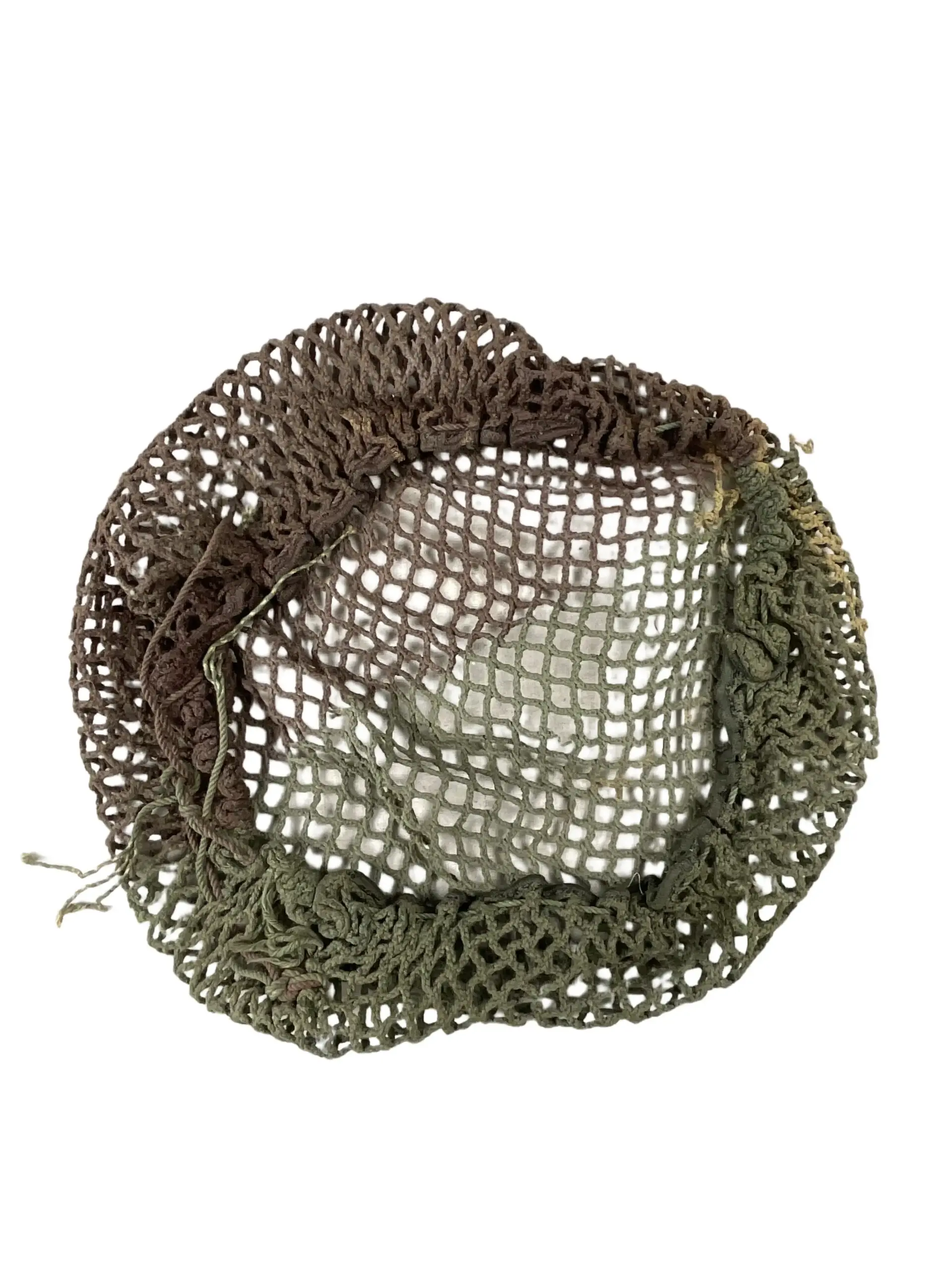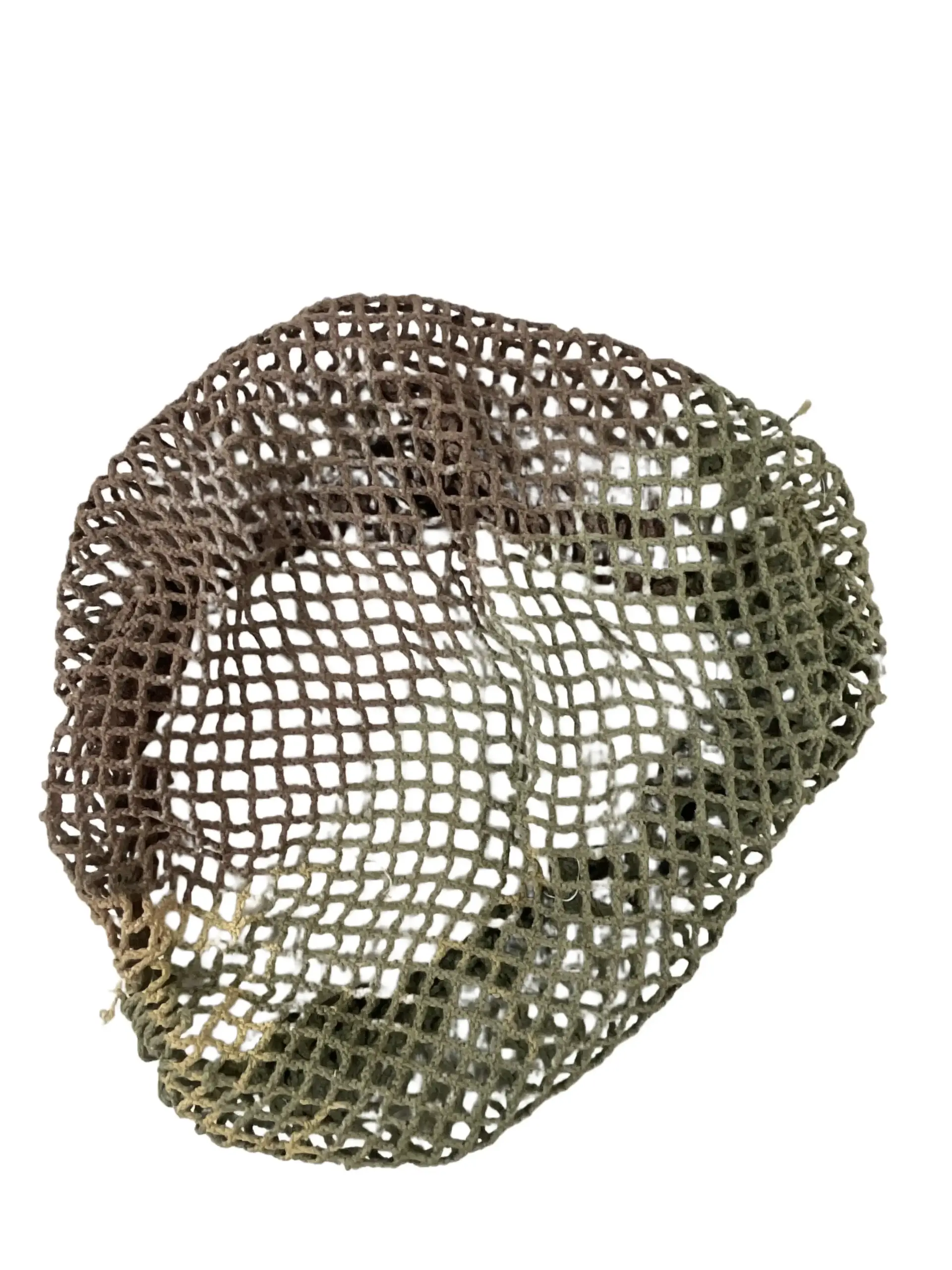 The WW2 Canadian Army 3 Tone Helmet Net is an original piece of military equipment used during the Second World War. Designed to fit over the standard-issue steel helmets, this net features a three-tone camouflage pattern intended to reduce helmet glare and enhance concealment in diverse field environments. The net is woven from durable cord, incorporating green, brown, and tan threads to blend with varying landscapes common to European and North African theaters. Attachment to the helmet is achieved by stretching the netting over the shell and securing it at the rim, sometimes supplemented by natural foliage for added camouflage. These nets were standard issue for Canadian troops and were widely seen in archival photographs and period documentation from the war years. The WW2 Canadian Army 3 Tone Helmet Net represents a practical response to the challenges of battlefield visibility and remains a recognizable artifact of Canadian military history.