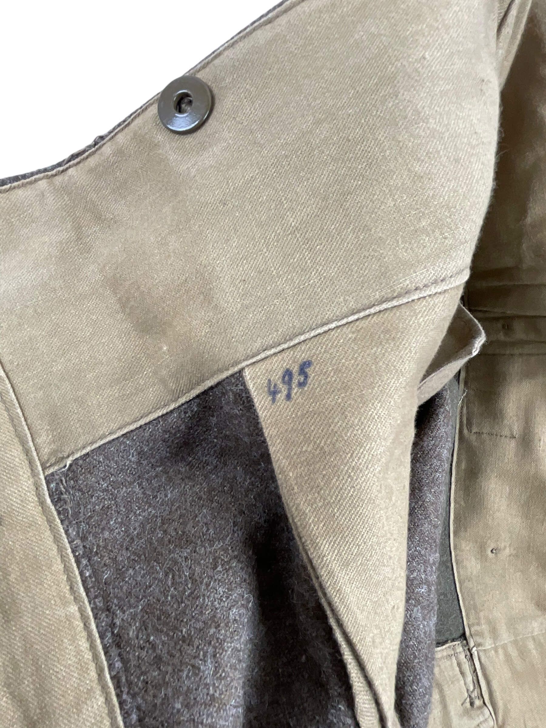 These WW2 Canadian Army Battle Dress Pants C Broad Arrowed 1945 Dated are a remarkable piece of military history. They are authentic World War II era trousers issued to the Canadian Army, denoted by the ‘C Broad Arrow’ mark, which was the official Canadian Government property mark. The mark signifies that these pants were standard issue for Canadian soldiers. Made in 1945, as the war was drawing to a close, these pants have stood the test of time. They exhibit the sturdy construction and practical design required of military attire, with roomy pockets, reinforced seams, and durable fabric. Even after over 75 years, they retain their original khaki colour. As a collector’s item, they provide a unique glimpse into the life of a soldier during one of the most significant periods in world history.