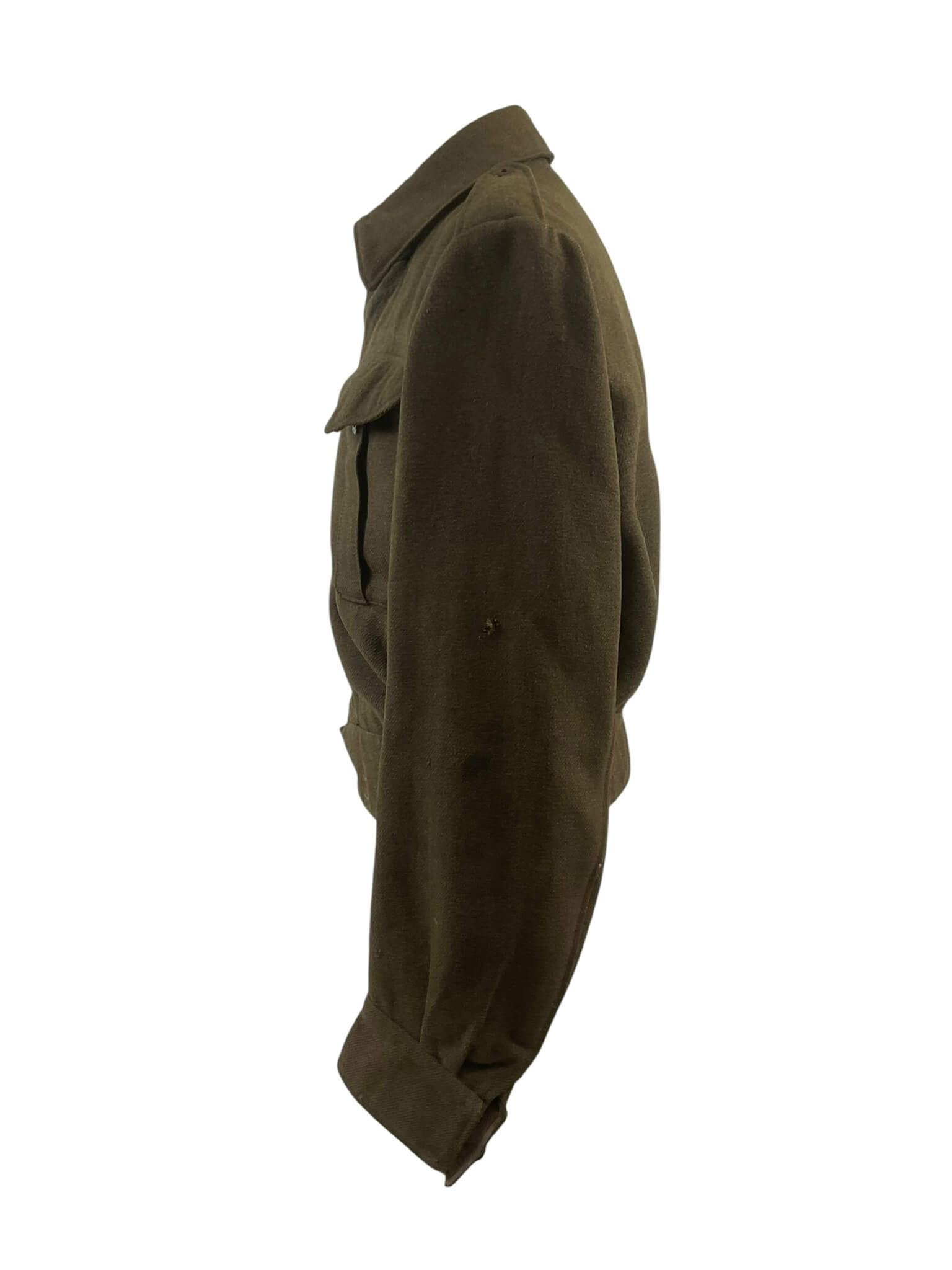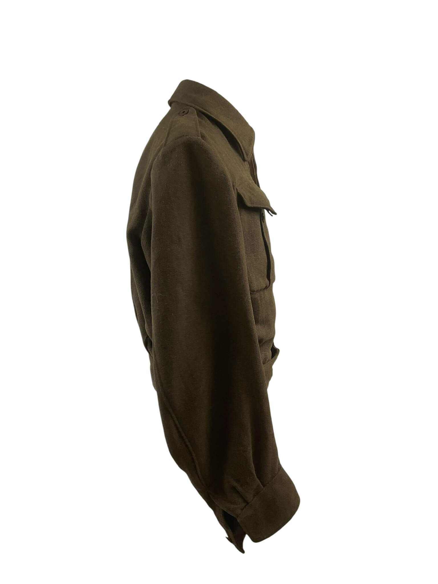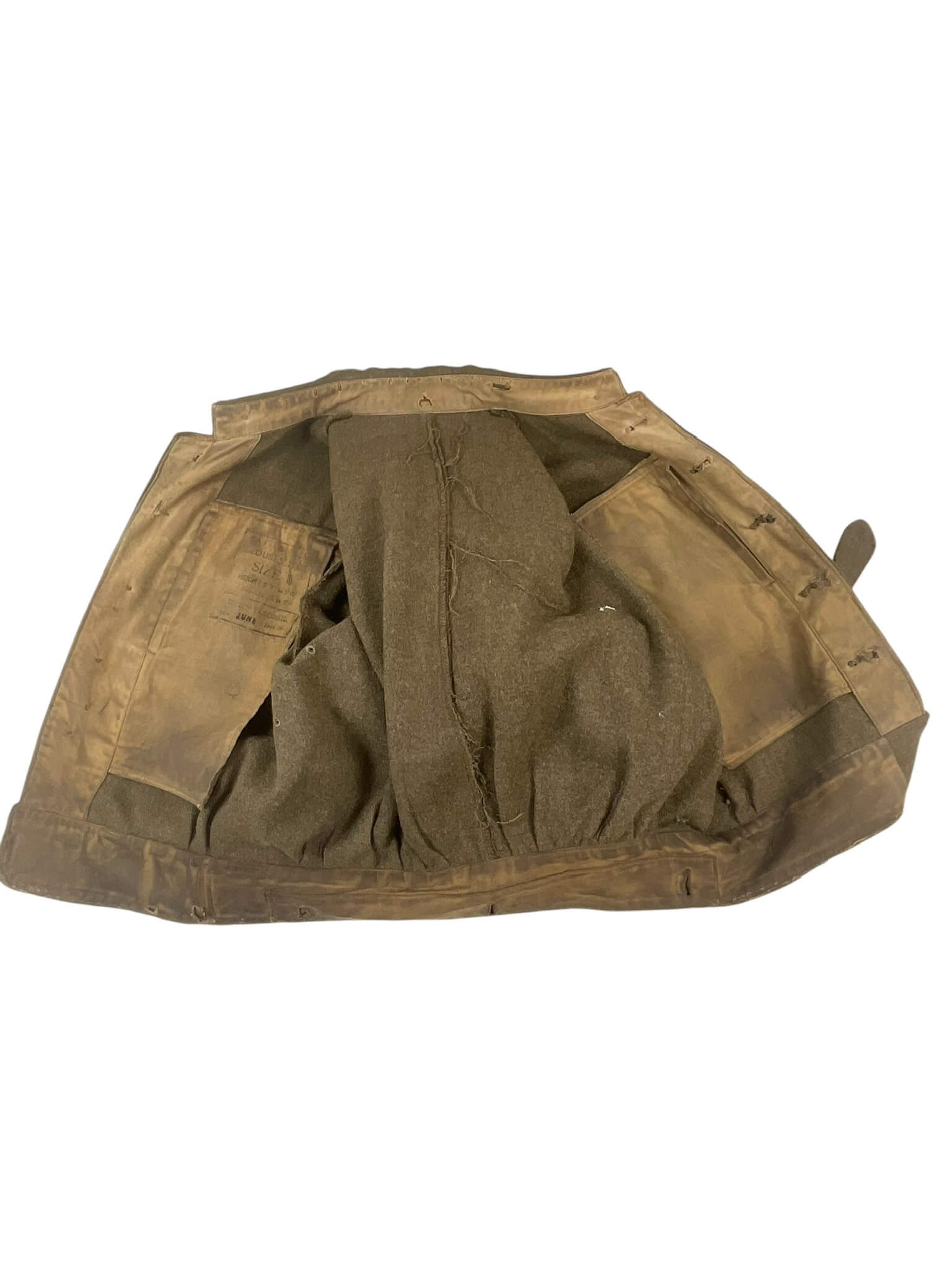 The WW2 Canadian Army Battledress, Size 10, dated 1944, is a standard-issue uniform jacket used by Canadian forces during the Second World War. Constructed from durable wool serge in a khaki brown shade, this battledress reflects the practical design adopted by Commonwealth militaries of the era. The jacket features a button front closure, two pleated chest pockets with buttoned flaps, epaulettes, and concealed waist adjustment tabs. The inside is stamped with the size designation “10” and manufacturer markings, along with the 1944 production date, indicating wartime manufacture. Such battledress uniforms were worn both in training and combat, including by units participating in major campaigns in Europe. This example offers a representation of standard Canadian military attire during the mid-war period, illustrating the materials, construction, and features typical of 1940s service uniforms. The battledress remains of interest to collectors and those studying Canadian military history.
