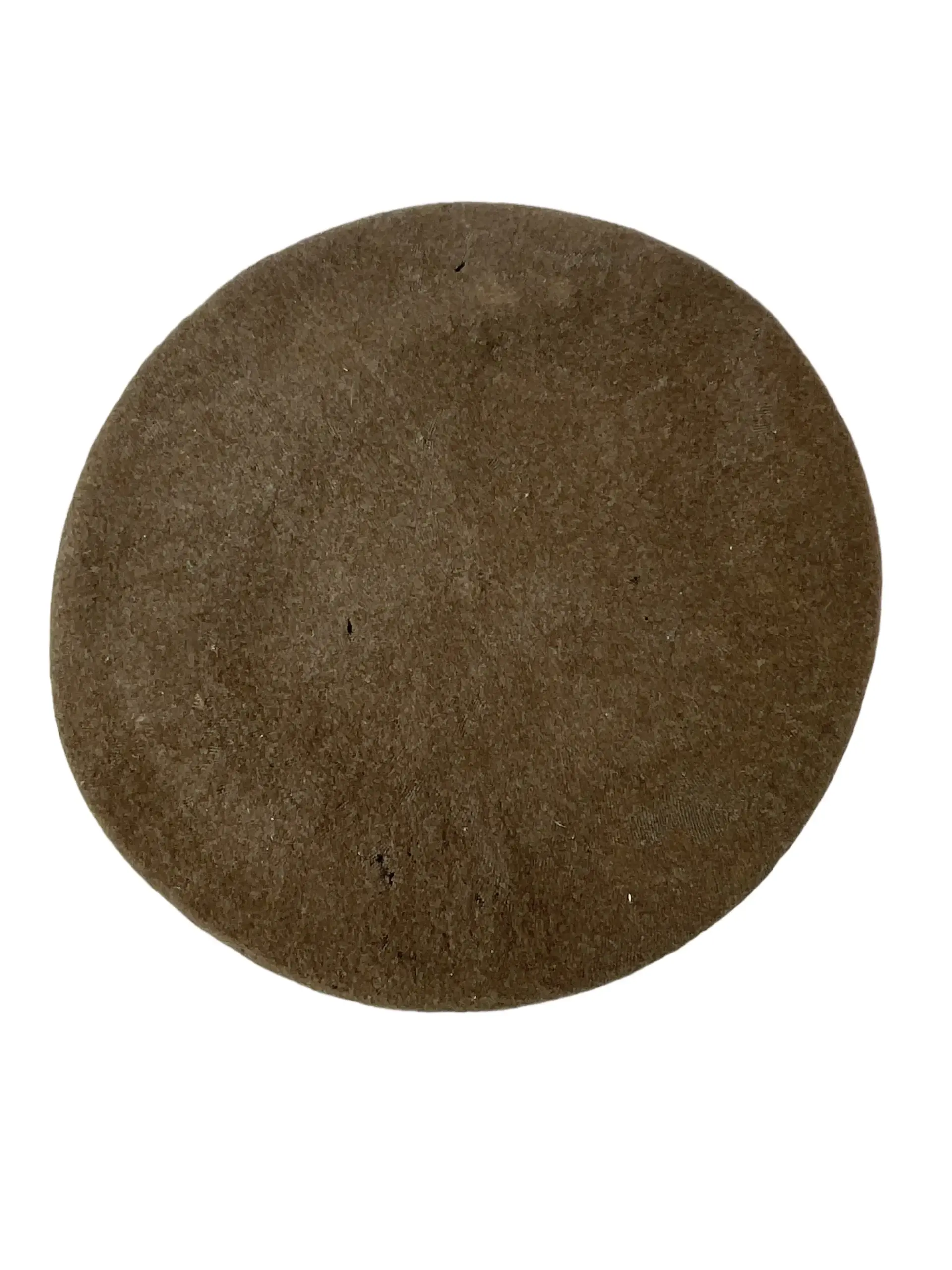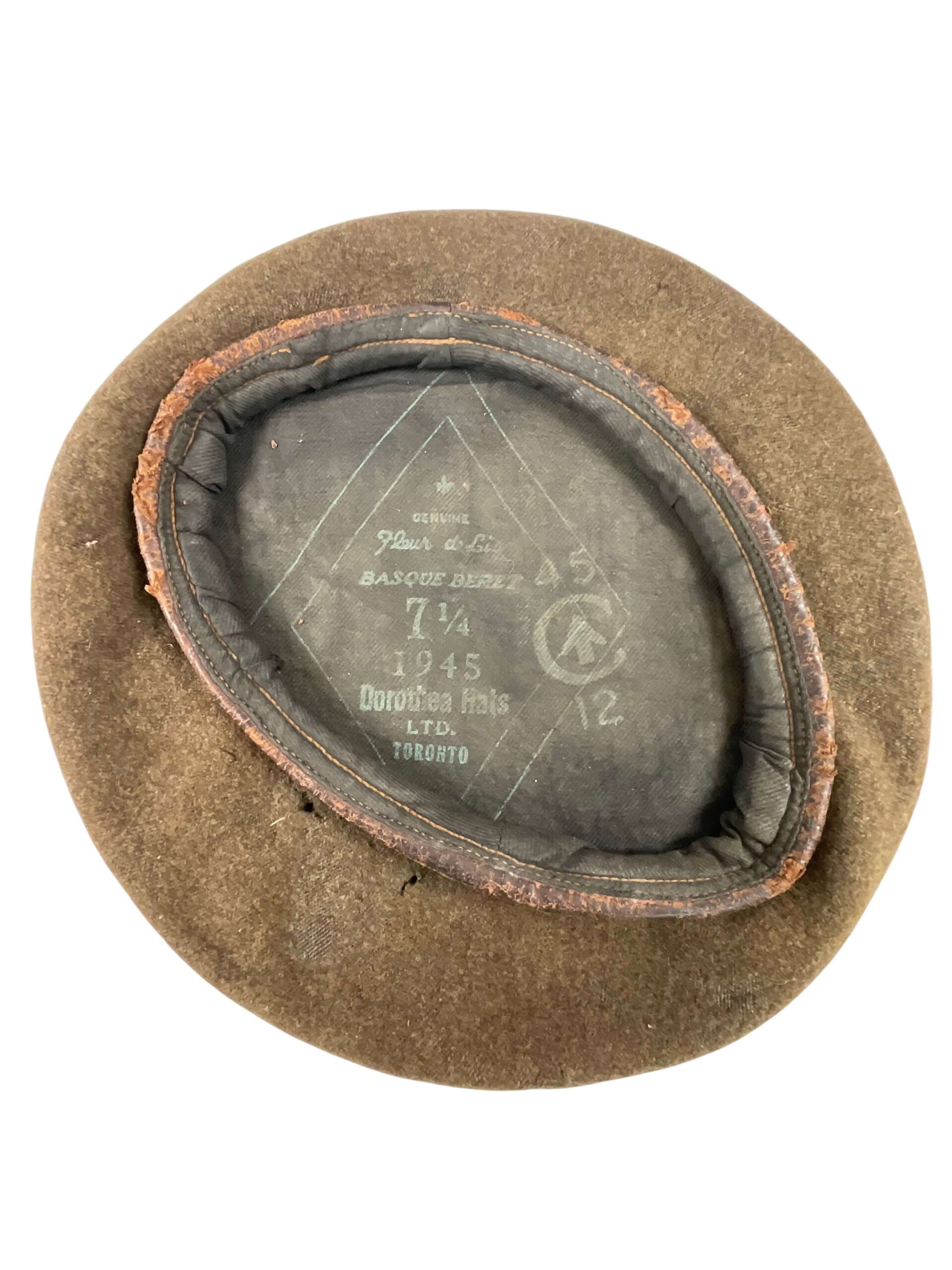 This item is an original World War II Canadian Army khaki beret, dated 1945. The beret is marked with the broad arrow stamp, indicating official military issue and Canadian government property. It is sized 7 1/4, suitable for a head circumference of approximately 58 centimeters. Constructed from khaki wool, this style of beret was standard issue to Canadian Army personnel during the latter part of the Second World War. The interior features a ribbon drawstring for adjustment and a marked lining, including manufacturer’s details, date, and broad arrow acceptance mark. Items such as this are indicative of standard Canadian Army uniform practices in late-war and immediate postwar years. The broad arrow mark and date confirm its authenticity as a period military artifact. This beret provides useful reference for collectors, researchers, and those interested in Canadian military uniforms and equipment of the 1940s. Condition is consistent with issued wartime examples.