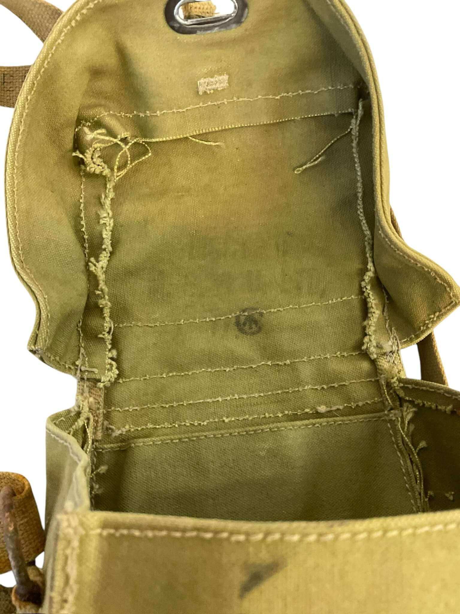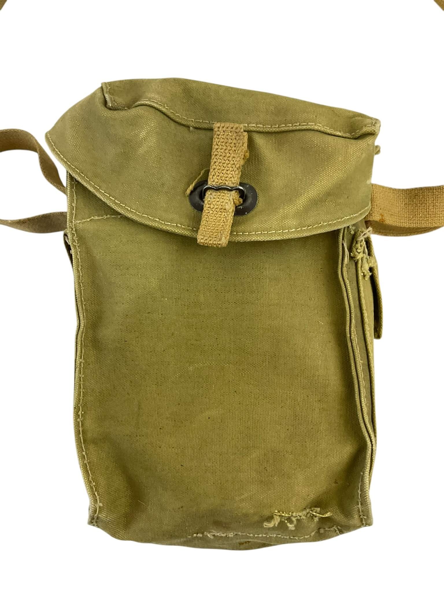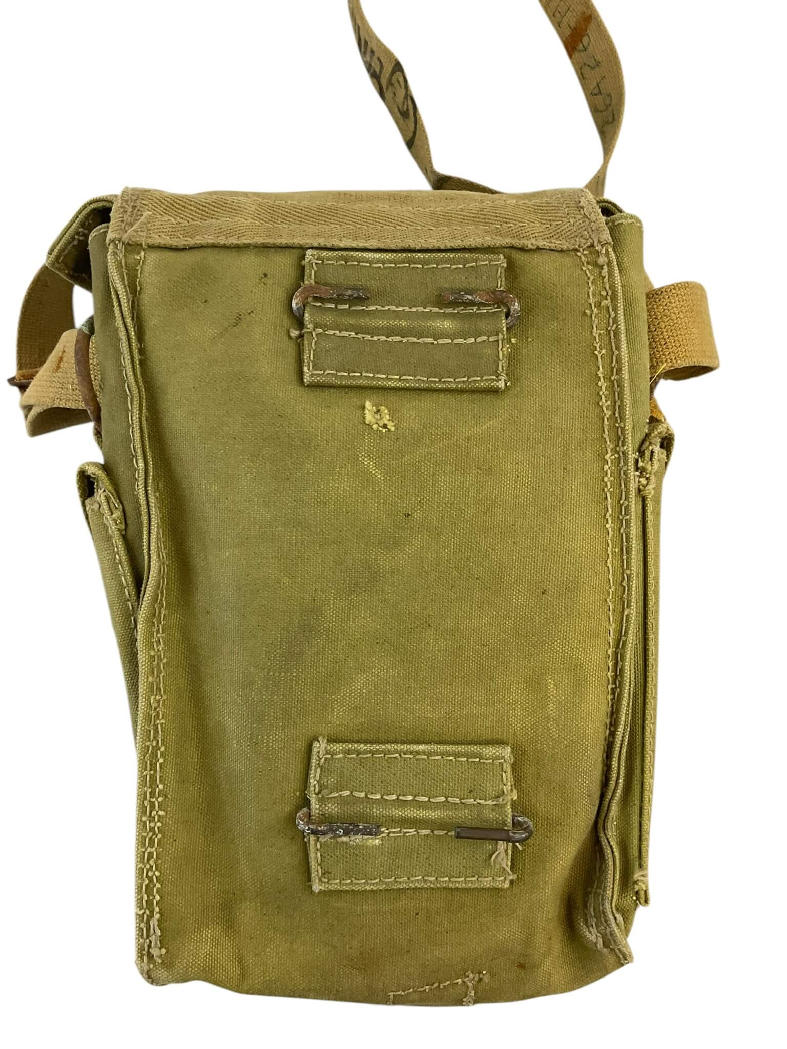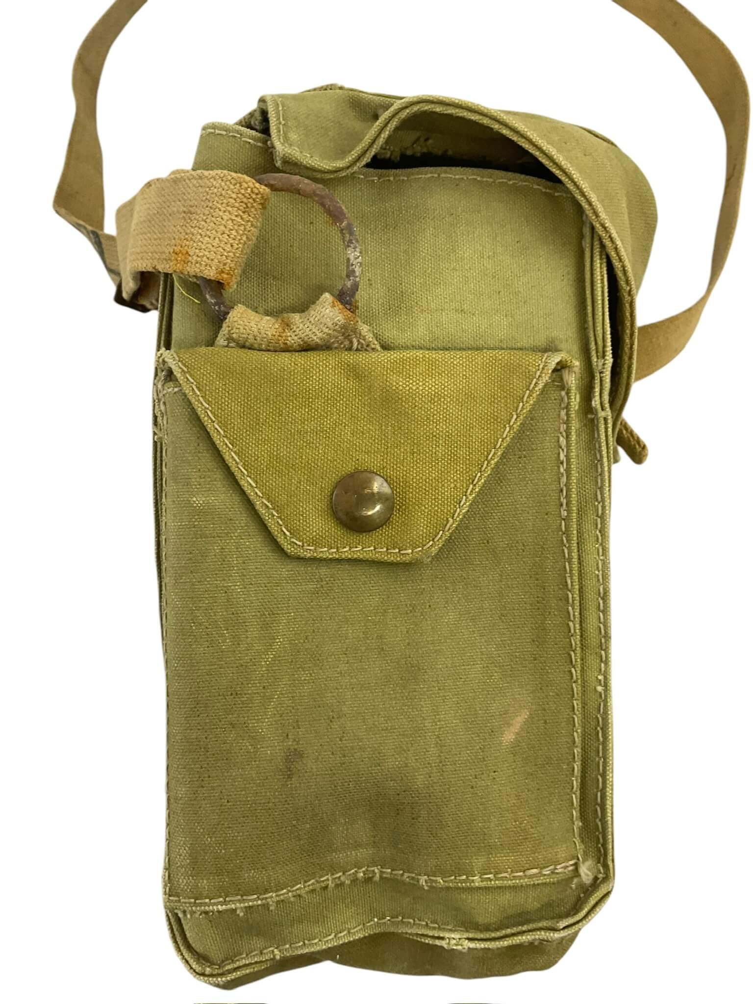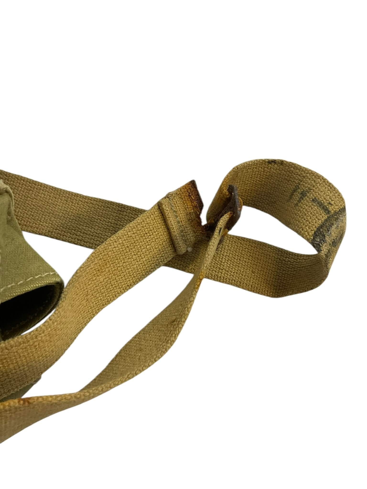 The ‘WW2 Canadian Army Light Respirator Bag C Broad Arrowed’ is an authentic piece of military memorabilia from World War II, specifically used by the Canadian Armed Forces. These bags were designed to hold gas masks, or ‘light respirators’, as they were often called during that time. The ‘C Broad Arrow’ marking is the distinctive symbol of the Canadian military, indicating the item was government property. Made from durable, weather-resistant materials, these bags were designed to withstand tough conditions on the battlefield. Characterized by a single strap for easy carrying and a secure closure, the bag ensured the mask was readily accessible during emergencies. This particular item would be a significant addition to a collection of military memorabilia or for anyone interested in World War II history.
