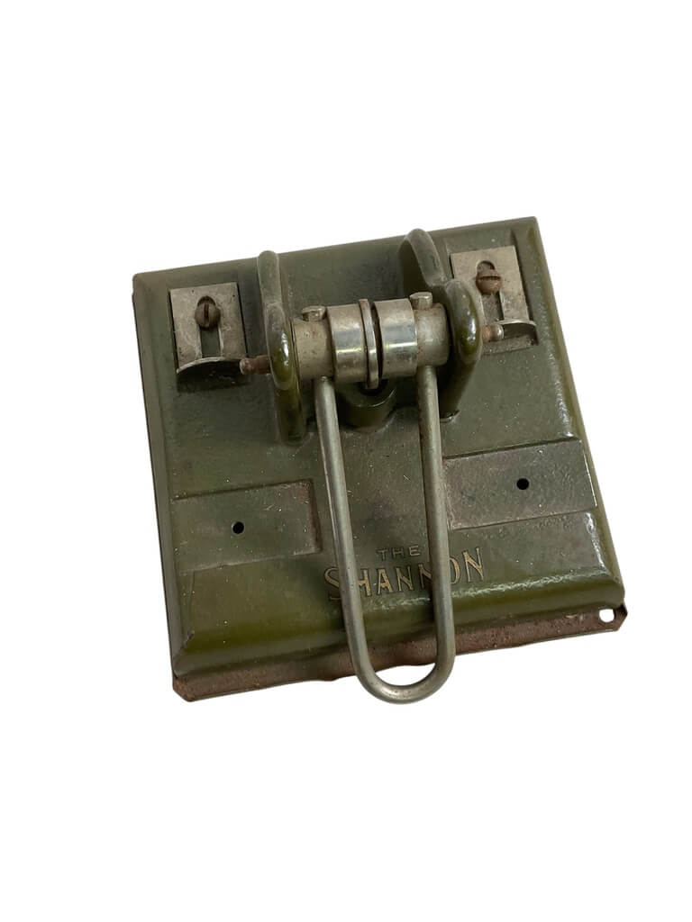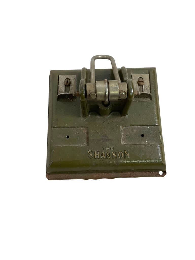 The WW2 Canadian Army Office The Shannon One Hole Punch is a functional historical artifact. Made primarily from sturdy metal, this vintage office tool was typically used by the Canadian Army during World War 2. Its integral design features a lever-press mechanism designed to easily puncture through paper.