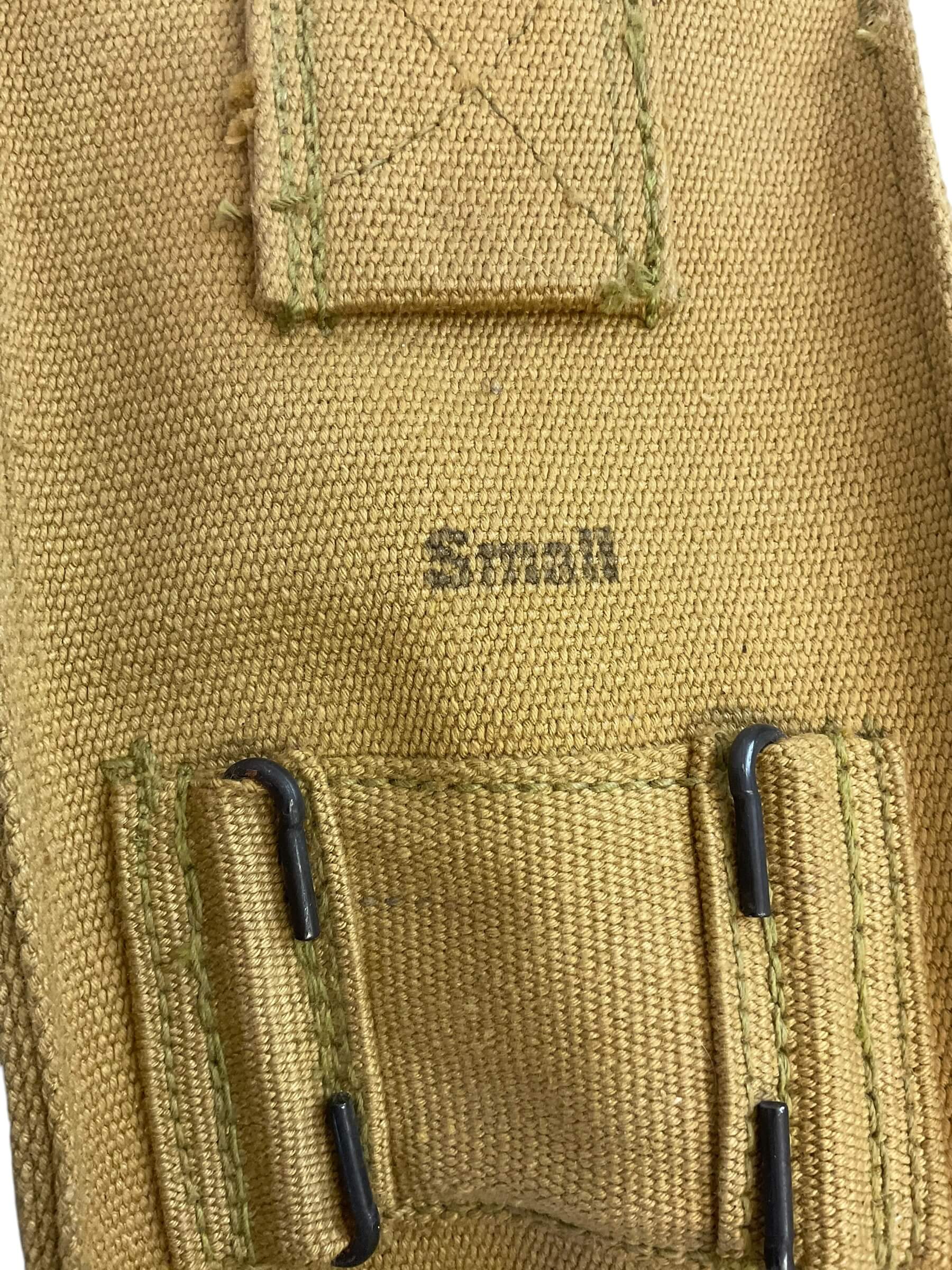 This title refers to a pair of WW2 Canadian Army P37 small basic pouches, marked with the distinctive ‘C’ Broad Arrow symbol. These pouches were an integral part of the Pattern 37, the standard webbing equipment used by the Canadian Army throughout the Second World War. These pouches were typically used to carry ammunition and other essential items. The ‘C’ Broad Arrow was the mark used by the Canadian government to signify that an item was government property. Its presence on these pouches authenticates them as genuine military issue. The pouches are not only a rare find for collectors of military memorabilia but also a symbol of Canadian soldiers’ contribution to the significant historical event.