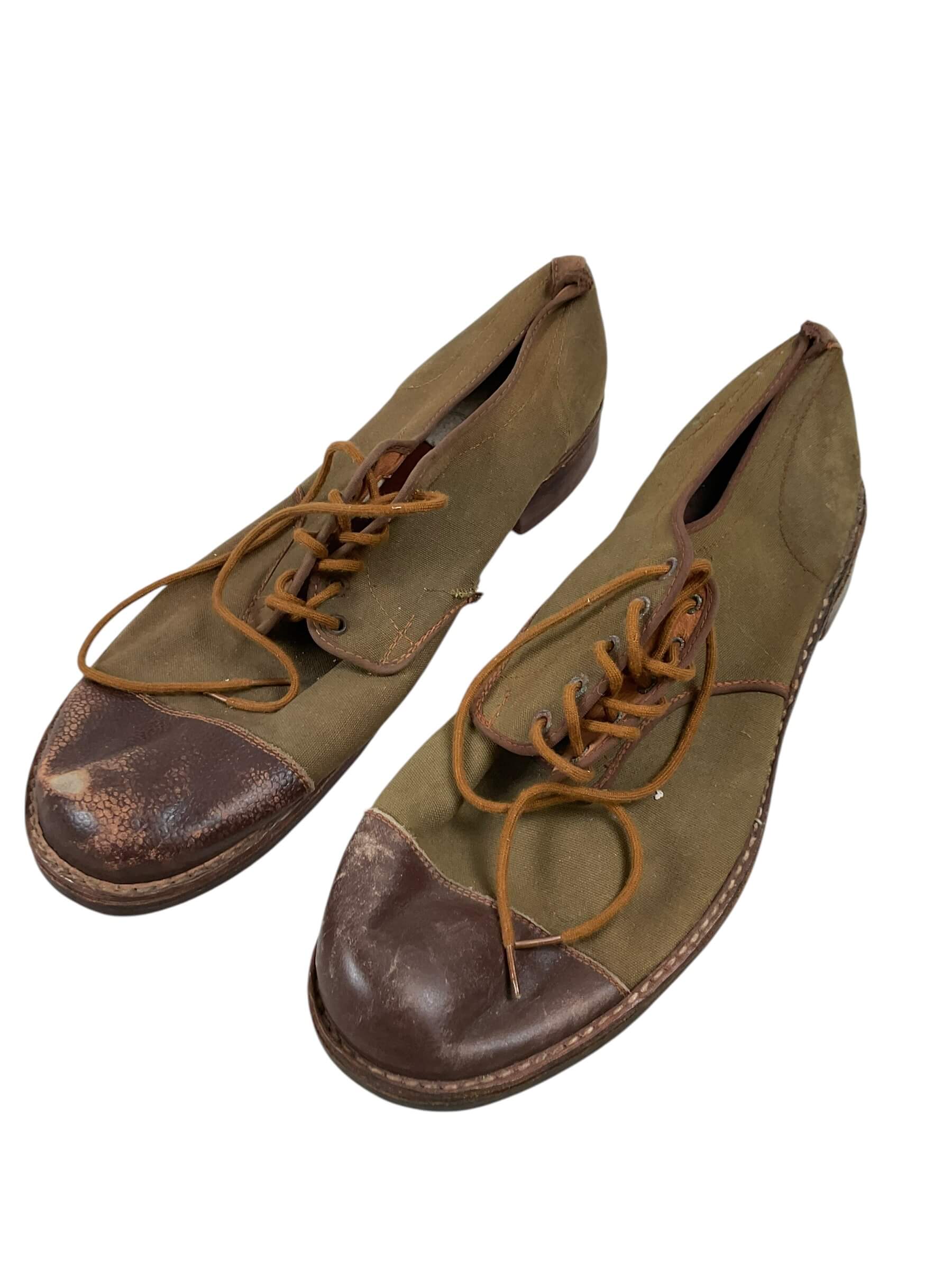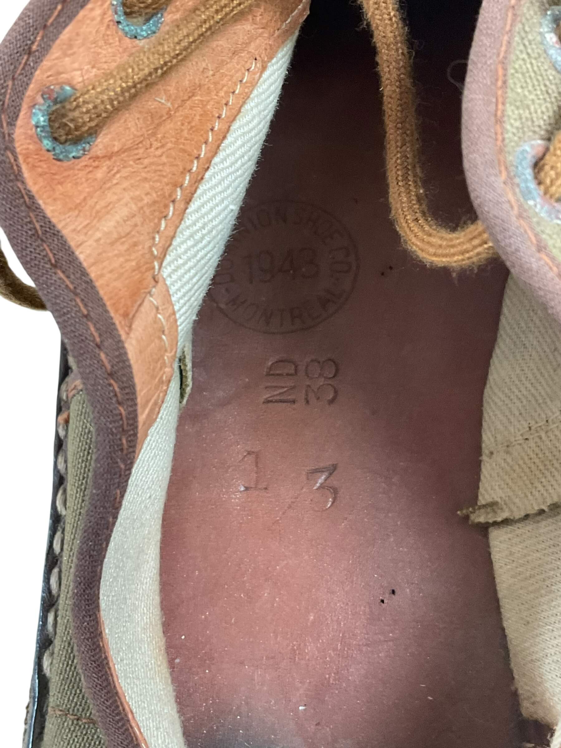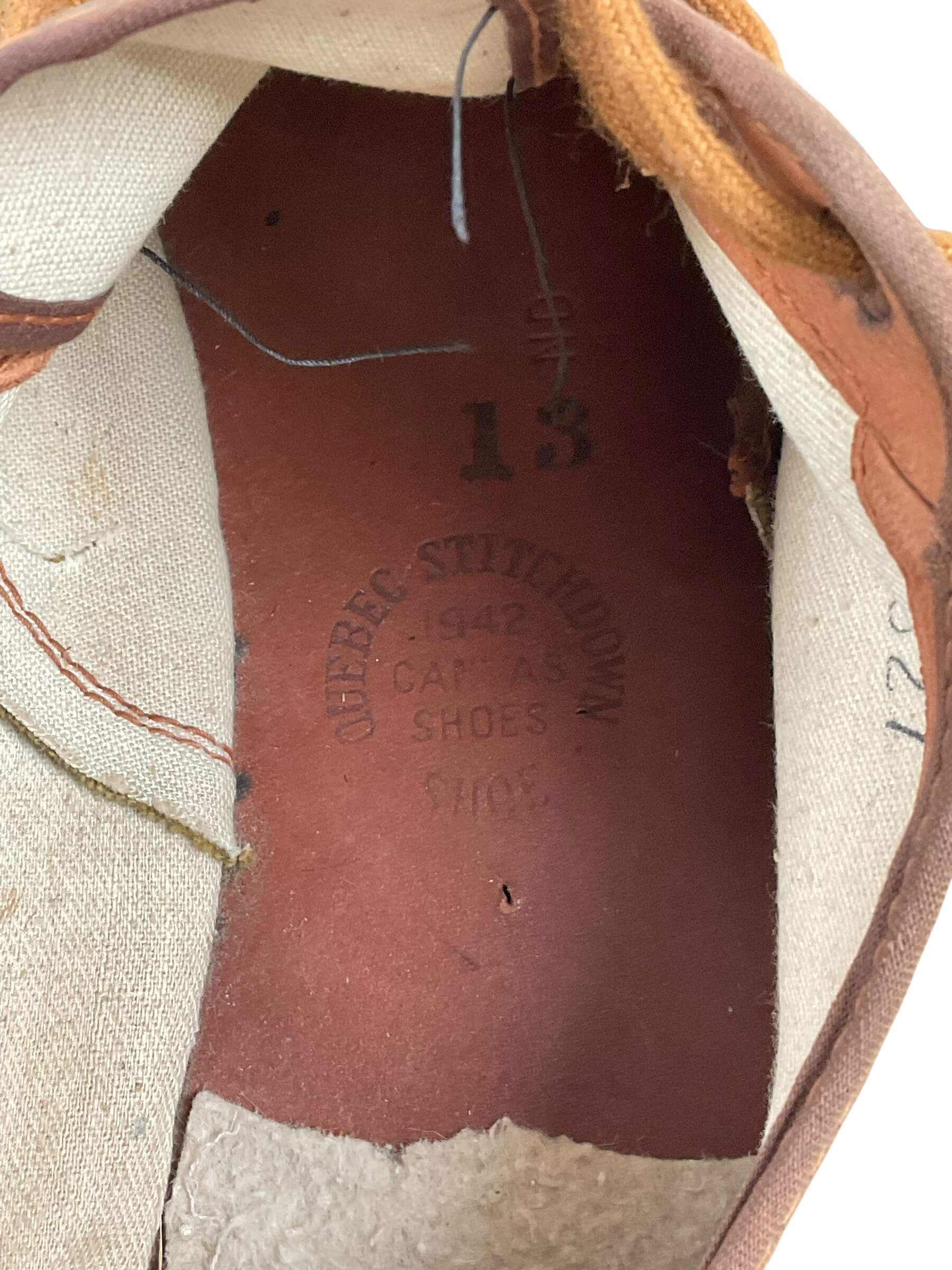 WW2 Canadian Army PT Shoes Plimsolls Size 13 Dated 1942 These physical training (PT) shoes are an original Canadian Army issue from the Second World War, dated 1942. Commonly referred to as plimsolls, this pair is marked as size 13, suitable for larger foot sizes among military personnel. The shoes feature a canvas upper with reinforced toe and heel sections and a vulcanized rubber sole, reflecting typical construction standards for military athletic footwear of the period. Lacing is provided by a series of metal eyelets, allowing for a secure fit during training and exercise. Each shoe is stamped with manufacturing and date markings, verifying their wartime production. PT shoes such as these were issued for use during physical training, marching, and camp activities rather than field operations. Items of this type offer insight into the daily routines and logistical provisioning of the Canadian Army during World War II. These plimsolls are an example of wartime standard-issue equipment.