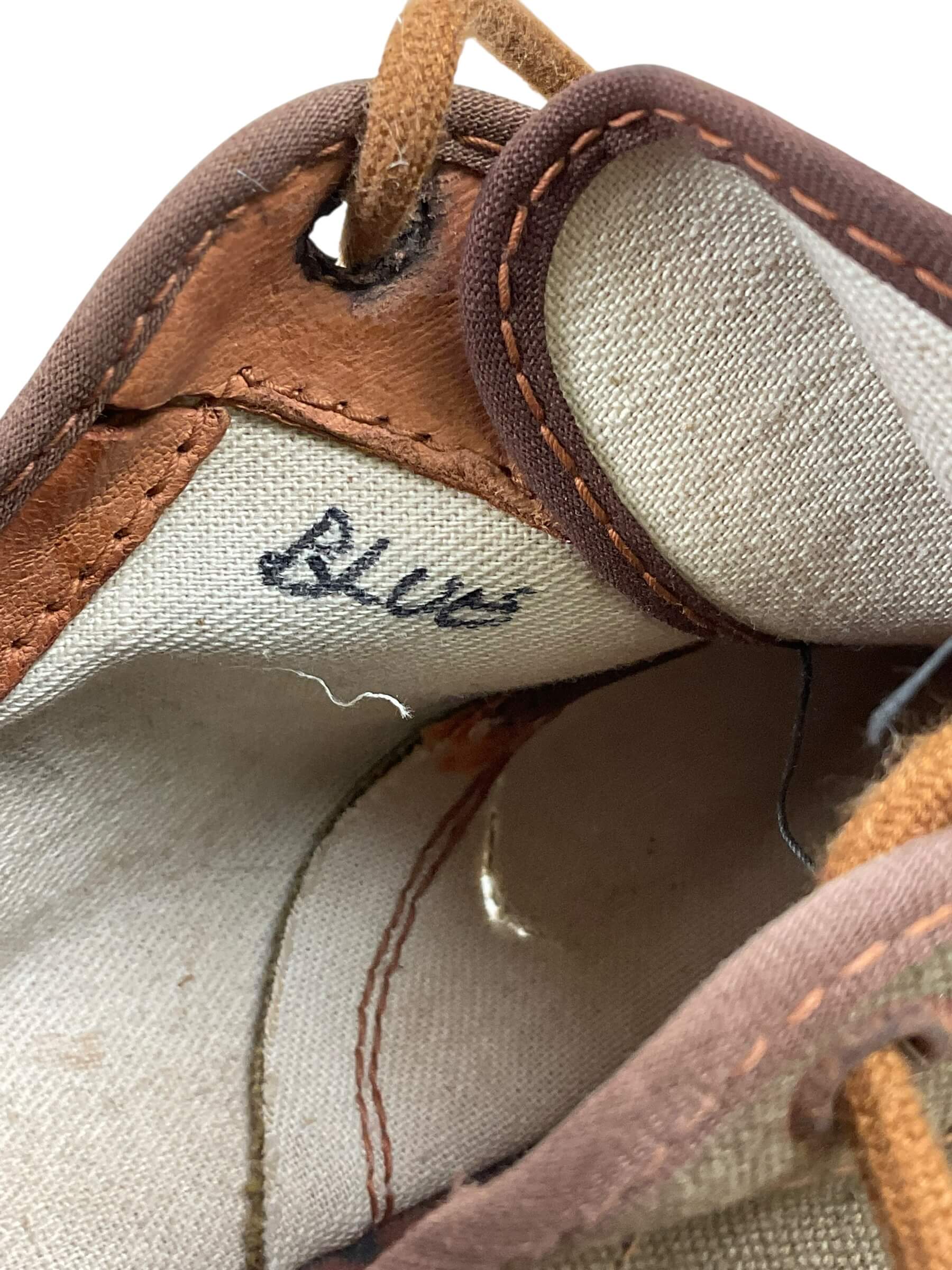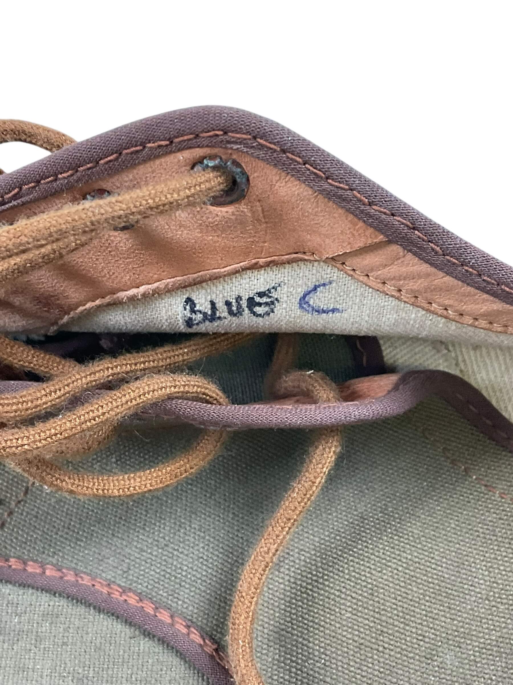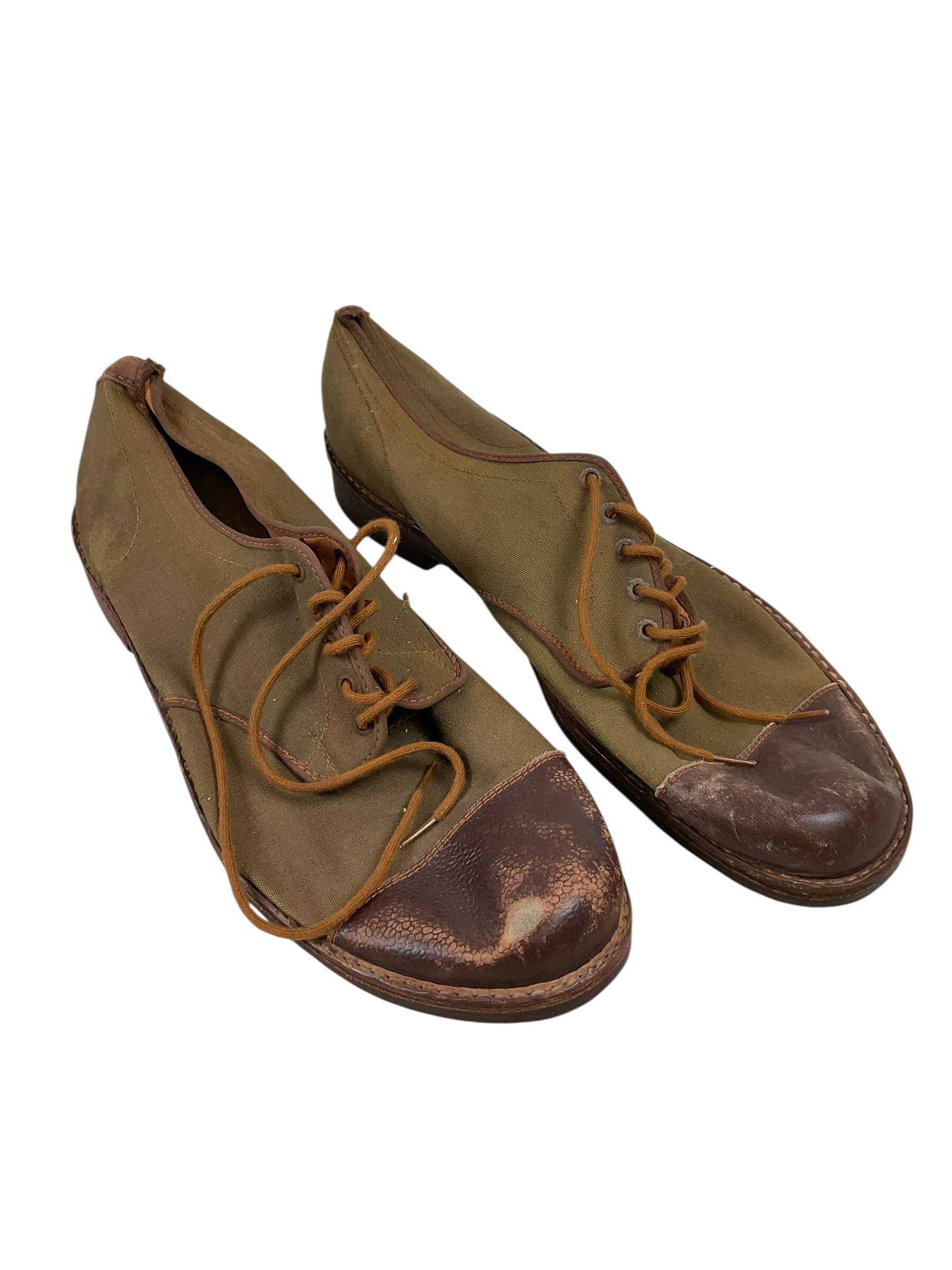 WW2 Canadian Army PT Shoes Plimsolls Size 13 Dated 1942 These physical training (PT) shoes are an original Canadian Army issue from the Second World War, dated 1942. Commonly referred to as plimsolls, this pair is marked as size 13, suitable for larger foot sizes among military personnel. The shoes feature a canvas upper with reinforced toe and heel sections and a vulcanized rubber sole, reflecting typical construction standards for military athletic footwear of the period. Lacing is provided by a series of metal eyelets, allowing for a secure fit during training and exercise. Each shoe is stamped with manufacturing and date markings, verifying their wartime production. PT shoes such as these were issued for use during physical training, marching, and camp activities rather than field operations. Items of this type offer insight into the daily routines and logistical provisioning of the Canadian Army during World War II. These plimsolls are an example of wartime standard-issue equipment.