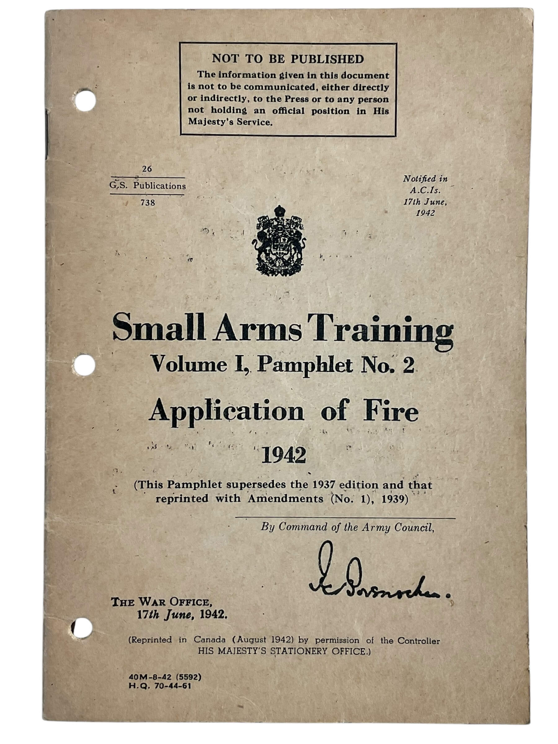 The “WW2 Canadian Army Small Arms Training Application of Fire Vol 1 P No 2” is an original training manual issued during the Second World War. Produced for the Canadian Army, this manual provides detailed instruction on the principles and practical application of small arms fire. It covers topics essential for soldiers’ proficiency with service weapons, including marksmanship techniques, firing positions, and the fundamentals of ballistic performance
