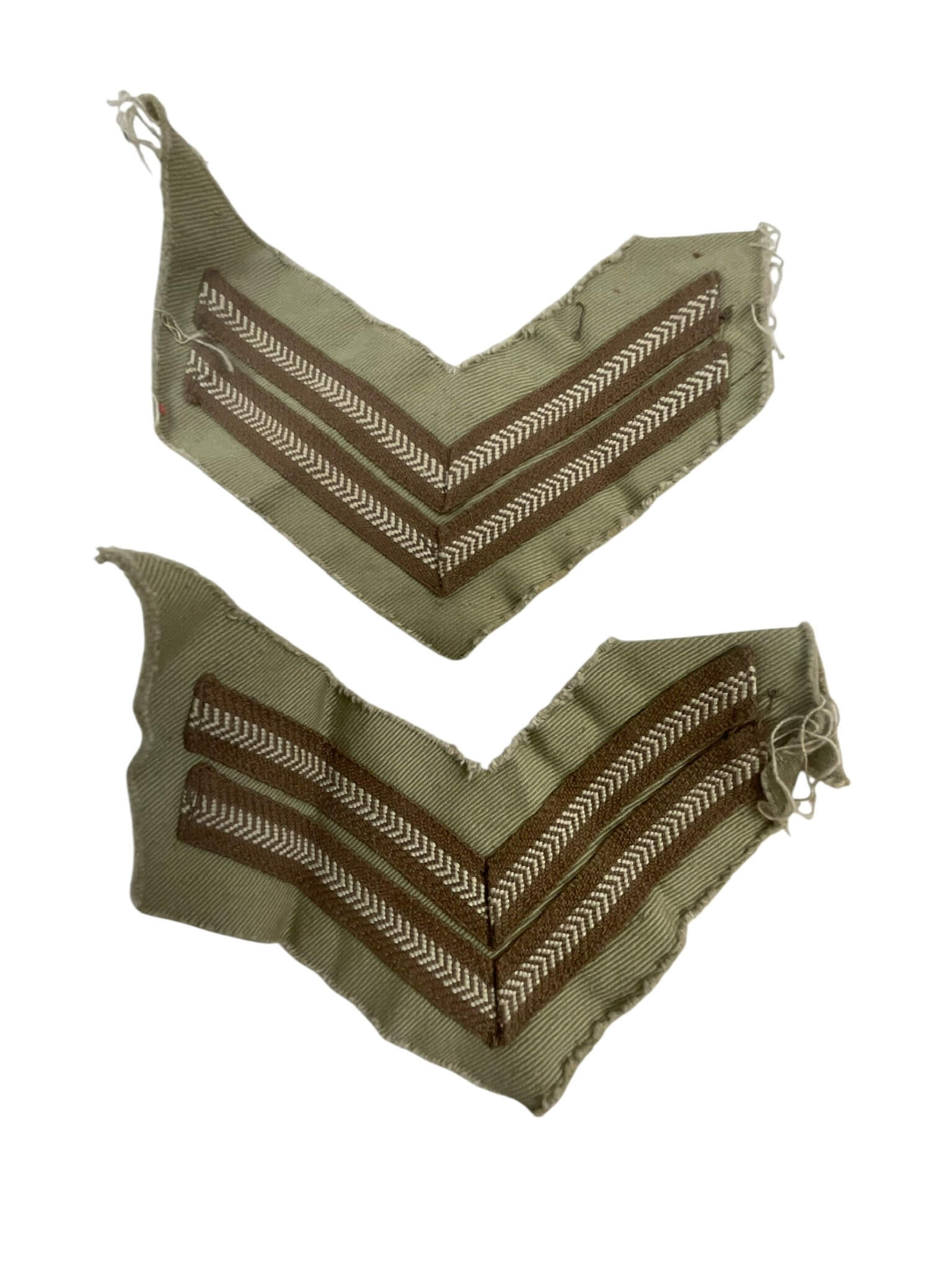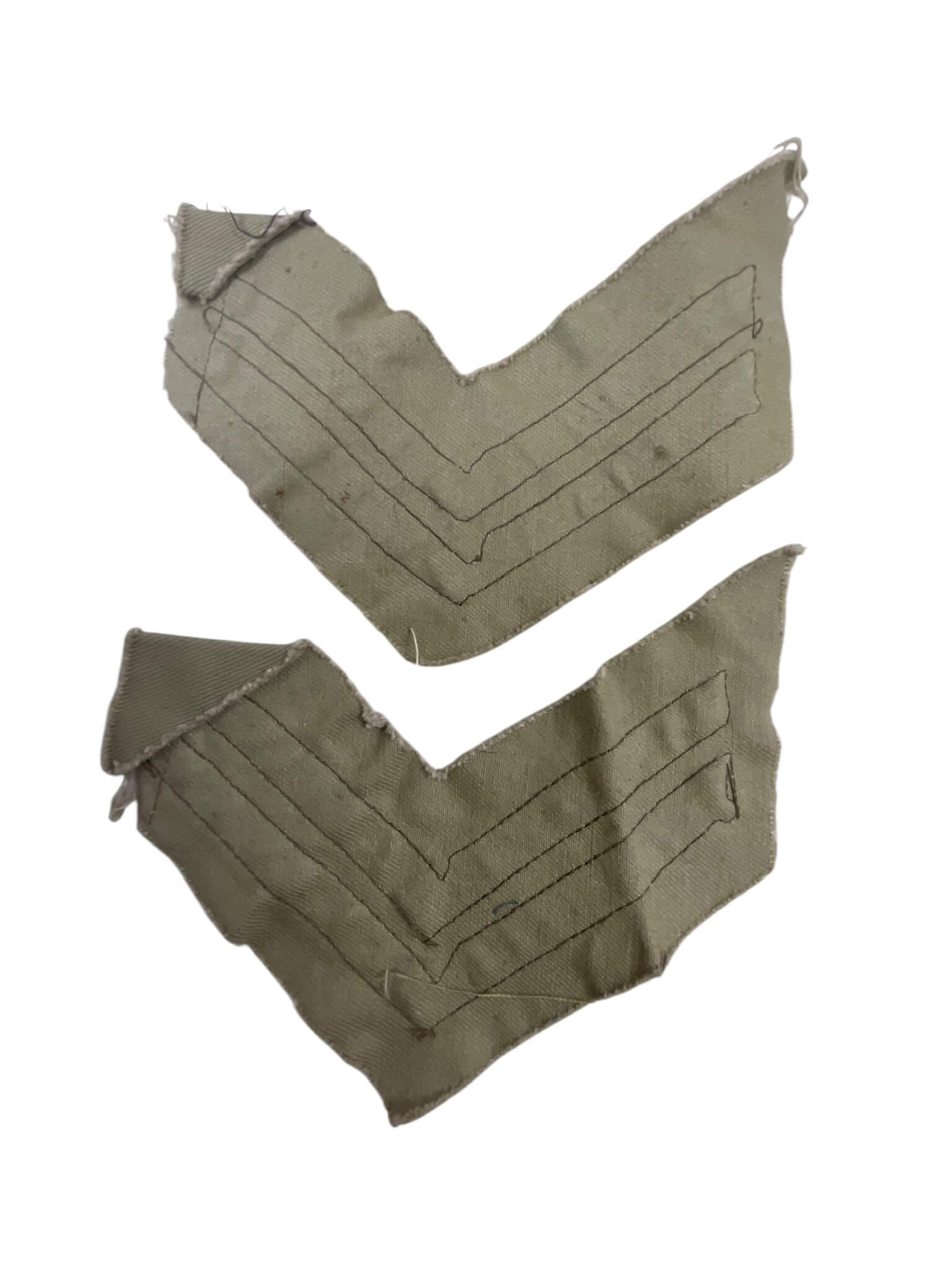 This item consists of a matching pair of World War II Canadian Army corporal rank insignia intended for tropical uniforms. The insignia are constructed from khaki cloth, suitable for use in warmer climates and designed for wear on the sleeves of battle dress or service dress uniforms issued to personnel serving in overseas or colonial environments. Each insignia features two chevrons, machine-stitched in brown thread onto the khaki background, denoting the rank of corporal. Such insignia were worn by non-commissioned officers and played an important role in indicating authority and maintaining the rank structure within Canadian Army units deployed to regions such as the Mediterranean or Southeast Asia. These patches reflect standard wartime manufacturing practices, using durable materials suited to tropical conditions. The pair is representative of the period’s Canadian military insignia and illustrates the adaptations made in uniform design for operations in diverse climates during World War II.