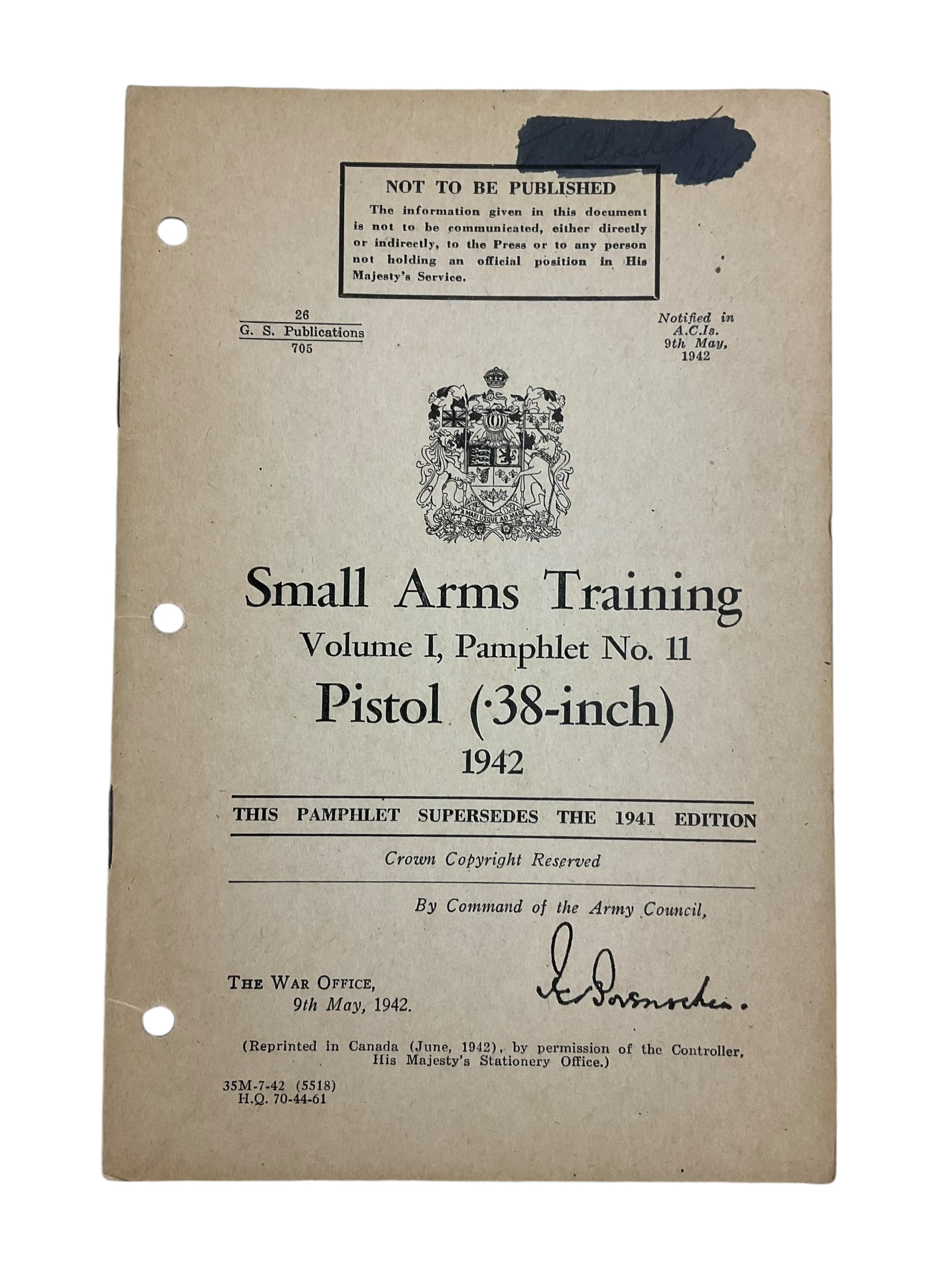 WW2 Canadian Army Vol 1 No. 11 Pistol (.38-inch) 1942 Training Manual