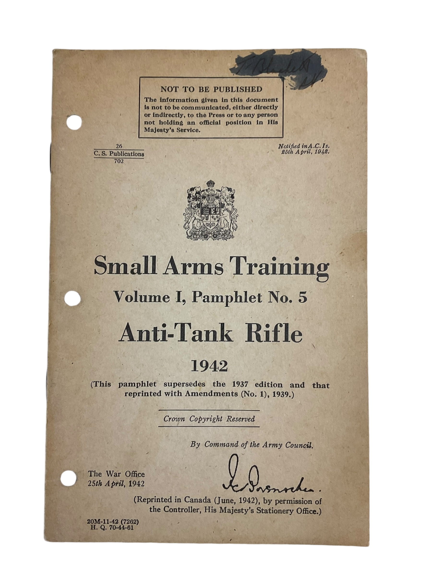 WW2 Canadian Army Vol 1 No. 5 Anti-Tank Rifle 1942 Training Manual