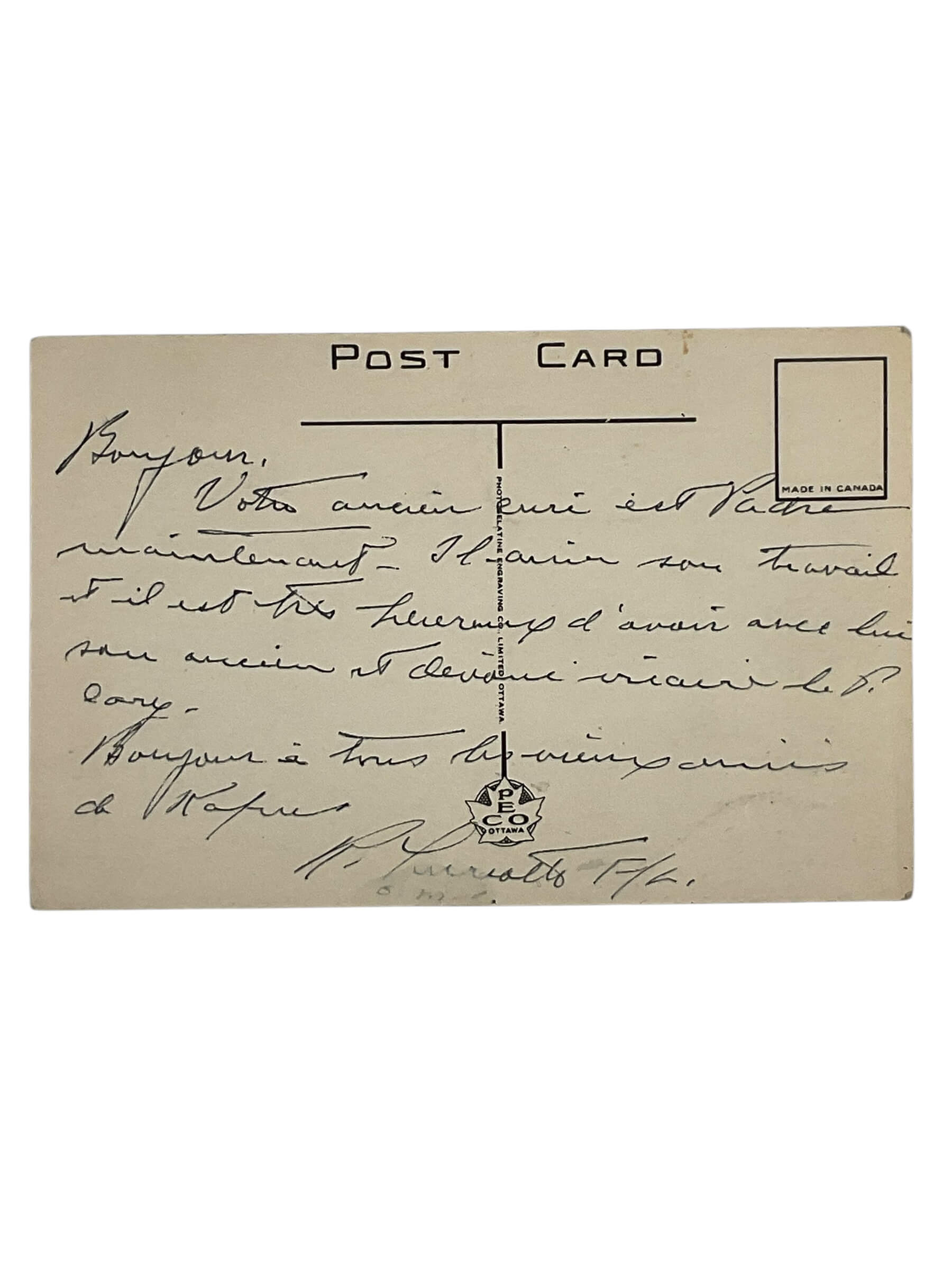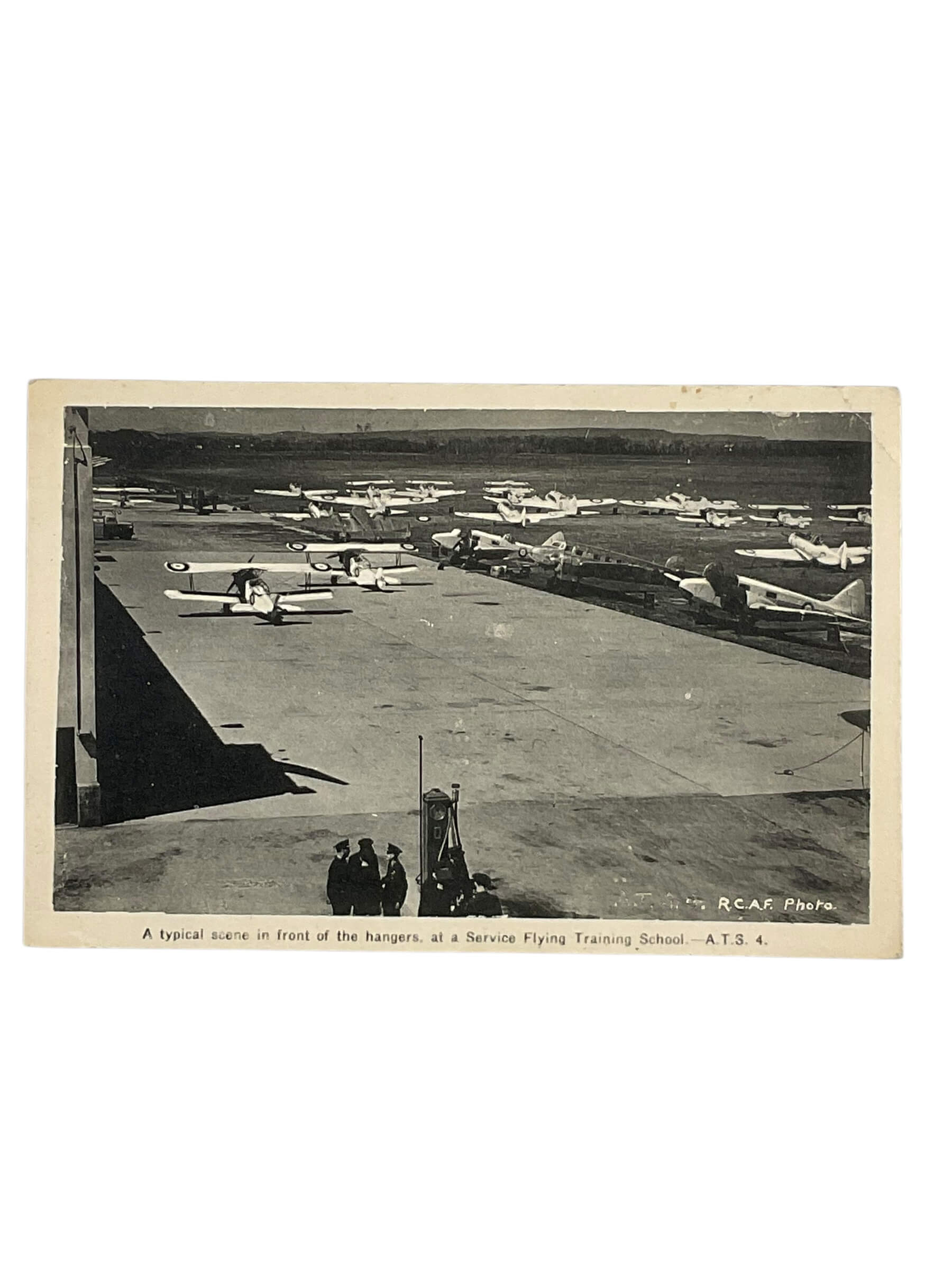 This item is a vintage postcard photograph measuring 3 1/2 inches by 5 1/2 inches, depicting a World War II-era scene associated with the British Commonwealth Air Training Plan (BCATP) in Canada. The image features personnel, aircraft, or facilities connected to a Canadian Service Training School, institutions established to train aircrew and support staff for the Allied war effort. The BCATP, a major component of the Commonwealth’s air training initiatives, operated across Canada from 1939 to 1945 and played a significant role in preparing pilots, navigators, and air gunners for overseas service. Postcards of this type were commonly produced during the period as keepsakes and as a means for service members to communicate with family and friends. The postcard displays period photographic techniques and may bear period-specific inscriptions, postmarks, or publisher details on the reverse side. It is representative of wartime Canadian military history and photographic documentation.