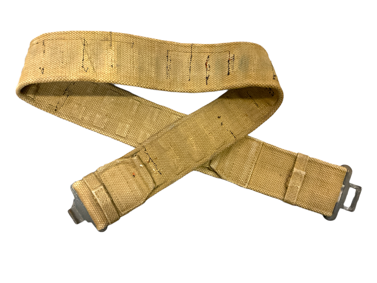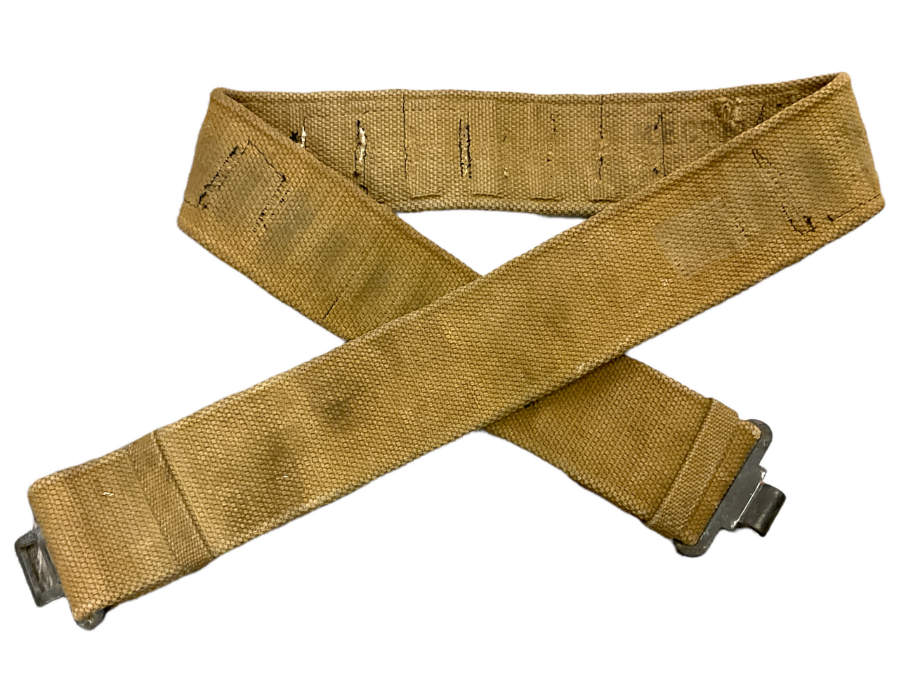 The WW2 Canadian British Economy Pattern P37 Web Belt, dated 1943, represents a significant piece of military history. This vintage belt is part of the Pattern 1937 (P37) webbing equipment, which was widely used by Canadian and British forces during World War II. Constructed from durable webbed fabric, the belt showcases the practical design and robust materials that were essential for the rigors of wartime. The 1943 date signifies its production during the height of the conflict, adding historical value and authenticity. This belt is not only an outstanding example of military gear from the period but also a collectible item for enthusiasts of World War II memorabilia, historians, or reenactors. Its condition and markings provide a tangible connection to the past, reflecting the ingenuity and resilience of the soldiers who depended on such equipment in the field.