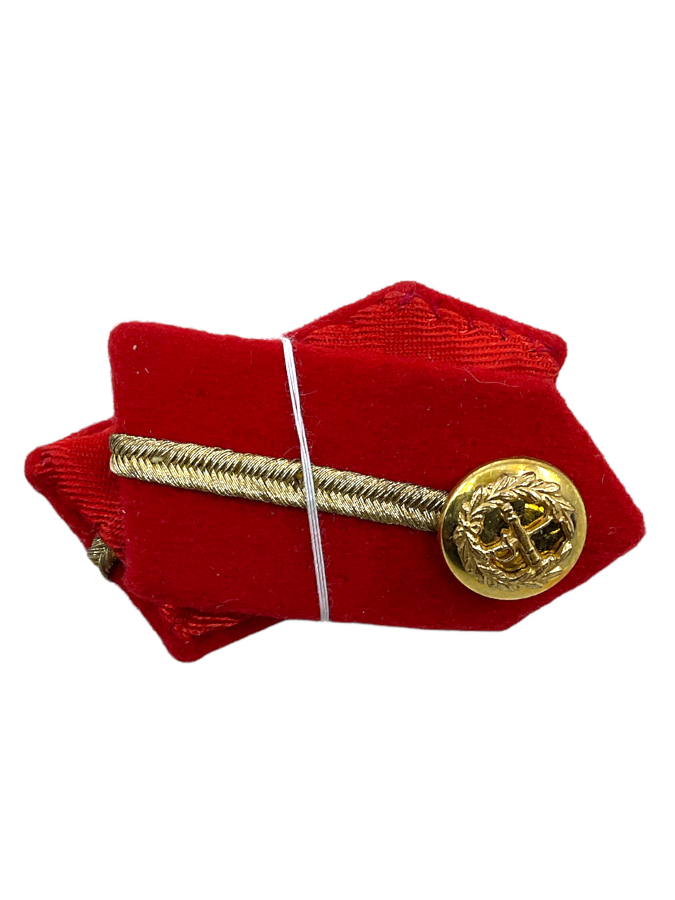 This exquisite pair of WW2 Canadian British Field Marshall Gorget patches is a remarkable representation of military history and craftsmanship. Tailor-tied with precision, these gorgets were once proudly worn by high-ranking officers, symbolizing authority and leadership. The meticulous design features the distinctive insignia associated with Field Marshalls, showcasing intricate embroidery and quality materials, characteristic of the period’s military regalia. These historical artifacts not only provide a glimpse into the sartorial standards of the time but also represent the esteemed tradition and dedication of the Canadian and British armed forces during World War II. Ideal for collectors and history enthusiasts alike, this pair of gorgets stands as a testament to the valor and commitment of the officers who wore them. Whether displayed as a centerpiece in a collection or studied for its historical significance, this Field Marshall Gorget pair is a valuable and captivating piece of WW2 memorabilia.