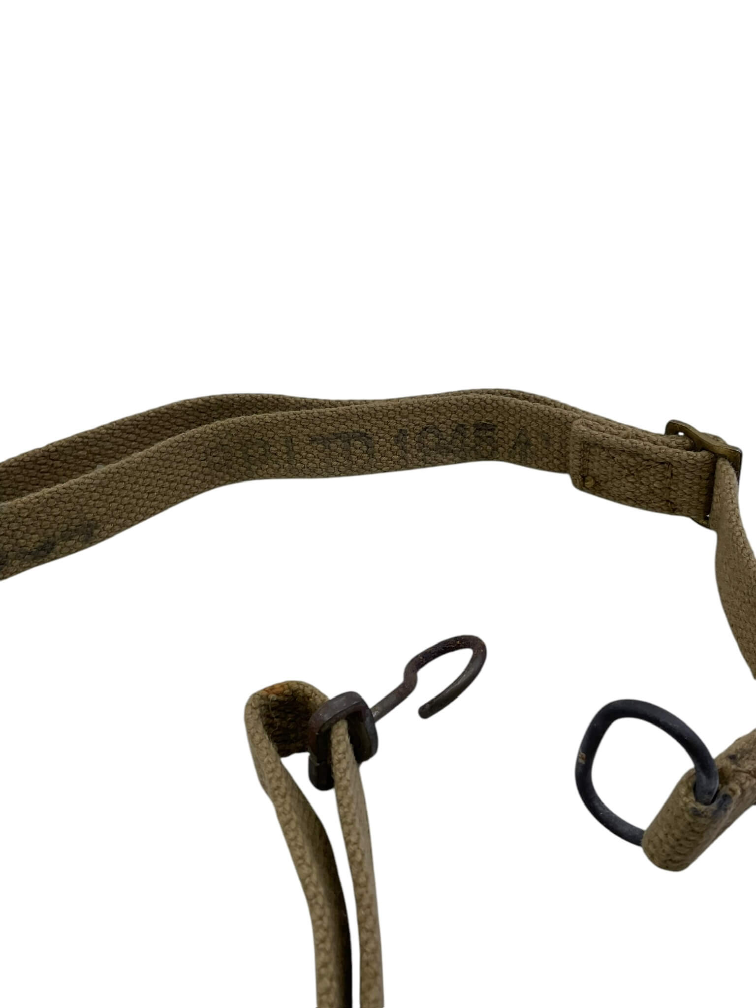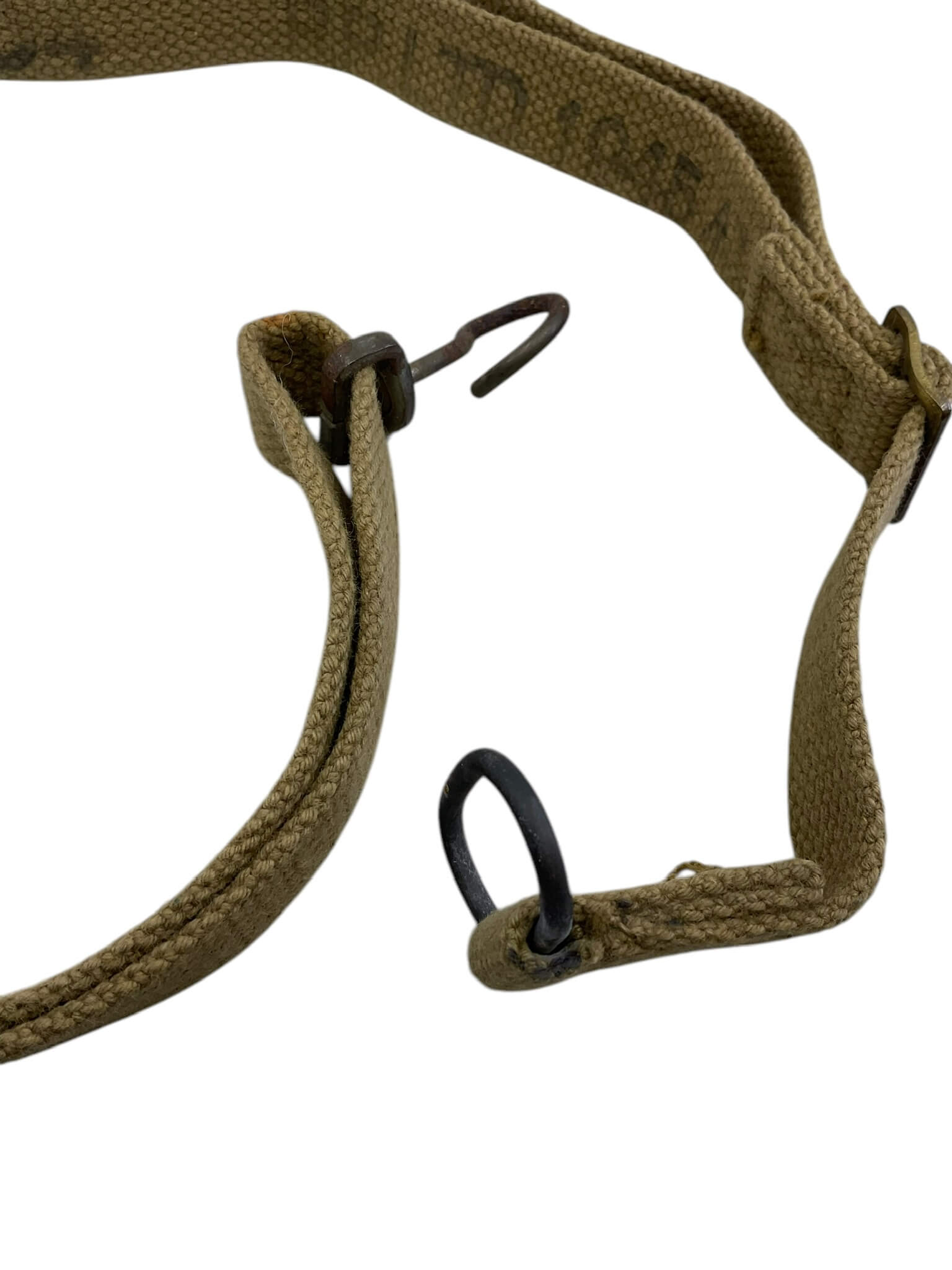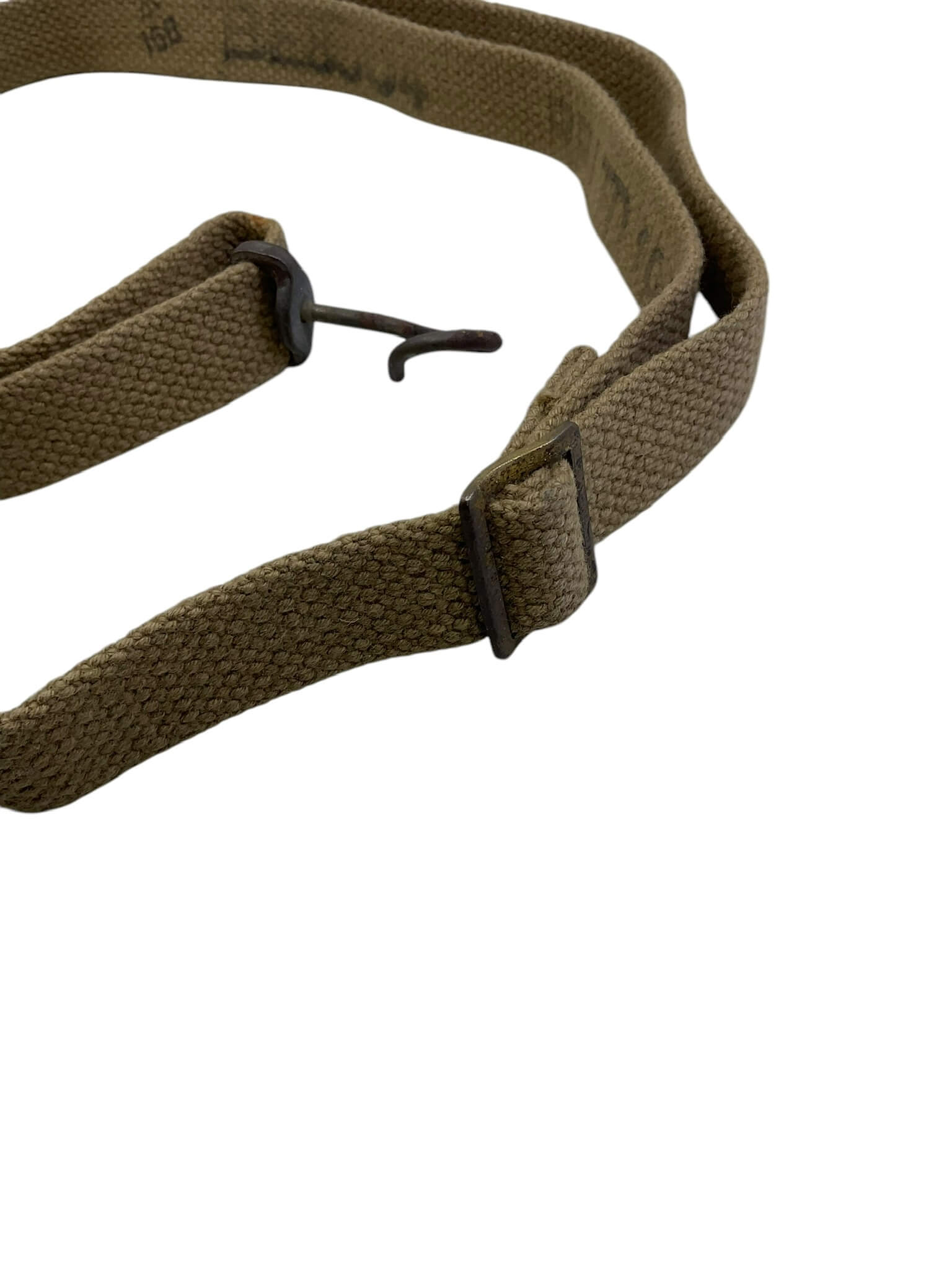 The ‘WW2 Canadian British P37 Web Sten Carry Sling Riveted Strap’ is a military-grade accessory that was extensively used during the Second World War. This authentic piece of history was primarily manufactured for Canadian and British soldiers. The P37 refers to the Pattern 37, a standardised web equipment produced by the British Army, and it was specifically designed for carrying the Sten submachine gun, a key weapon during the war. The strap is made of a durable webbing material and features riveted construction for increased durability and strength. The adjustable sling allowed for comfortable and convenient carrying of the weapon during long marches or active combat. This carry sling riveted strap is not only a practical tool but also a significant collectible item for those interested in military history.
