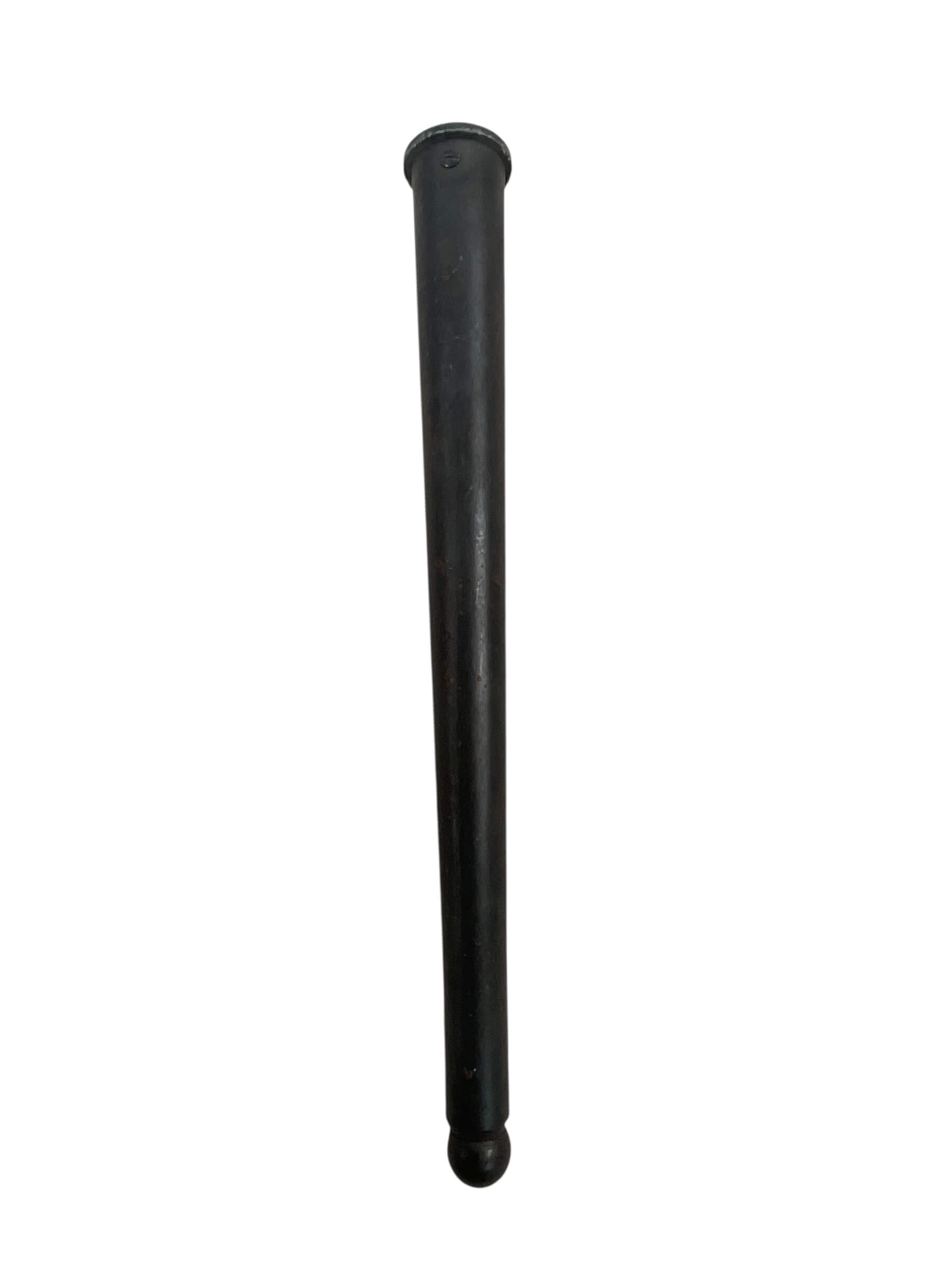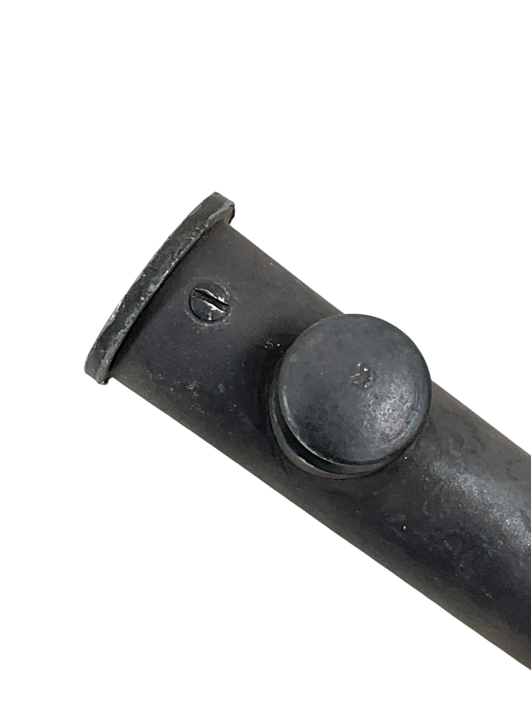 This item is a World War II era Canadian/British spiked bayonet scabbard, offered here without the bayonet. Designed to house the No. 4 Mk II-style spiked bayonet, the scabbard is constructed from metal with a blued or painted finish for durability and corrosion resistance. It features a crimped seam running the length of the body, and a metal mouthpiece for secure bayonet retention. The scabbard was typically attached to a standard-issue webbing frog for easy carrying by infantry personnel. Used by Canadian and British forces throughout the Second World War, these scabbards were standard military issue and are compatible with most variants of the spike bayonets produced during this period. Condition often reflects age and service use, with possible wear, markings, or light surface oxidation present. This scabbard is suited for collectors seeking to complete or restore an original spike bayonet set from the WWII era.