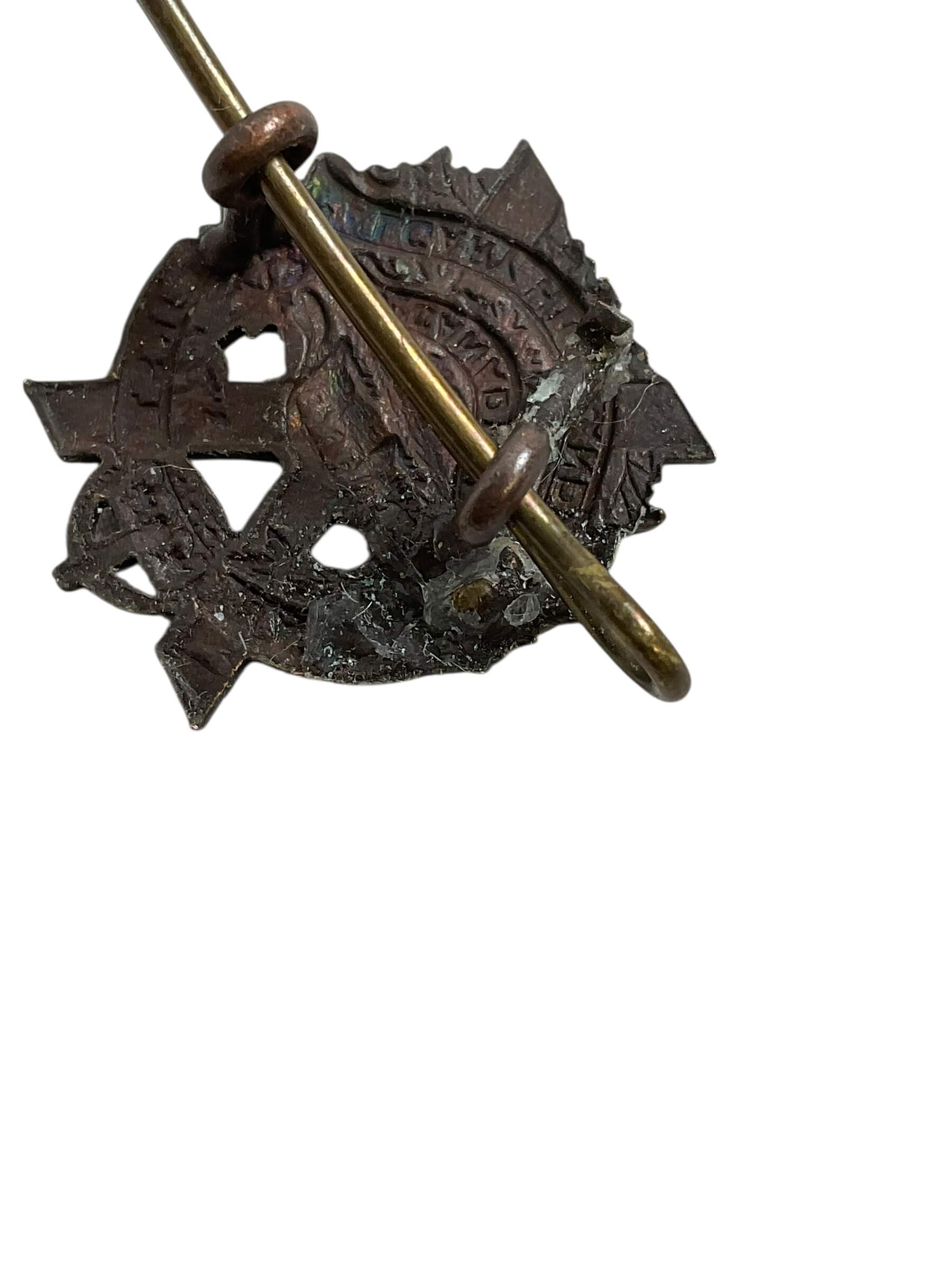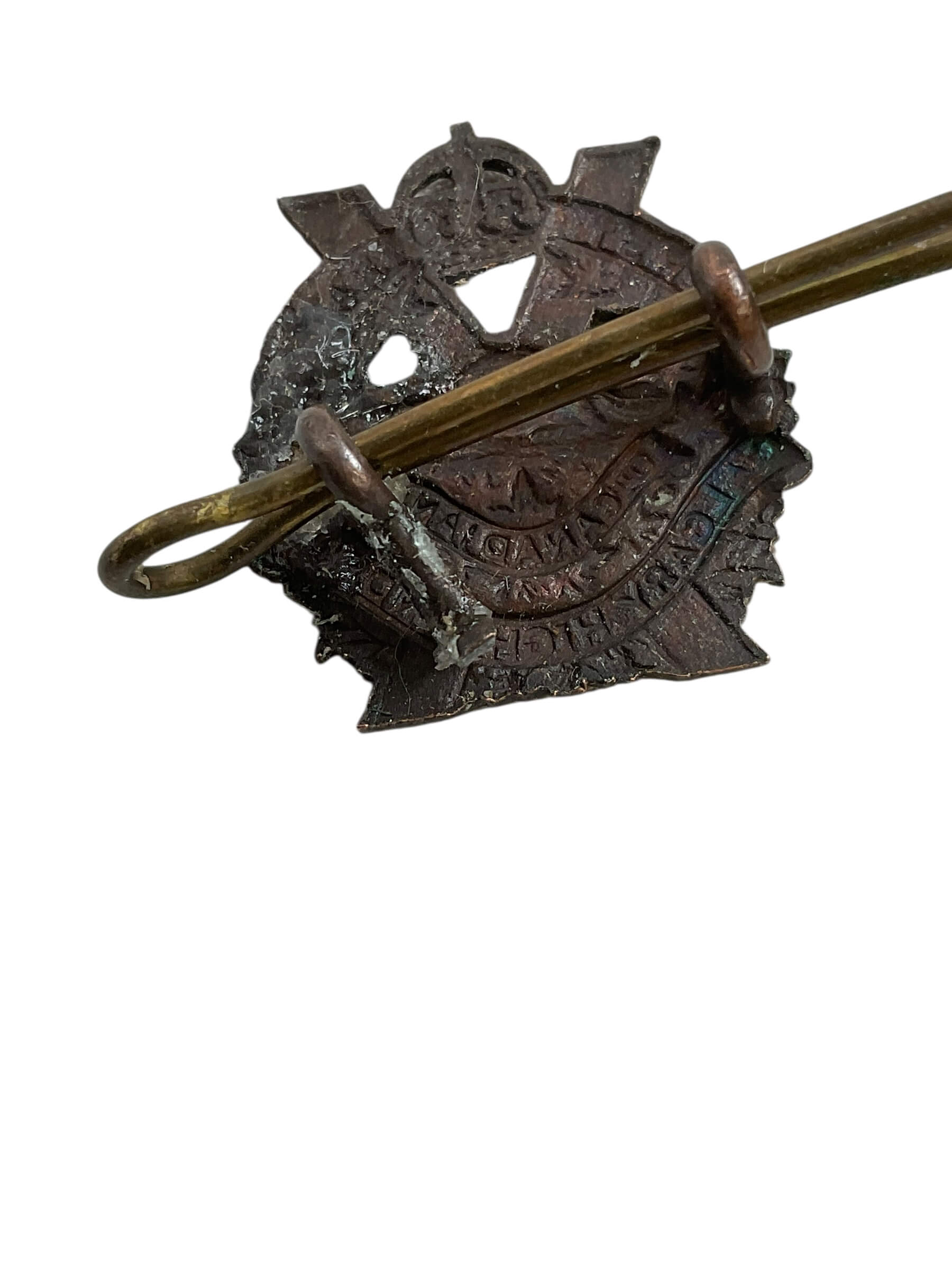 This is a pair of WWII Canadian Calgary Highlanders collar insignias, a unique piece of military memorabilia. These metallic badges were worn by the Highlanders, a distinguished infantry regiment based in Calgary, during the Second World War. Each insignia showcases the distinct emblem of the Calgary Highlanders, featuring the stag’s head and the motto ‘Onward’. They were designed to be attached to the collar of the soldier’s uniform, representing their allegiance and their unit. These badges are not only historical artifacts but also works of art, reflecting the meticulous craftsmanship of the era. They are an ideal collectible item for history enthusiasts, especially those interested in military history and insignia. Their age and place in world history make them a significant keepsake for any collector.