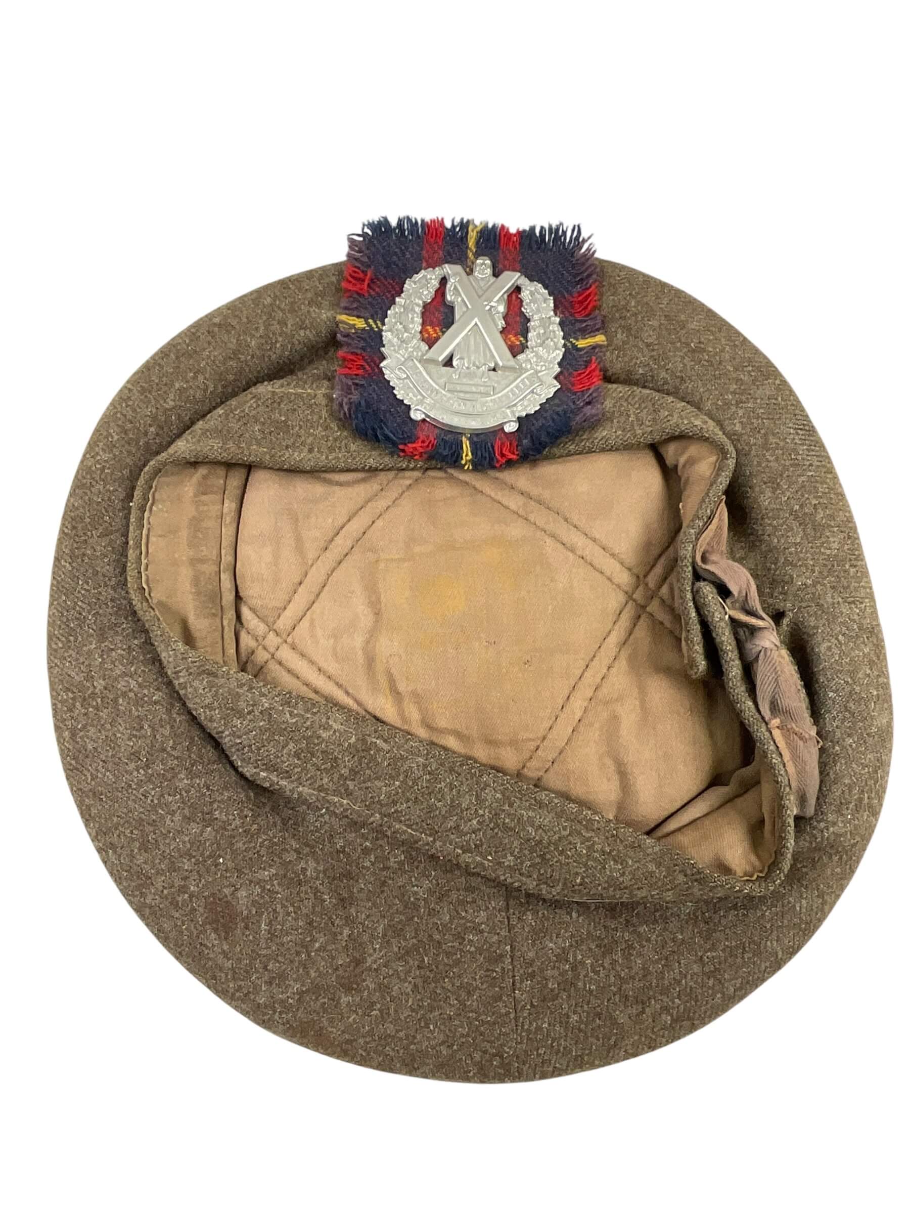 The WW2 Canadian Cameron Highlanders of Ottawa Balmoral TOS (Tam O’Shanter) is a traditional military headdress worn by members of this distinguished Canadian regiment during the Second World War. This example is sized 6 7/8 and follows the standard pattern used throughout the conflict. Constructed of khaki wool serge, the cap features a broad, flat crown and stitched cotton headband. Characteristic features include the toorie—a small woolen pompom—stitched at the center of the crown, and a sewn eyelet ventilation system. The interior is lined for comfort and durability. Regimental badges or insignia, not included with this item, would typically be attached to the front. The Cameron Highlanders of Ottawa were an active infantry regiment engaged in domestic and overseas service during WW2. A Balmoral like this would have formed part of the uniform for parade, garrison, and field use by Canadian military personnel attached to this unit.