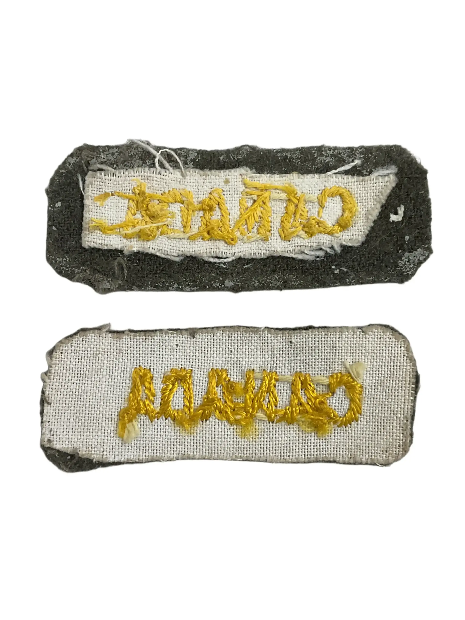 The WW2 Canadian CANADA British Made Shoulder Titles Insignia Pair consists of two shoulder titles manufactured in the United Kingdom for Canadian forces during the Second World War. These embroidered fabric insignia display the word “CANADA” in uppercase letters, typically rendered in red thread on a khaki or olive background, although variations exist. Intended for wear on the upper sleeves of standard-issue battle dress uniforms, these titles identified the wearer as a member of Canadian military units serving overseas, particularly in the European theatre. British-made examples were produced to satisfy wartime demand and often feature fine embroidery and distinctive materials compared to Canadian-made counterparts. Shoulder titles like these played a key role in military identification, contributing to unit cohesion and administrative organization during WW2. The pair offered here represents a standard issue insignia type used by Canadian personnel throughout the conflict.