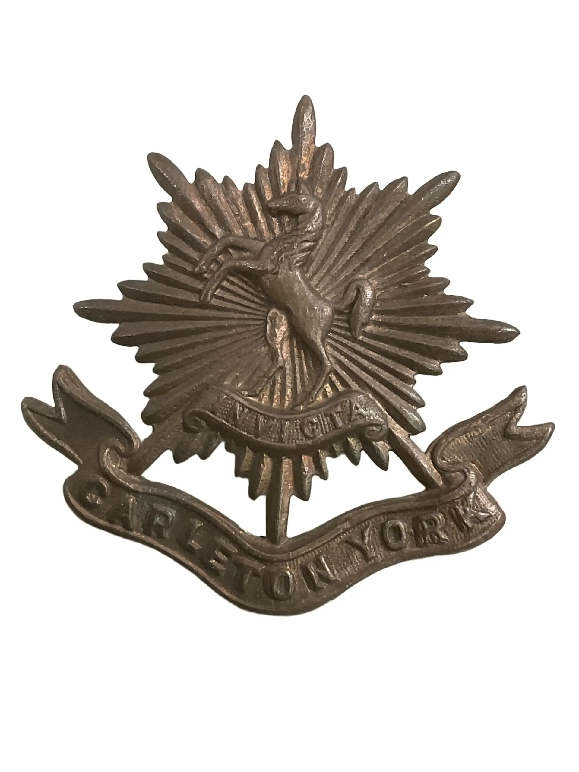 The WW2 Canadian Carleton and York Cap Badge is a military insignia issued during the Second World War for the Carleton and York Regiment, a unit of the Canadian Army. The badge is typically made of brass or a similar metal and features a crowned wreath surrounding a central shield. The shield contains the regimental motto and emblem, with scrolls bearing the inscription “Carleton and York.” This design reflects the regiment’s heritage, representing its origins in the Carleton Light Infantry and the York Regiment, both of which were part of the Non-Permanent Active Militia. The cap badge was worn by soldiers on the front of their service caps as part of their standard uniform. The Carleton and York Regiment served primarily in the Italian Campaign and Northwest Europe during World War II. Cap badges like this one are valued as original artifacts of Canadian military history and provide insight into regimental identity and tradition.