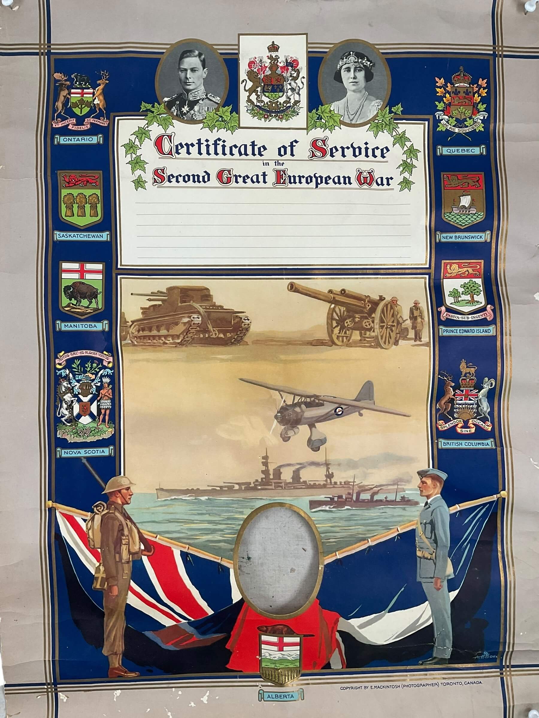 The WW2 Canadian Certificate of Service Scroll Unissued is an official military document from World War II. Notably, it is unissued, retaining its original condition. This document was bestowed upon Canadian service members at the end of their military service, noting key information such as rank and service duration.