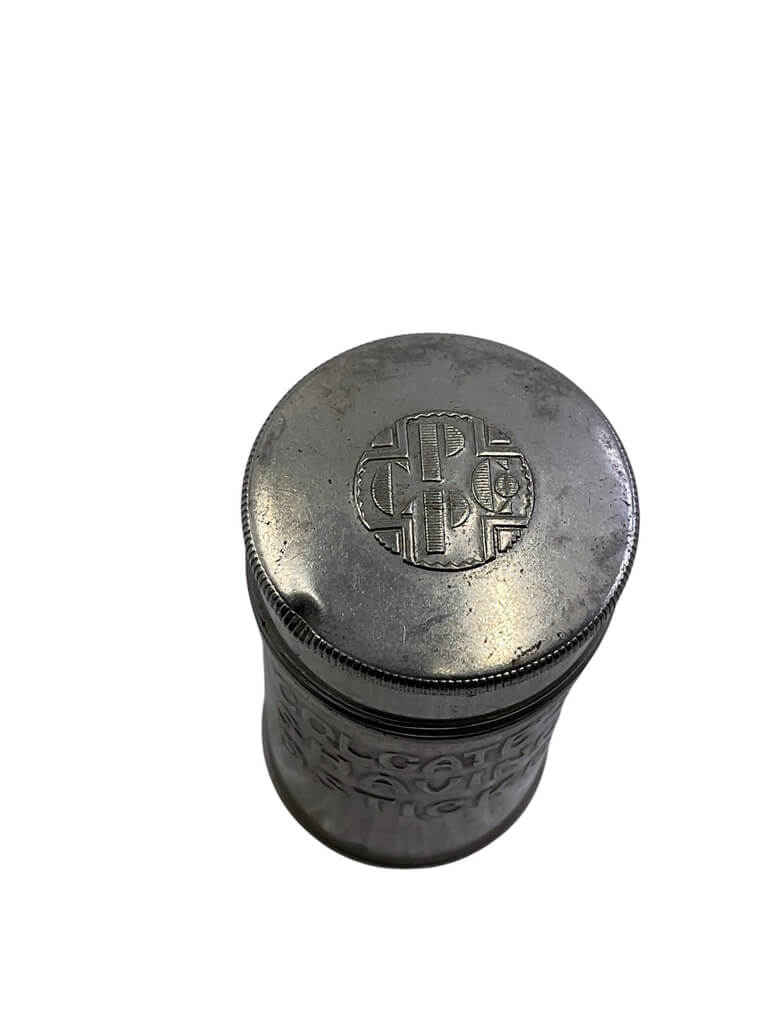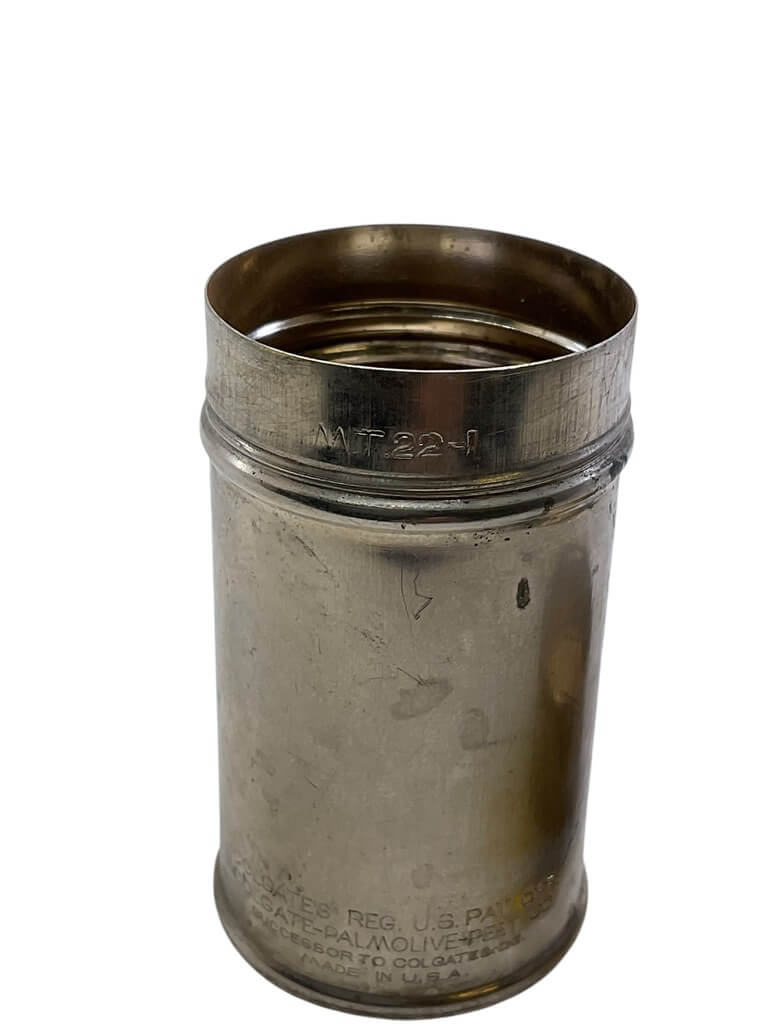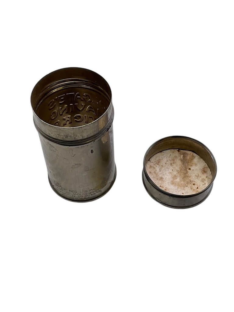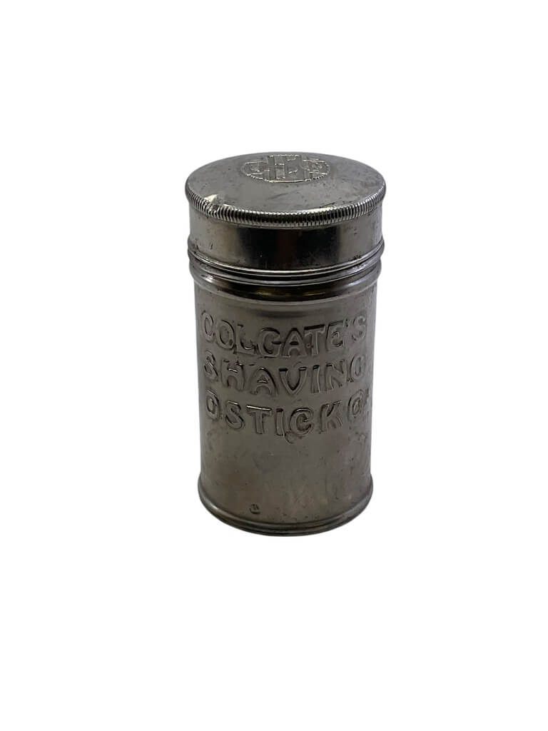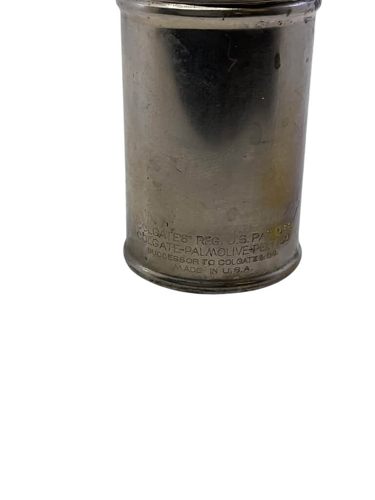 This item is a vintage WW2 Canadian Colgate’s Shaving Stick Tin, now EMPTY. This rustic tin can, originally containing a Colgate shaving stick, served Canadian soldiers during the World War II era. The tin exhibits a distinct, military green color, and despite its age, the Colgate logo and other relevant information are still visible, evoking a sense of nostalgia. It’s a remarkable artifact showing the intersection of personal grooming and military life in the 1940s. The tin is empty, but it remains a rare collectible, reflecting a bygone era and the daily life of a soldier in the war years. It’s an excellent addition to a collection of military memorabilia, vintage tins, or World War II artifacts. The tin displays a patina commensurate with its age and history, but it’s in good overall condition, adding a rich piece of history to any collection.